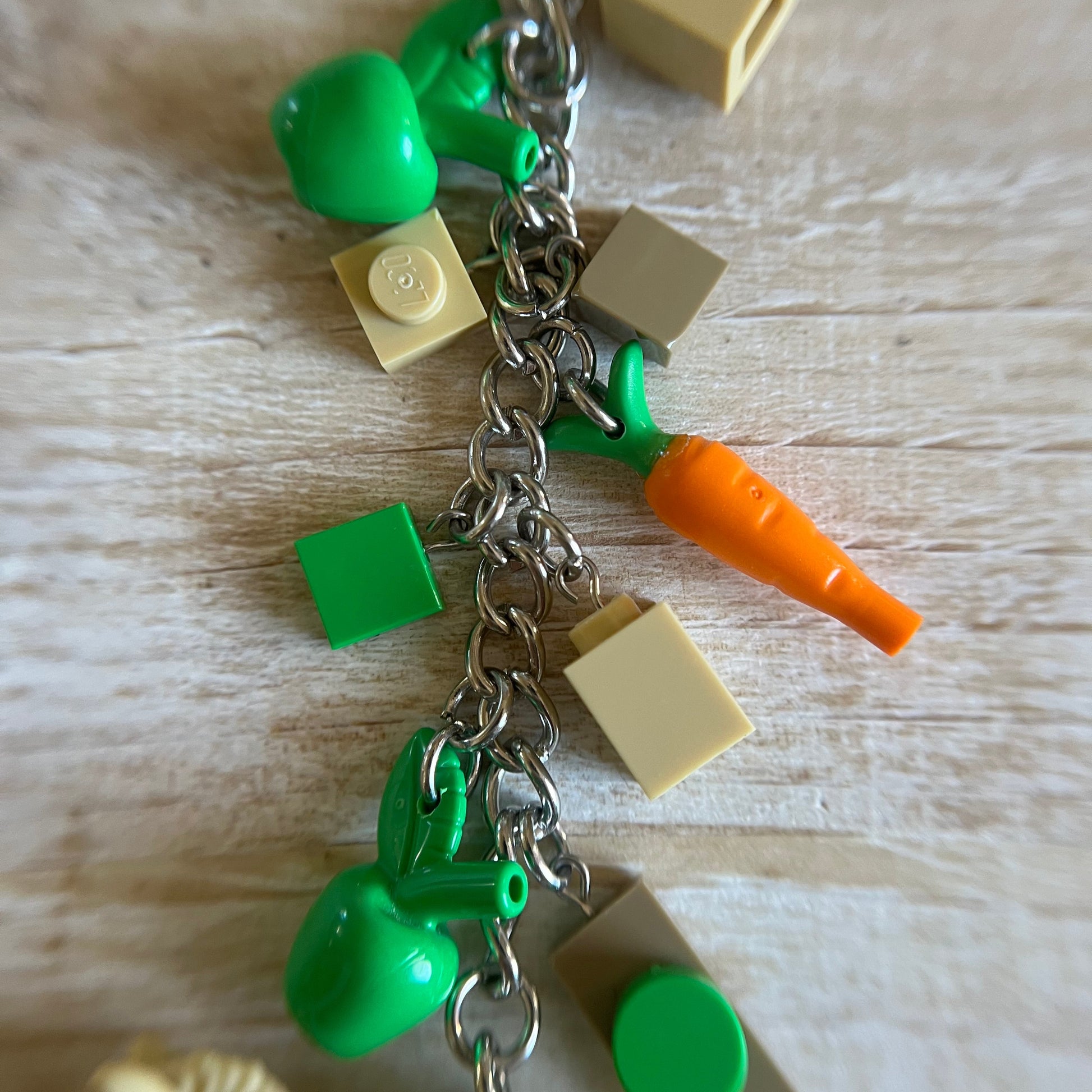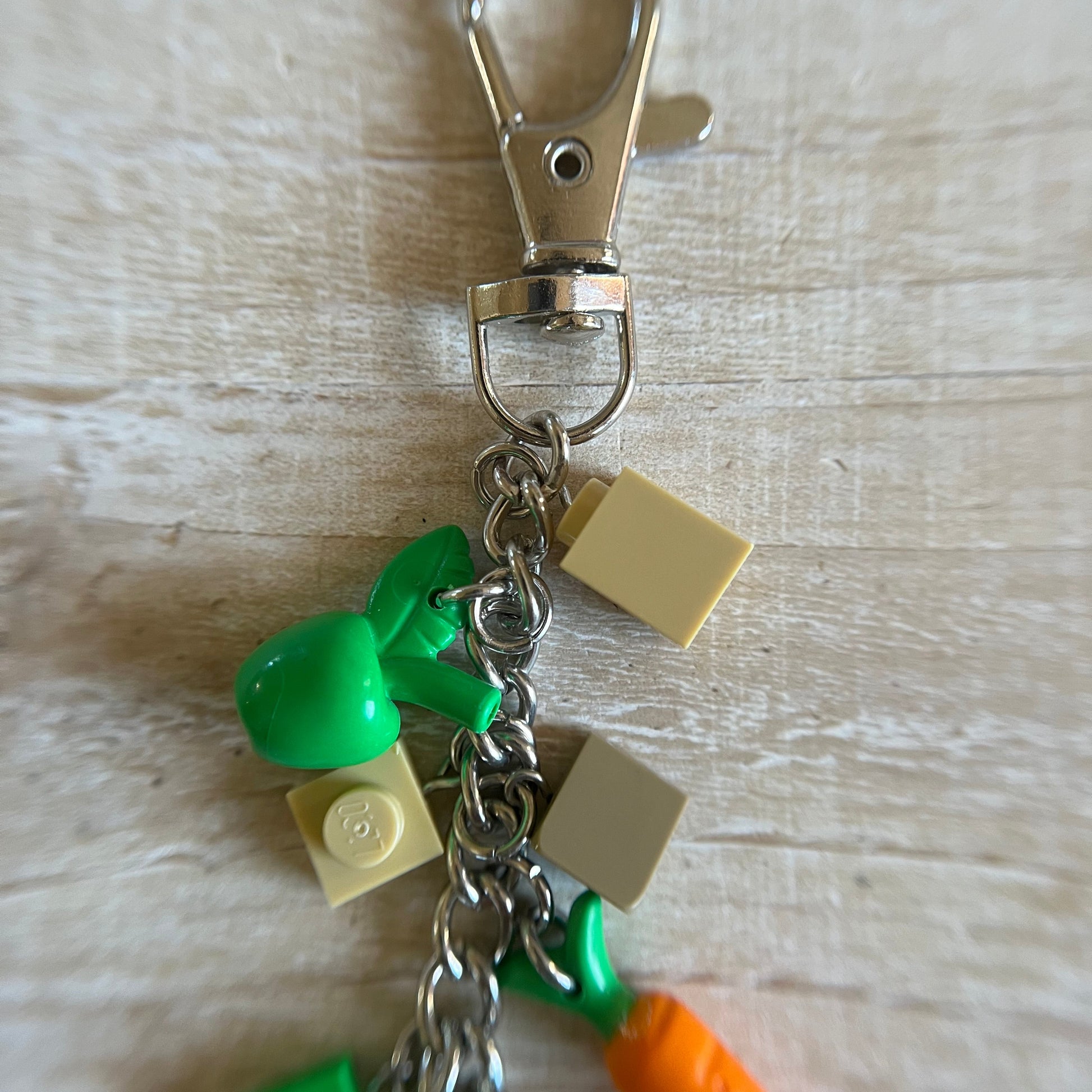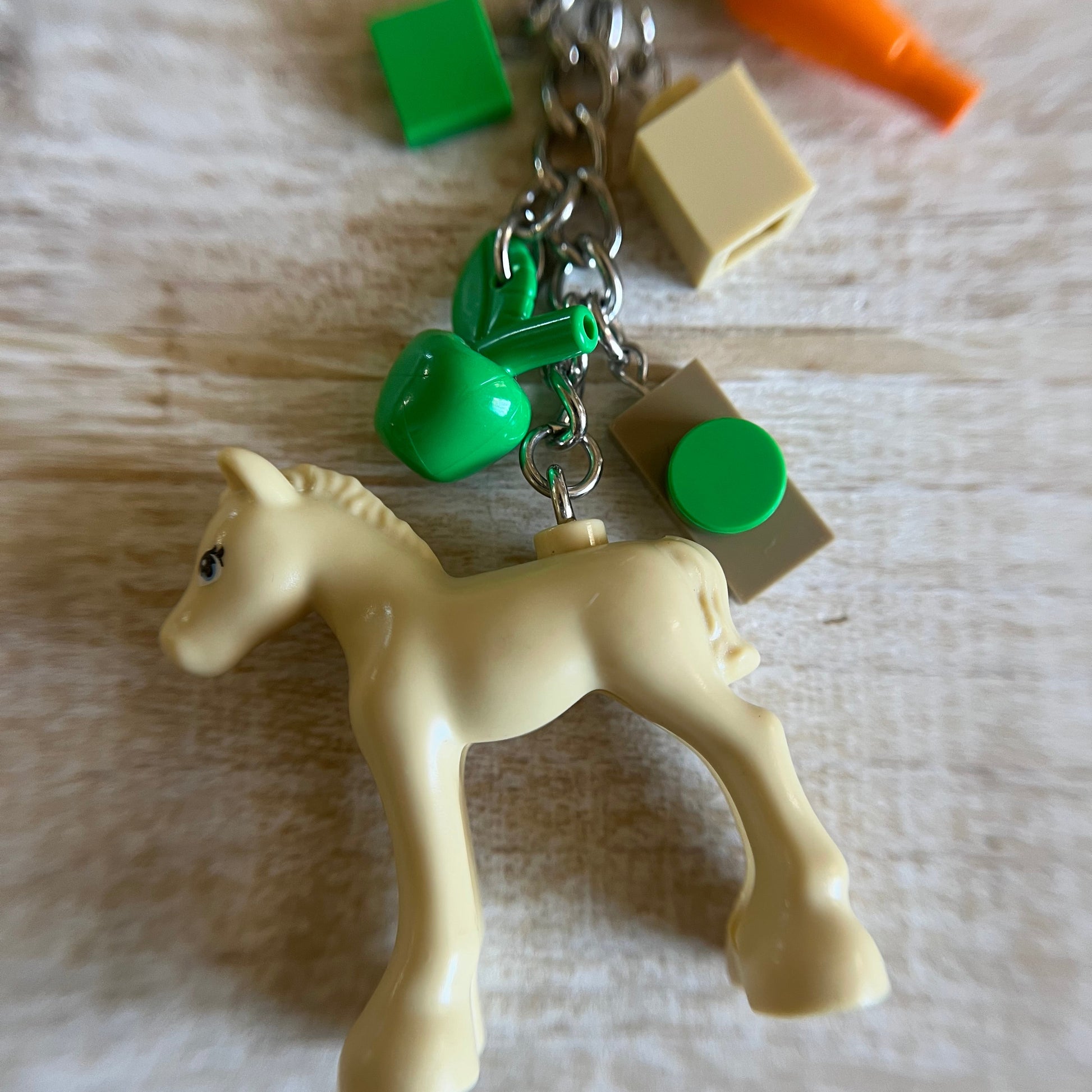 Lobster clasp keychain with a LEGO baby horse attached as the focal point. Additional LEGO components used as charms, including apples, carrots and other bricks.