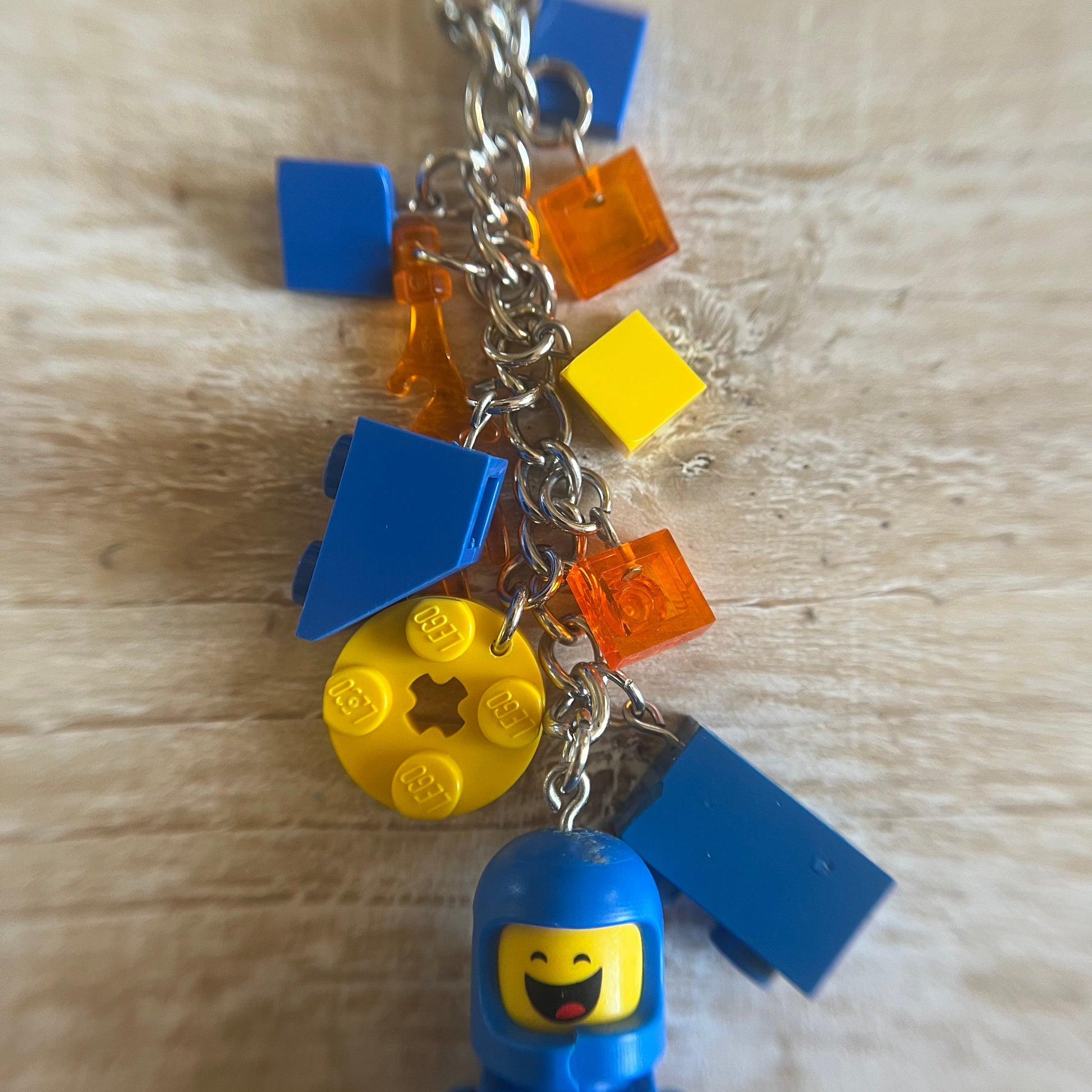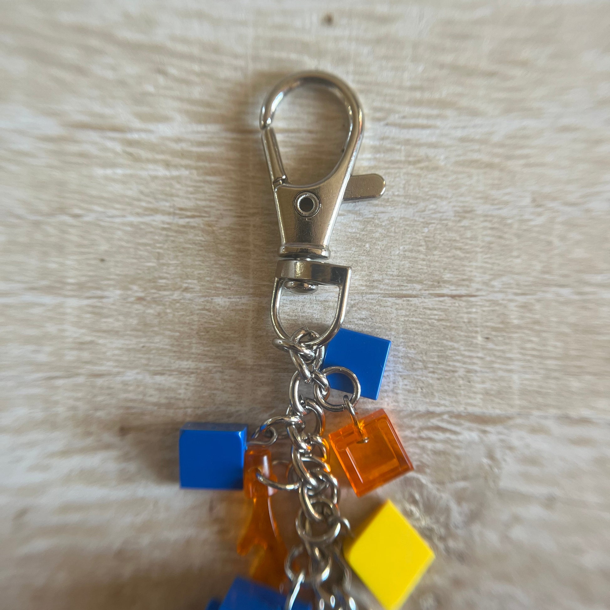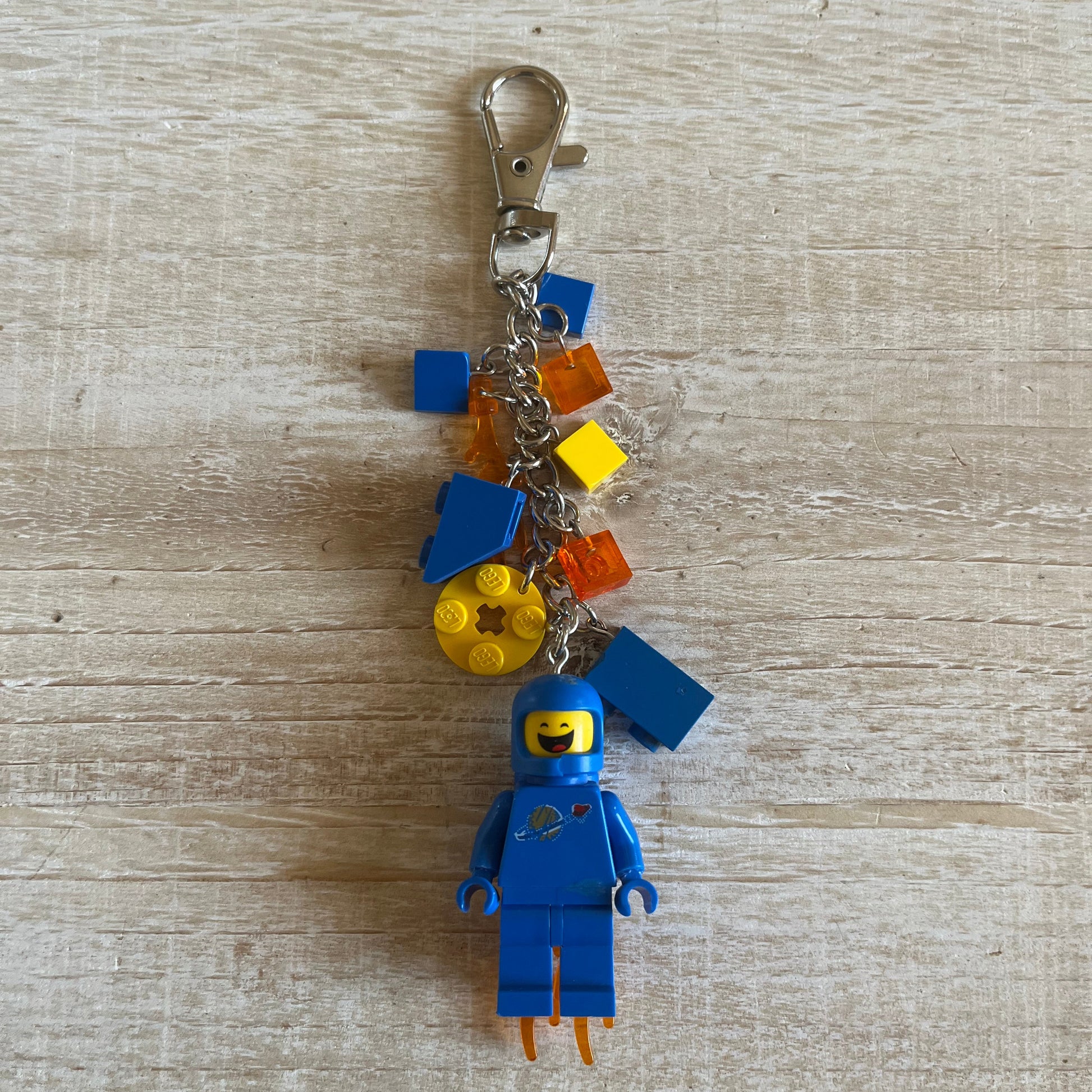 Lobster clasp keychain with a LEGO Benny minifigure attached as the focal point. Additional LEGO components used as charms, including flames and other bricks. All parts of the minifigure are glued.