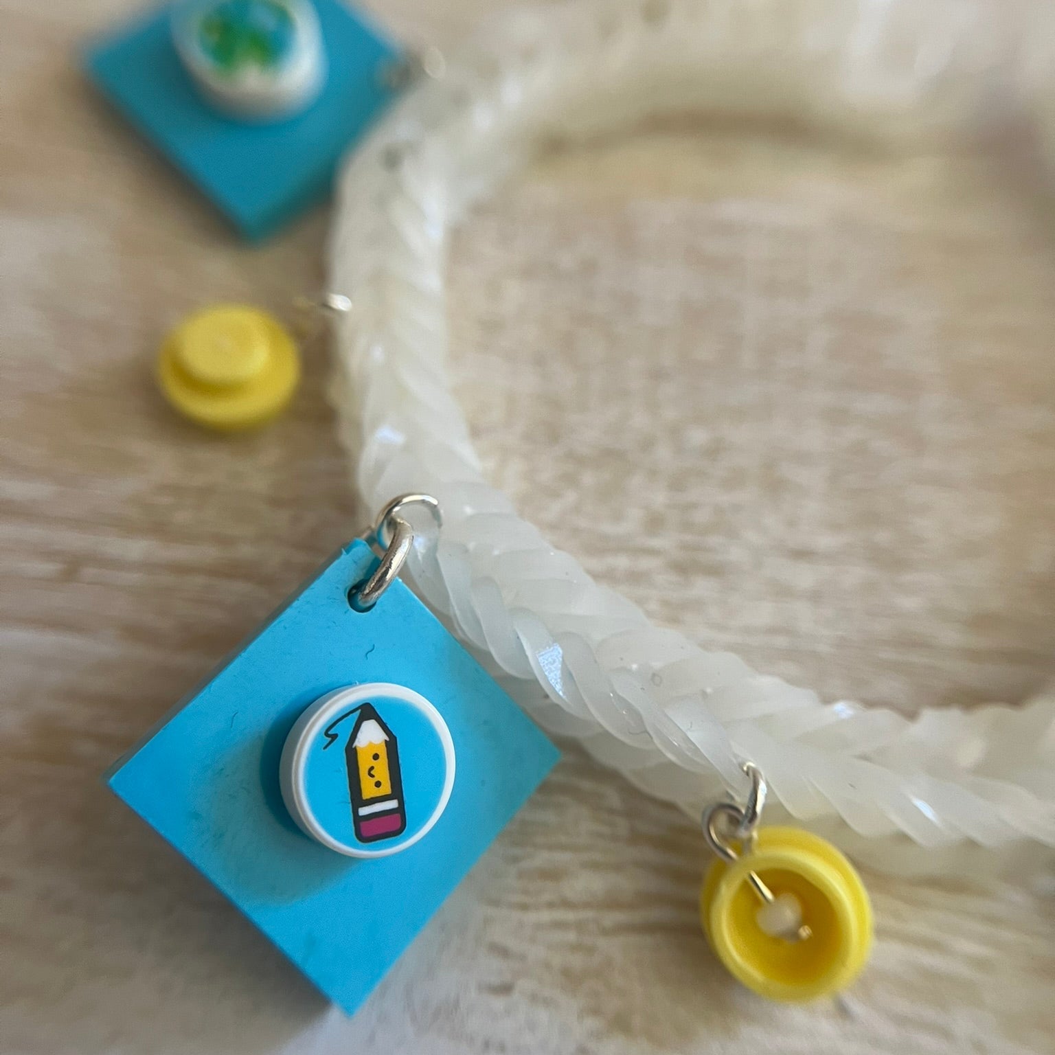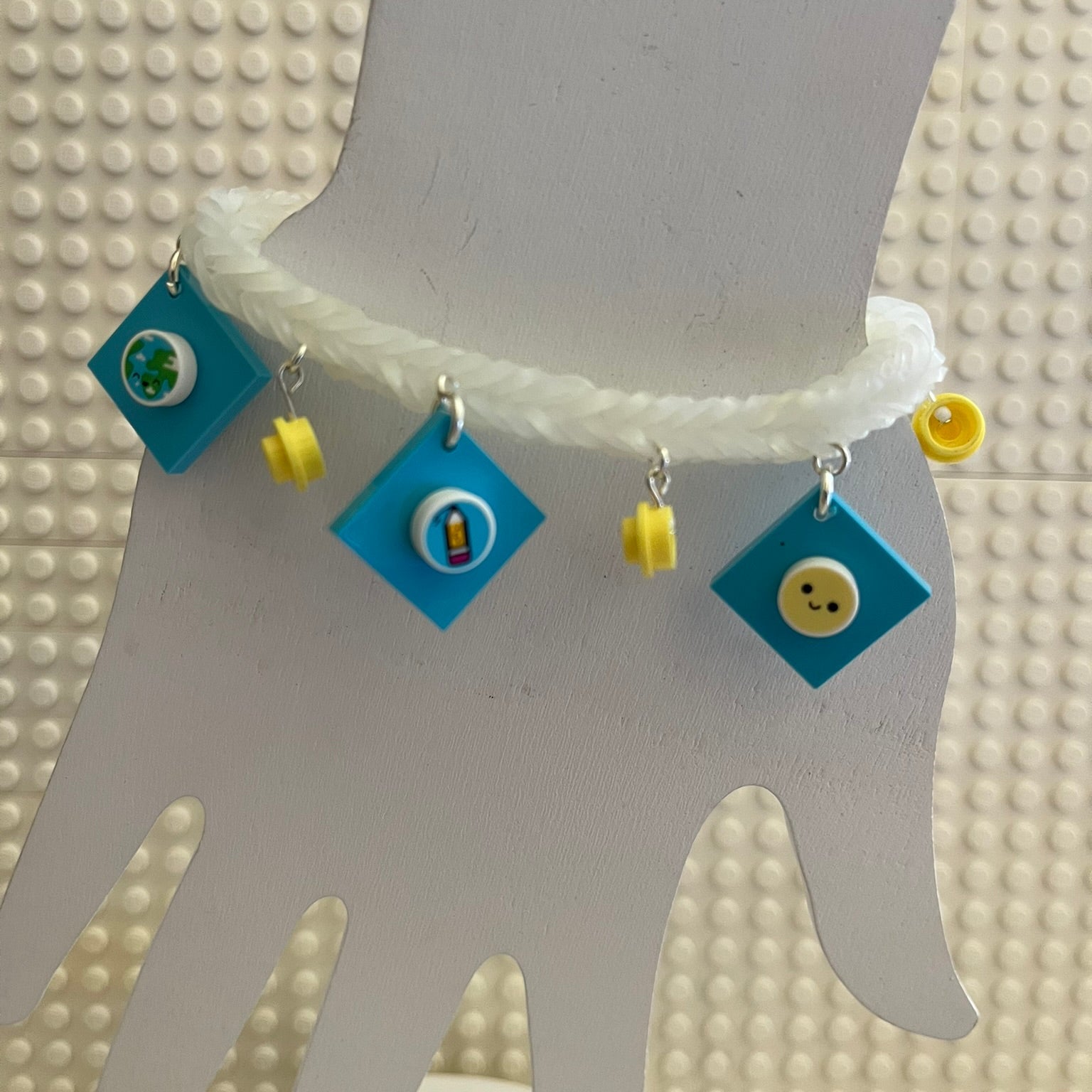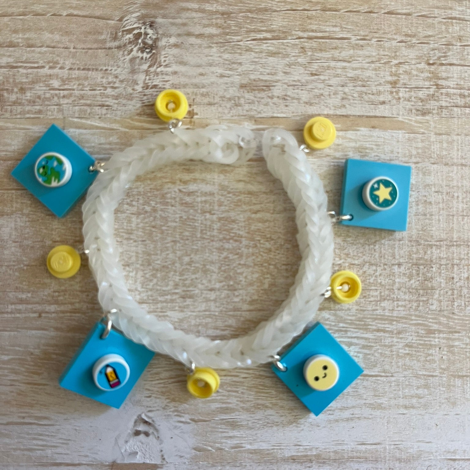 Rubber band bracelet with LEGO® bricks as charms. Fits most adults and children. The decorative LEGO® dots on the charms may differ, but colors and look will stay the same.