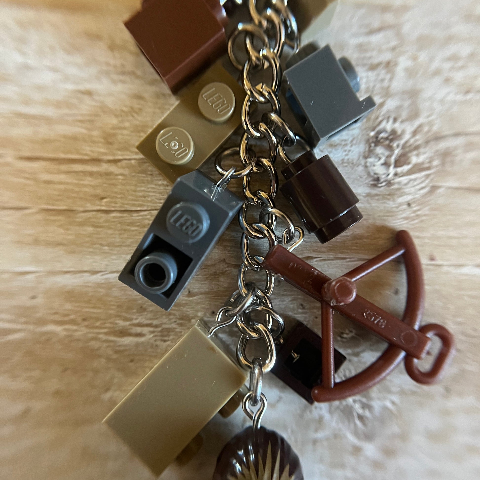 Lobster clasp keychain with a LEGO Star Wars Chewbacca minifigure. Also includes other Lego components as charms. All parts of the minifigure are glued.