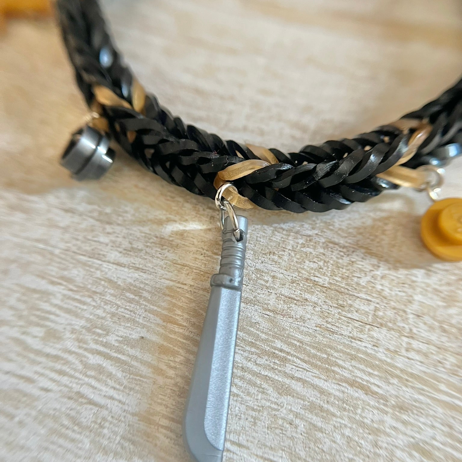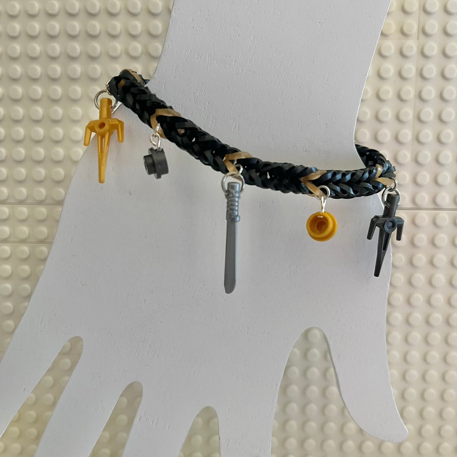 Rubber band bracelet with Lego studs and accessories as charms. Fits most adults and children. Charms may differ slightly, but colors and look will stay the same.