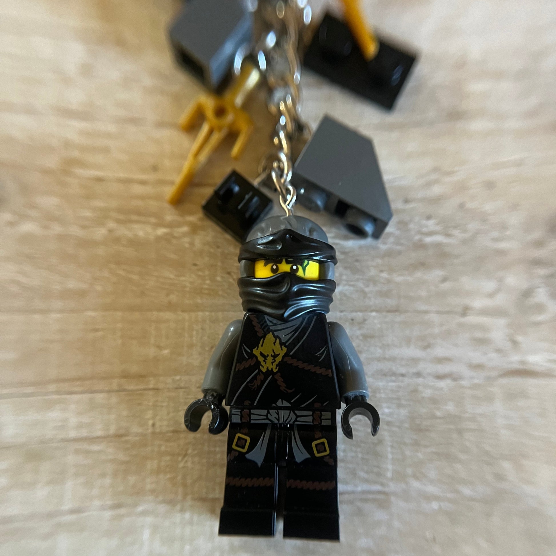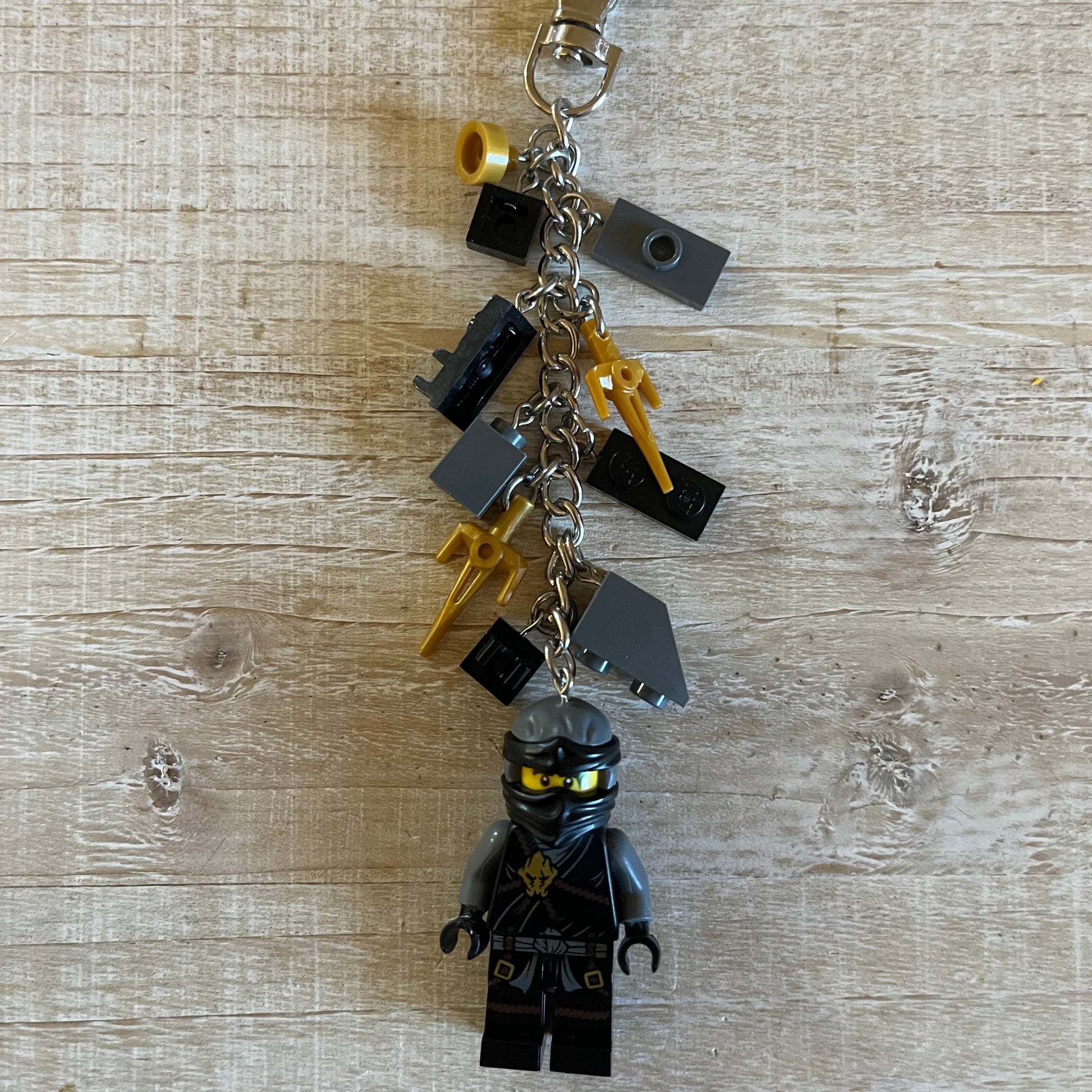Lobster clasp keychain with LEGO Ninjago Cole minifigure. Also includes other Lego components as charms. All parts of the minifigure are glued.