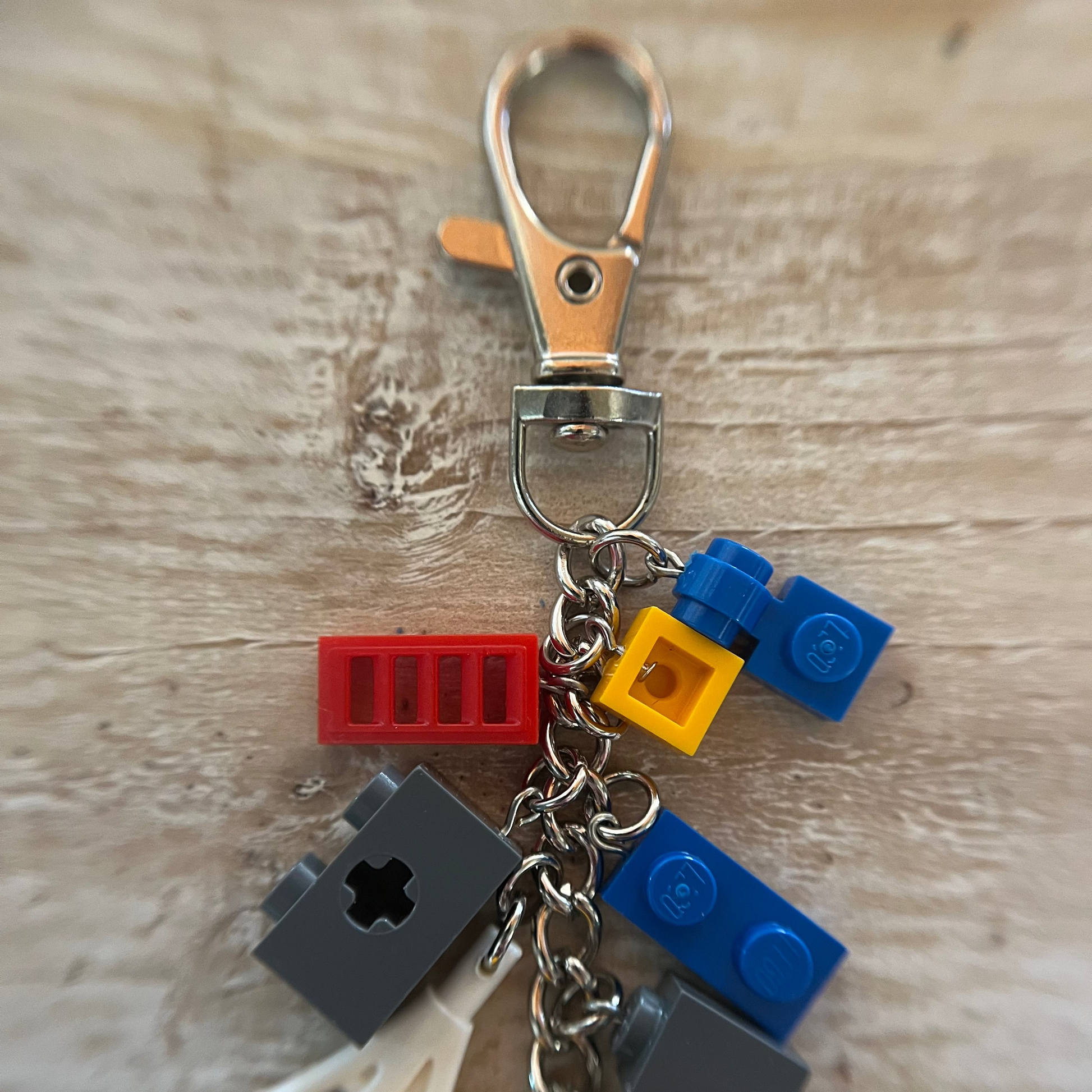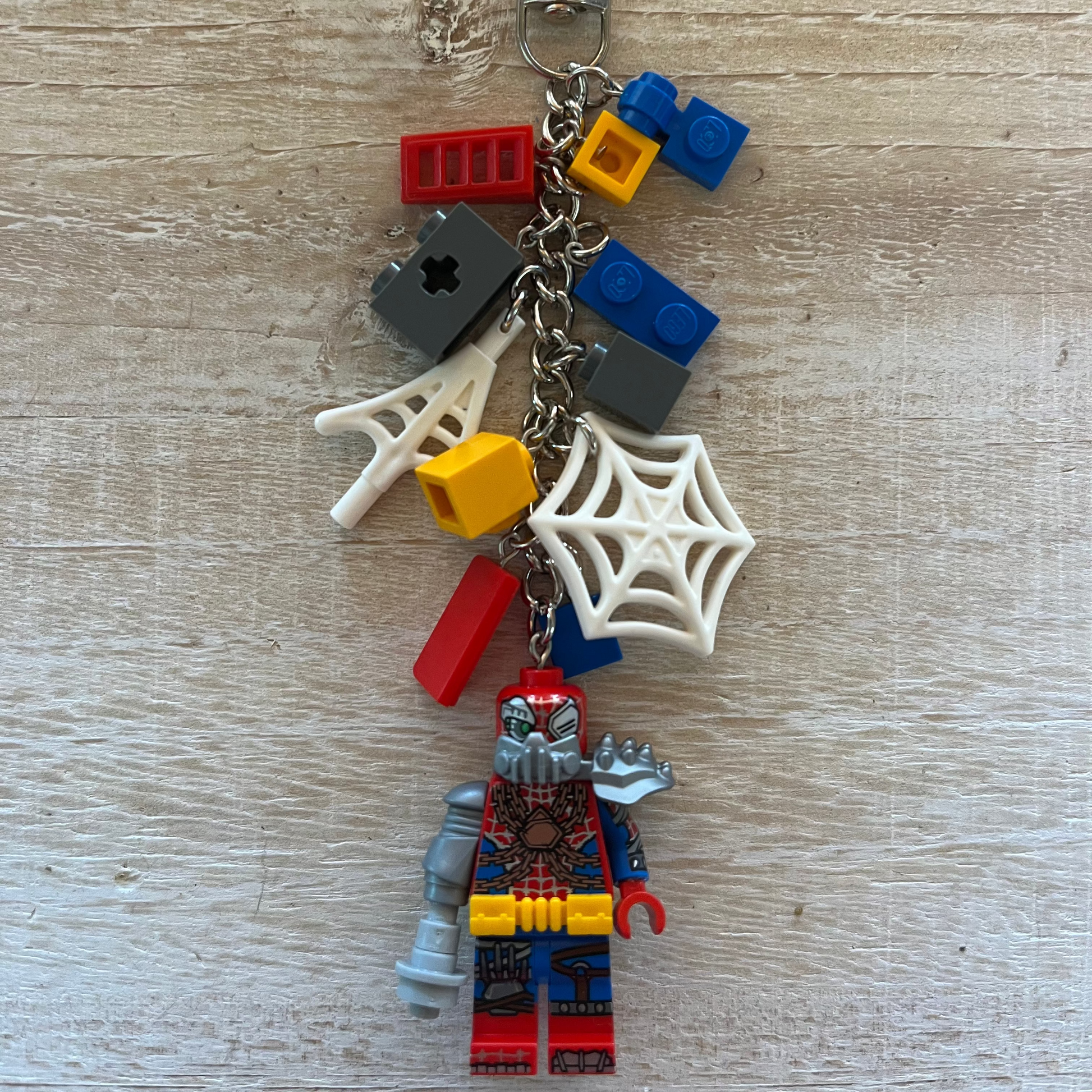 Hook keychain with Spider-Man Across the Spider-Verse, Cyborg Spider-Woman minifigure. Also includes other LEGO components as charms.