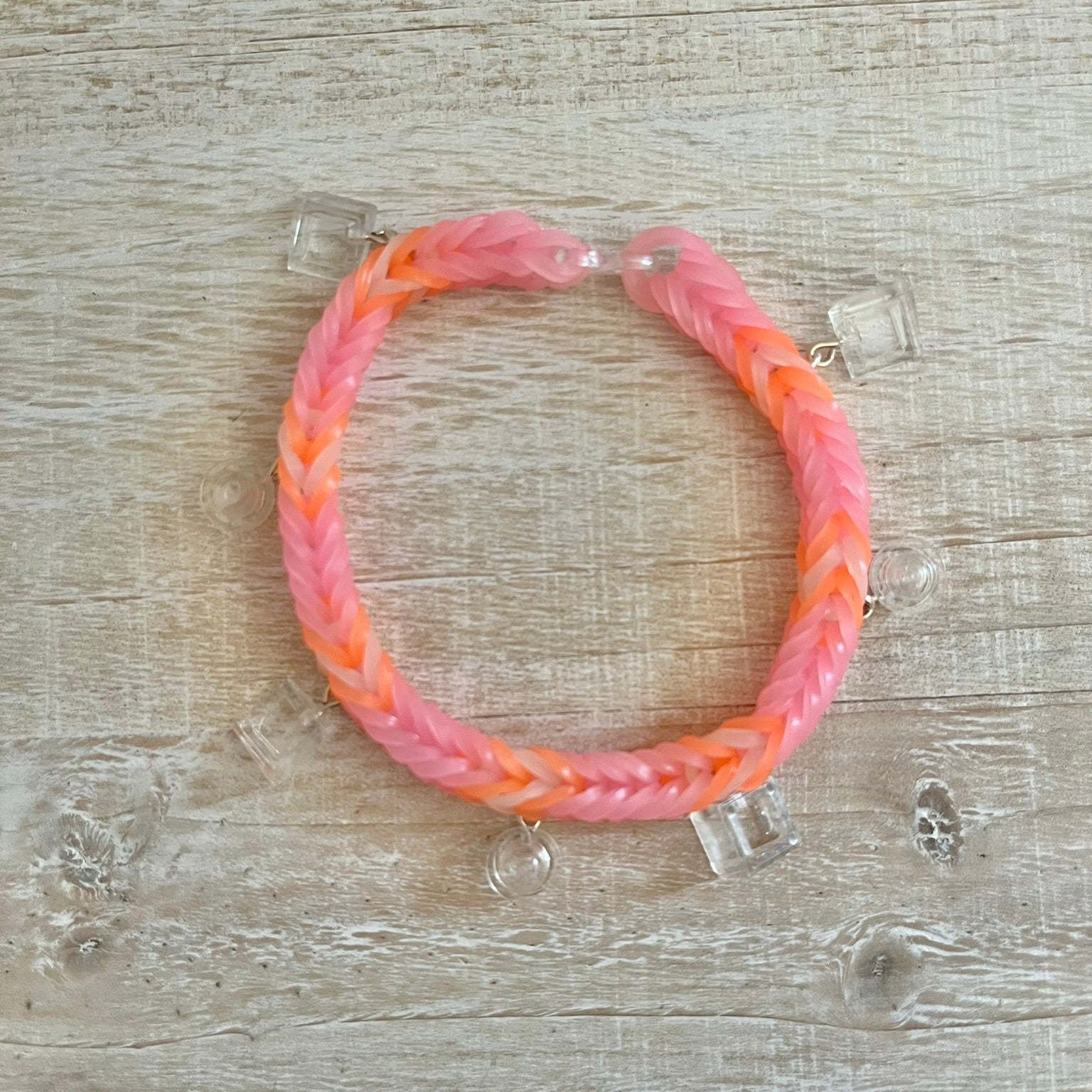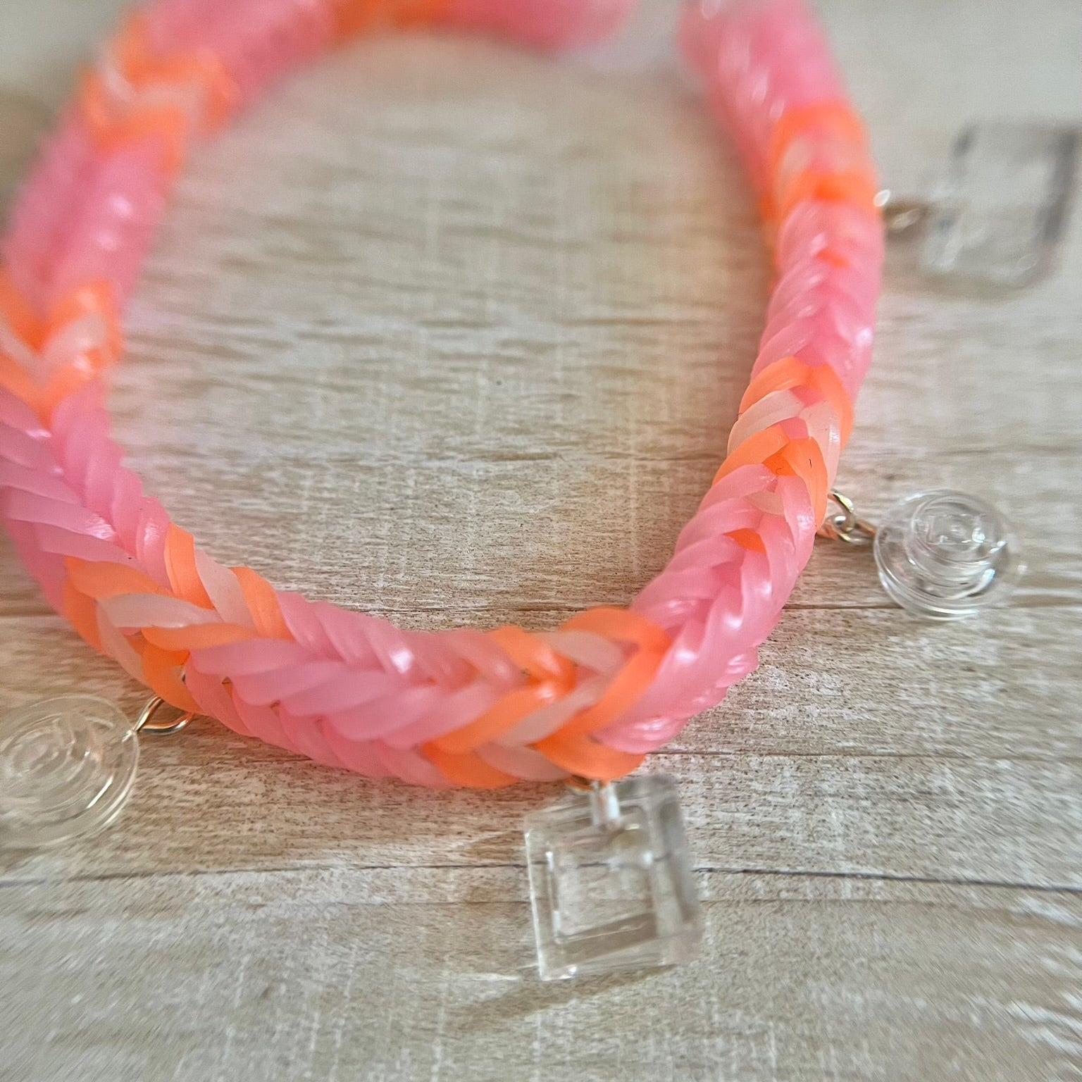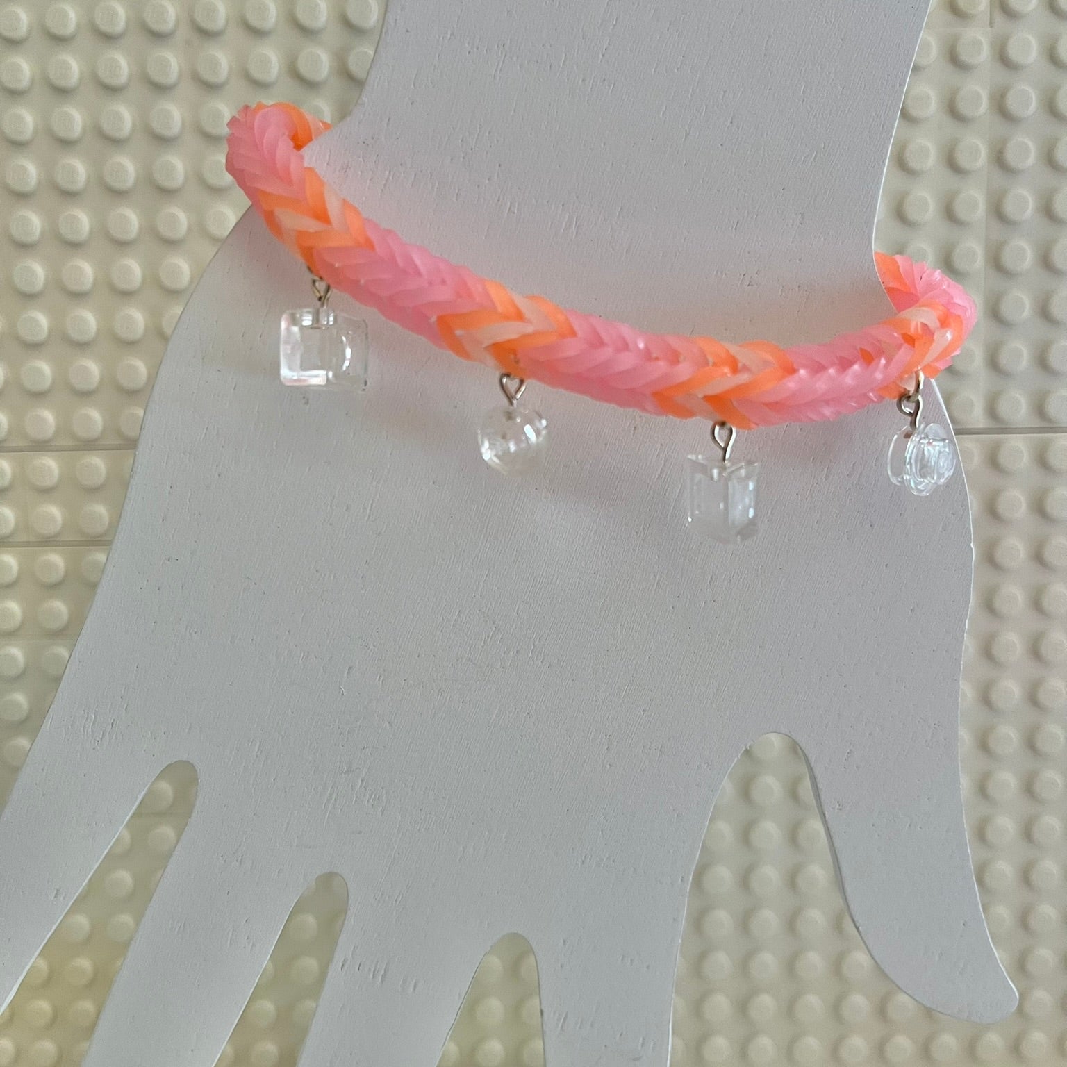 Rubber band bracelet with Lego bricks as charms. Fits most adults and children. Rubber bands glow in the dark. Charms may differ in shape, but color will stay the same.