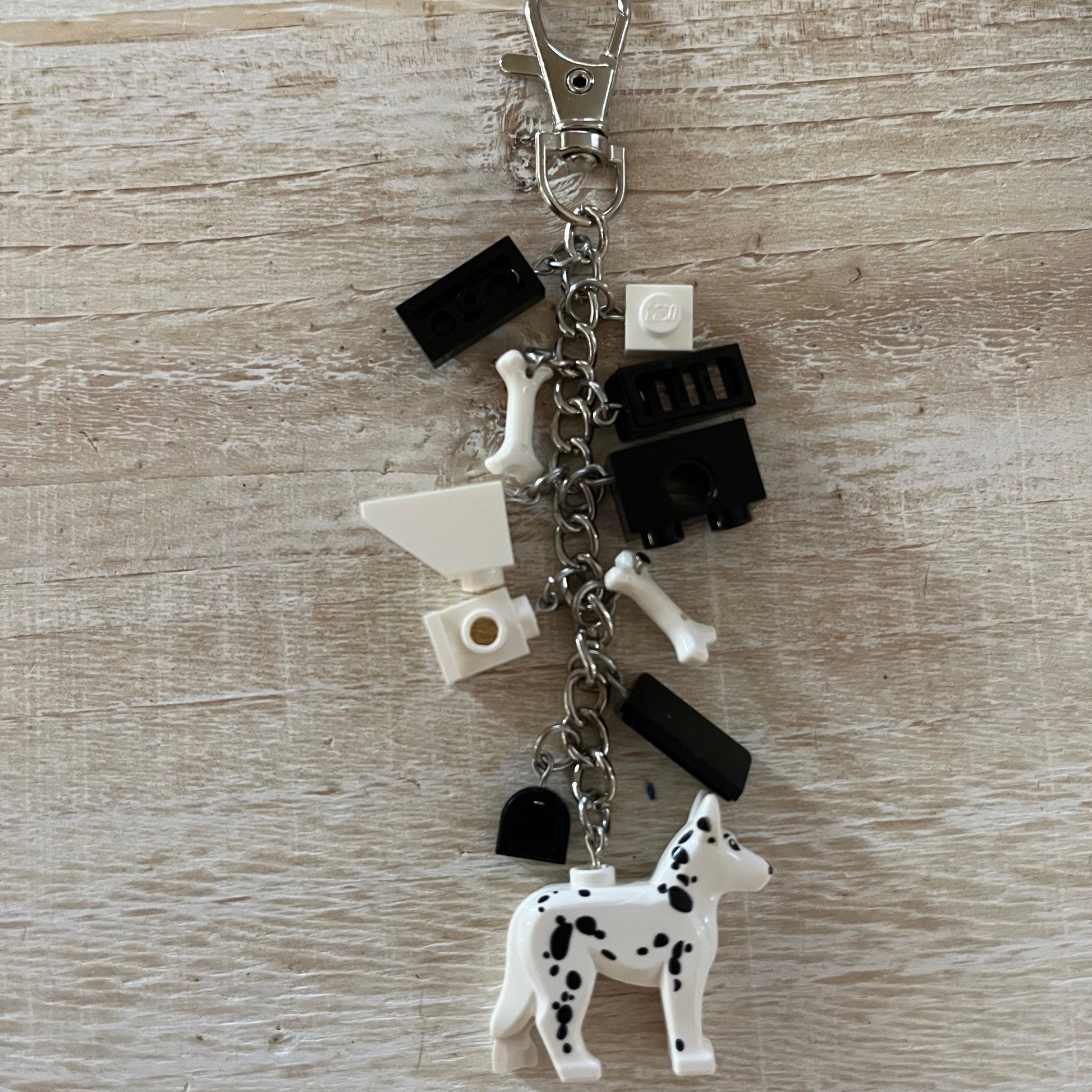 Lobster clasp keychain with a LEGO Dalmatian. Also includes other LEGO components as charms.
