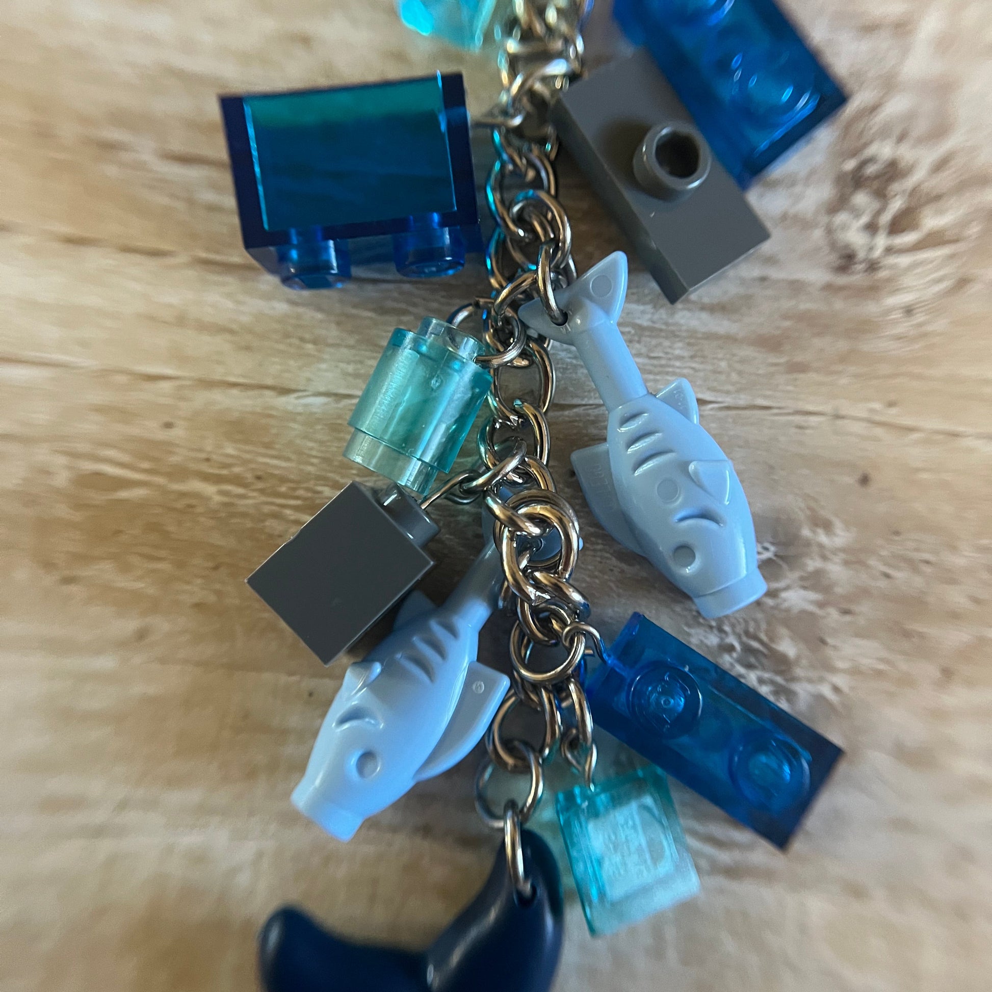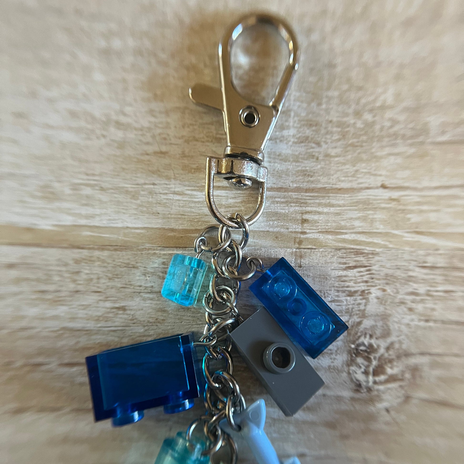 Lobster clasp keychain with a LEGO dark blue dolphin. Also includes other Lego components as charms.