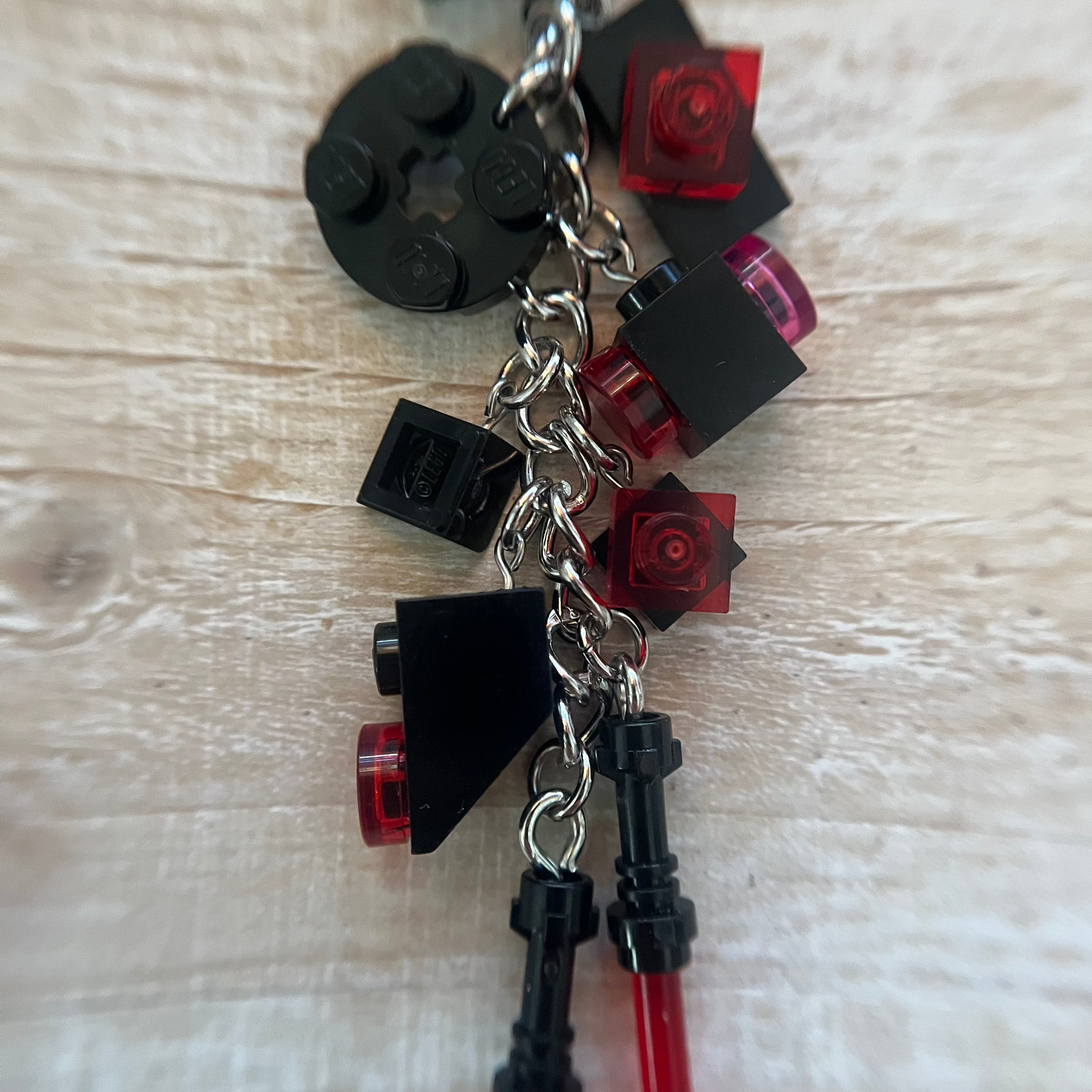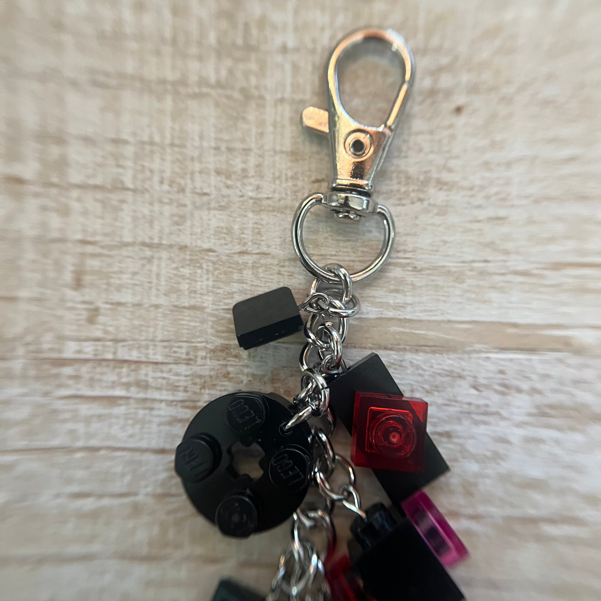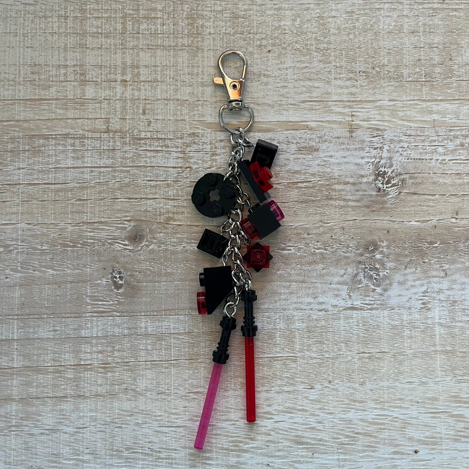 Hook keychain with LEGO components as charms. Two lightsabers are included with the charms.