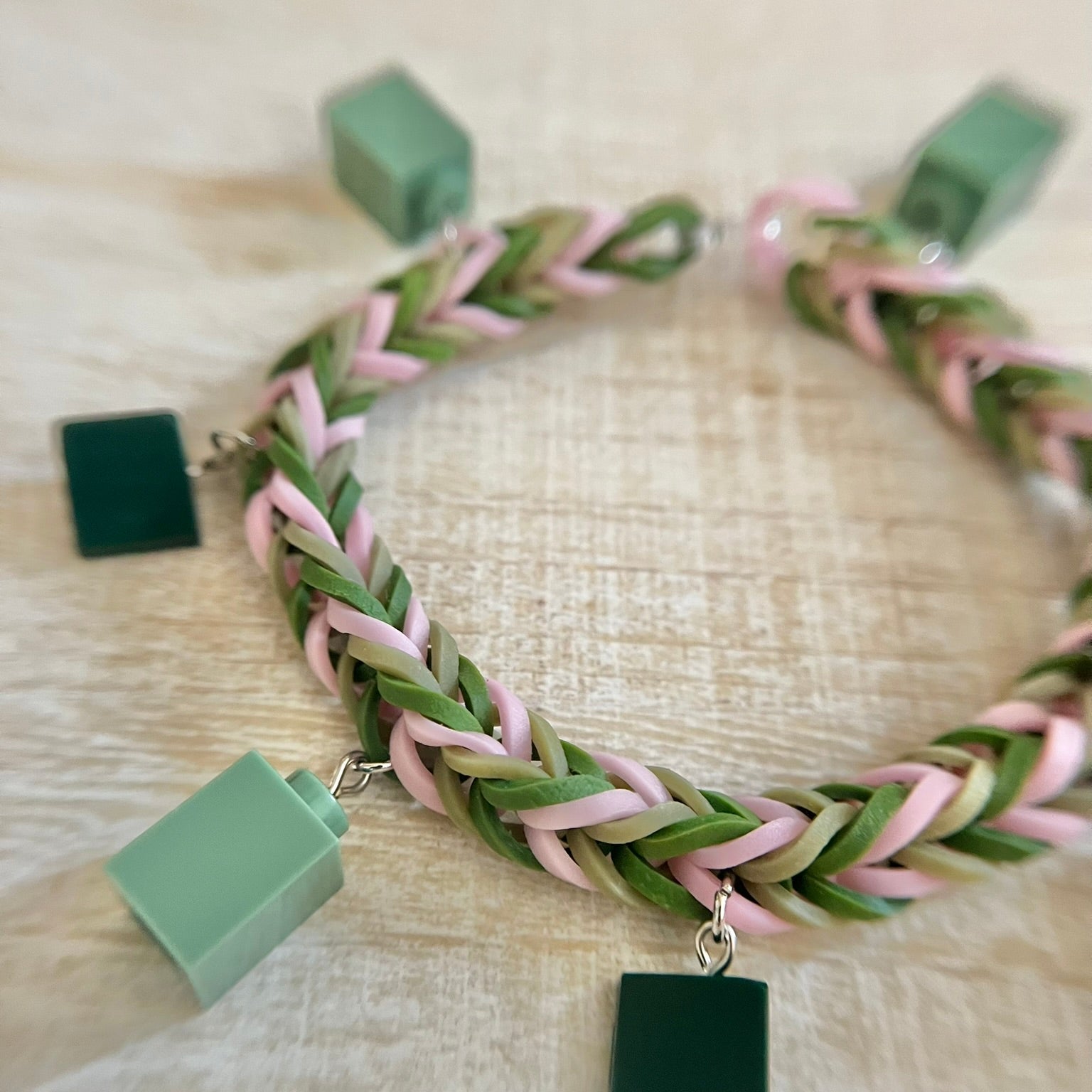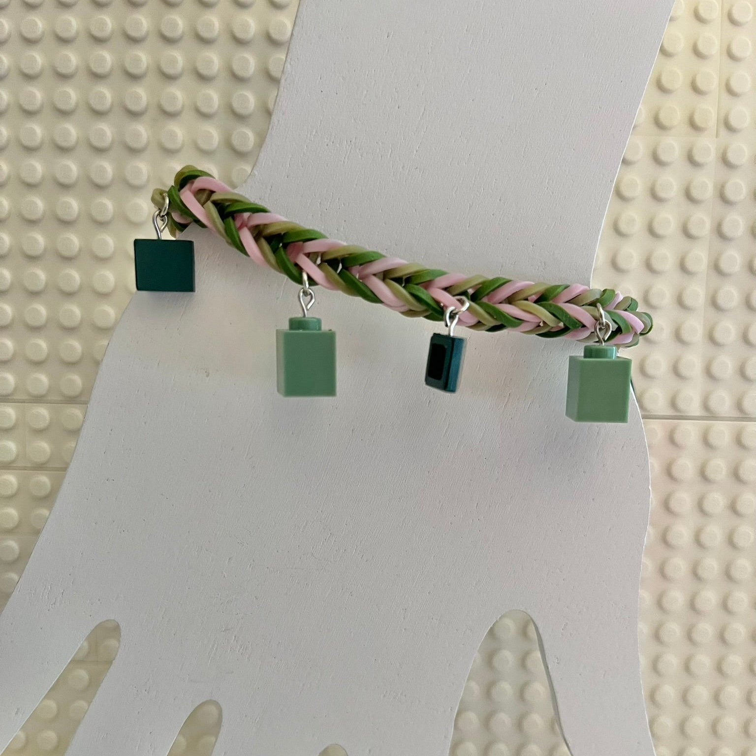 Rubber band bracelet with Lego bricks as charms. Fits most adults and children. Charms may differ slightly in shape, but colors and look will stay the same.