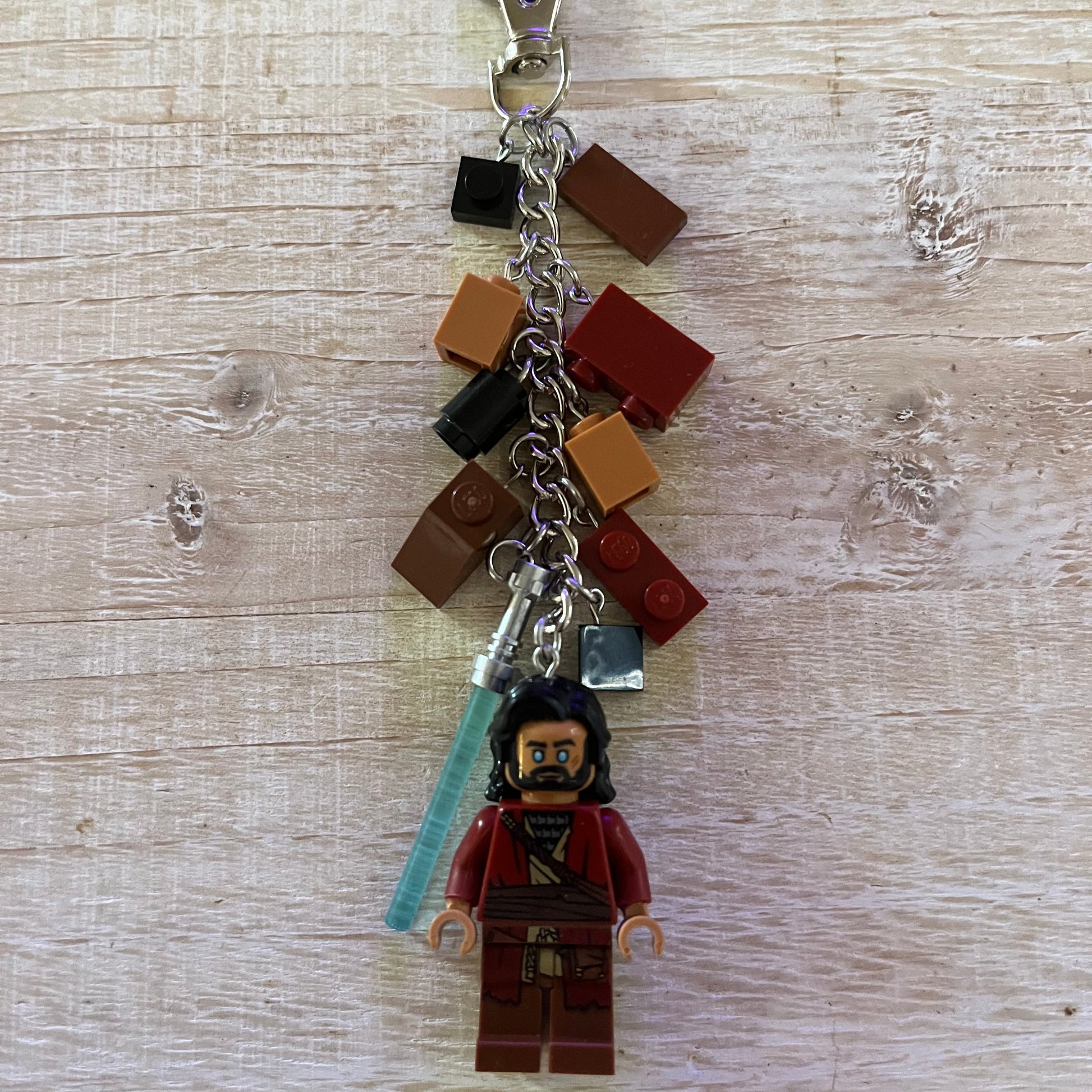 Lobster clasp keychain with a LEGO Star Wars Ahsoka and Rebels Ezra Bridger. Also includes other LEGO components as charms. All parts of the minifigure are glued.
