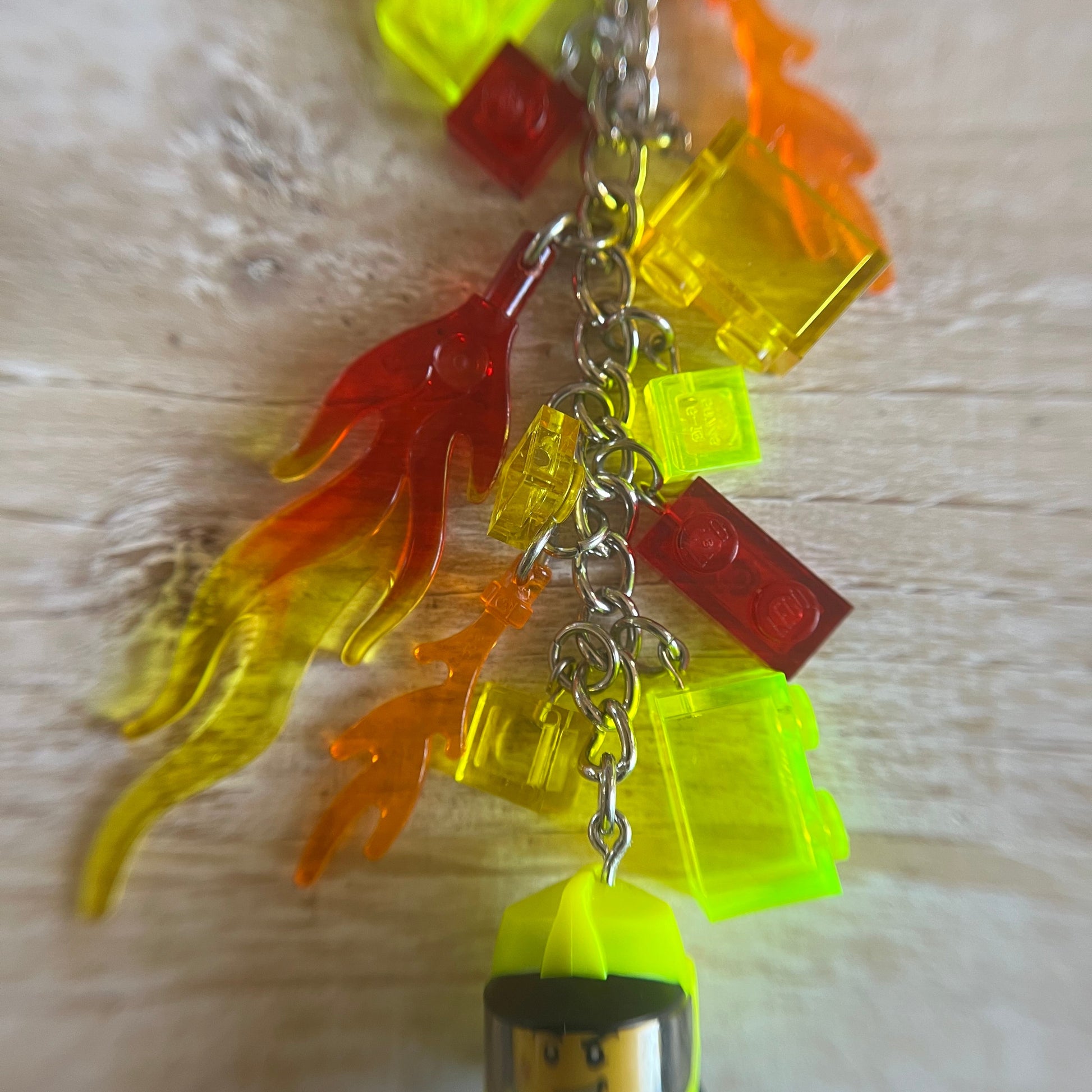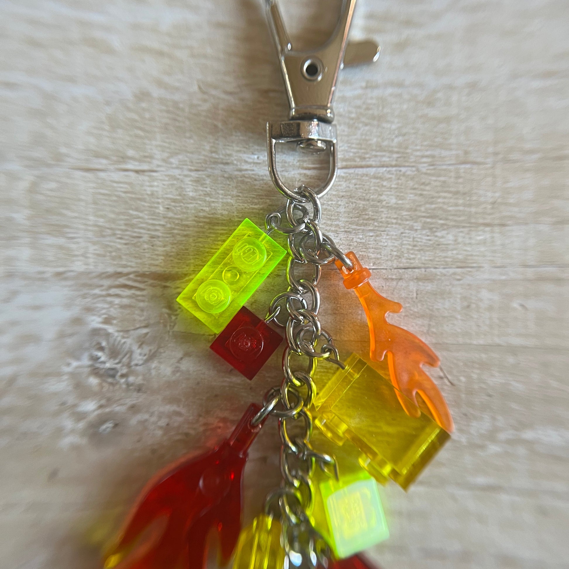Lobster clasp keychain with a LEGO fireman minifigure attached as the focal point. Additional LEGO components used as charms, including flames and other bricks. All parts of the minifigure are glued.