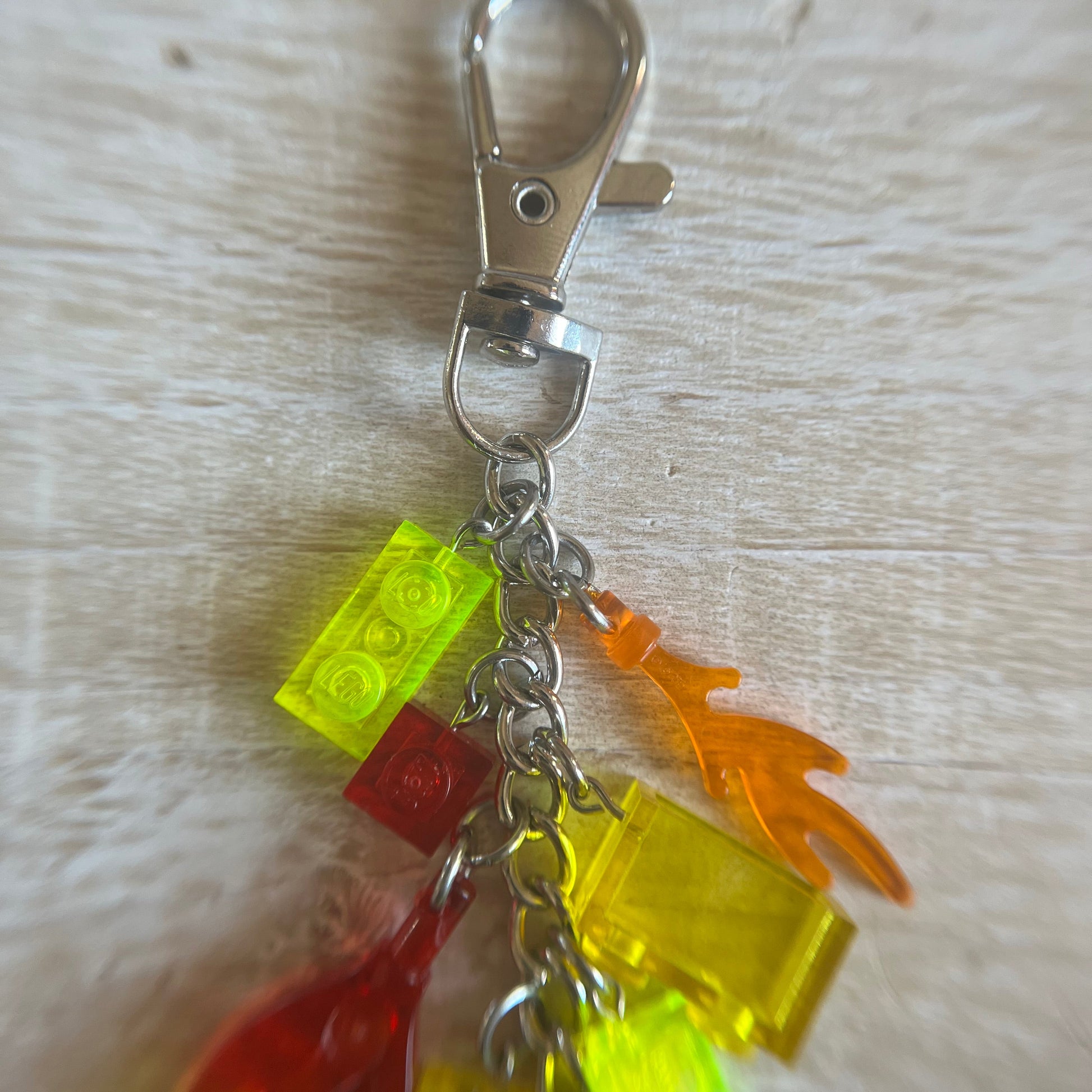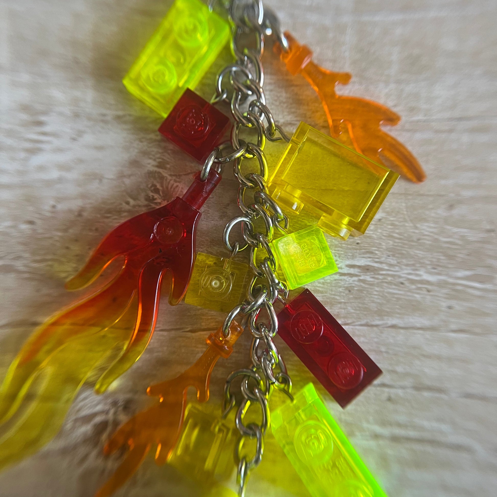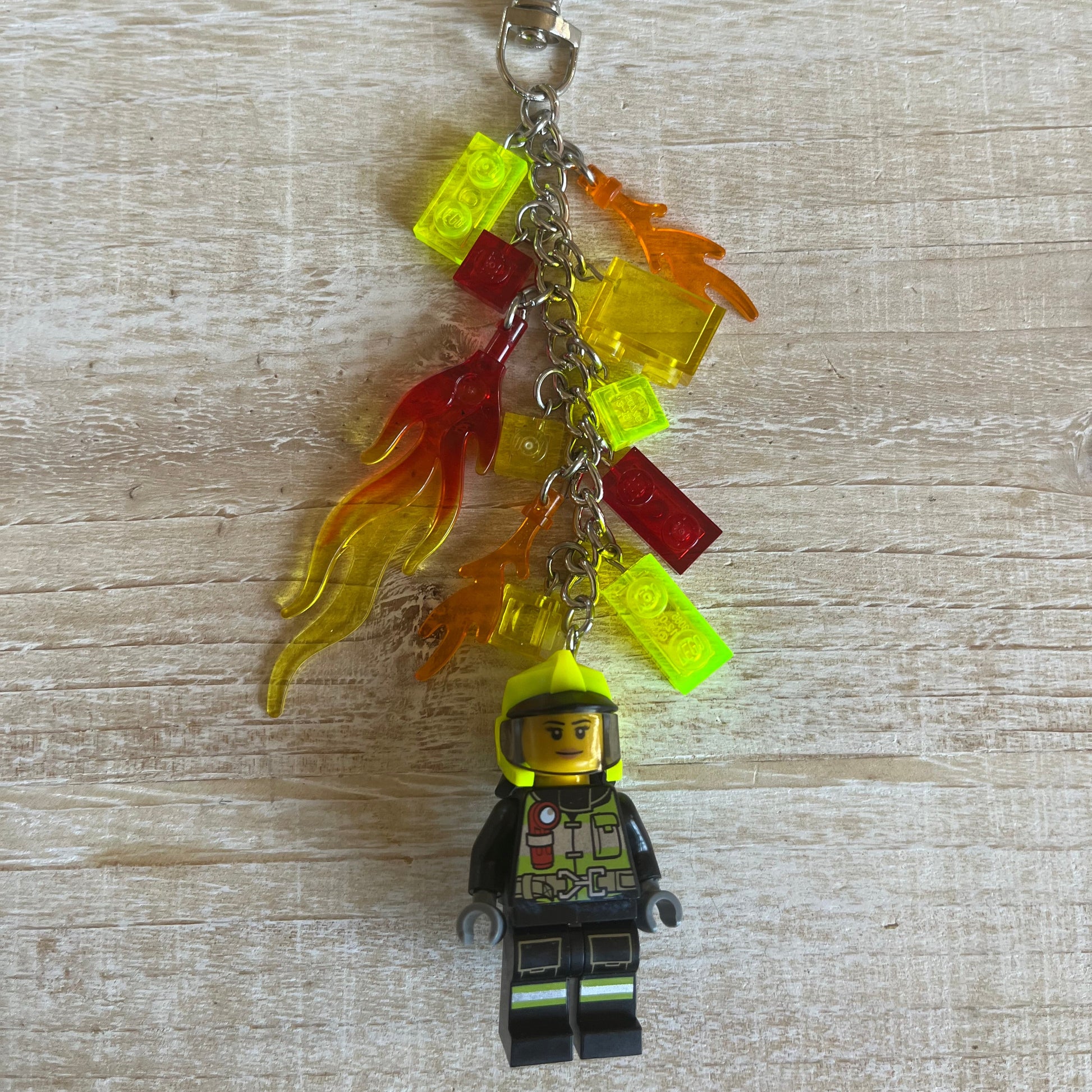 Lobster clasp keychain with a LEGO firewoman minifigure attached as the focal point. Additional LEGO components used as charms, including flames and other bricks. All parts of the minifigure are glued.