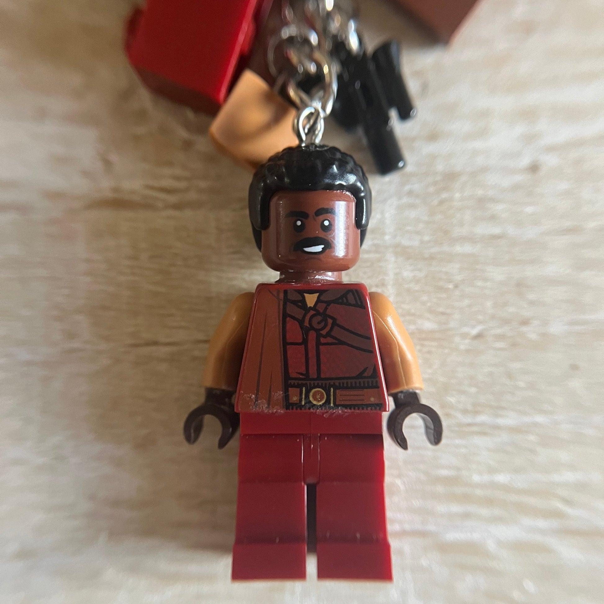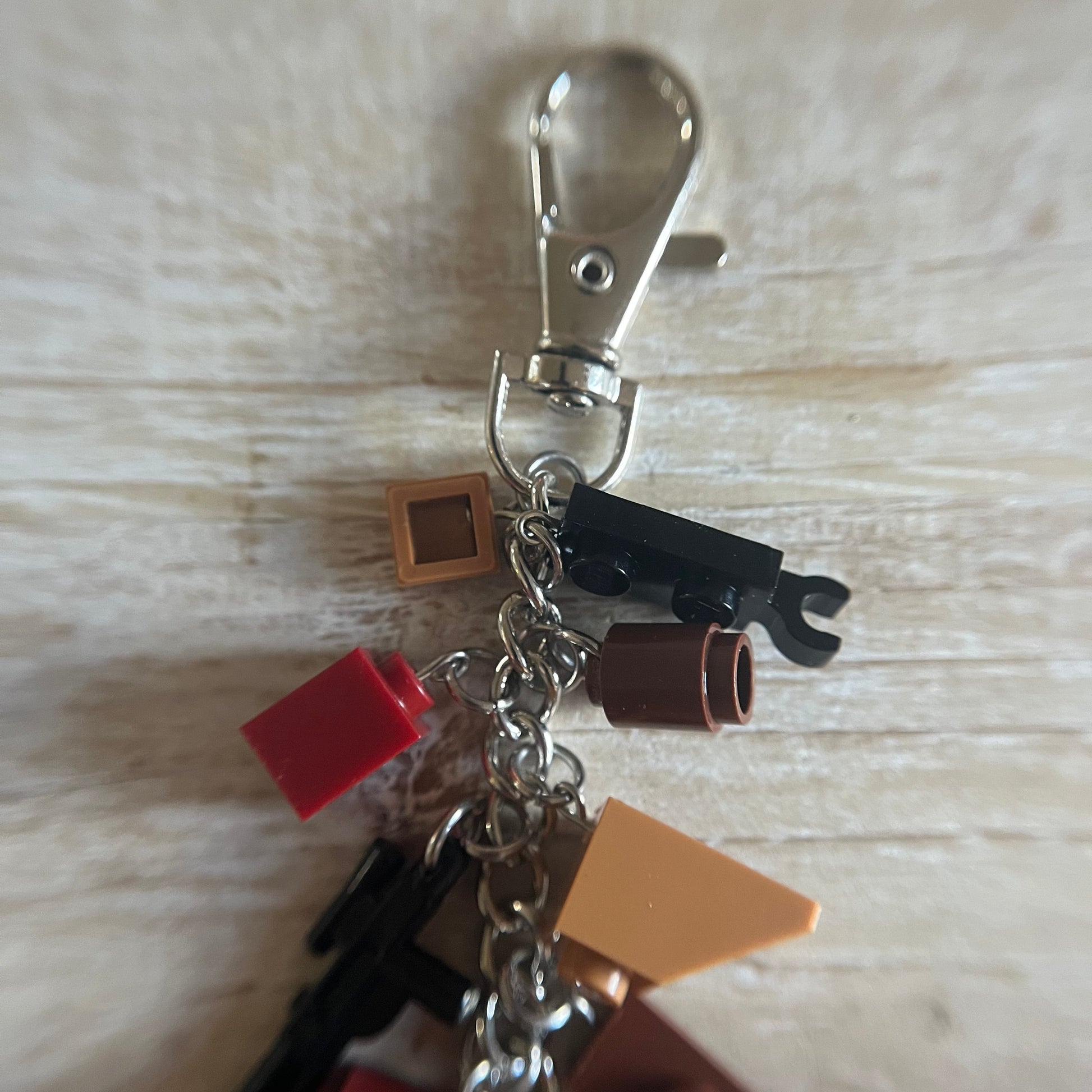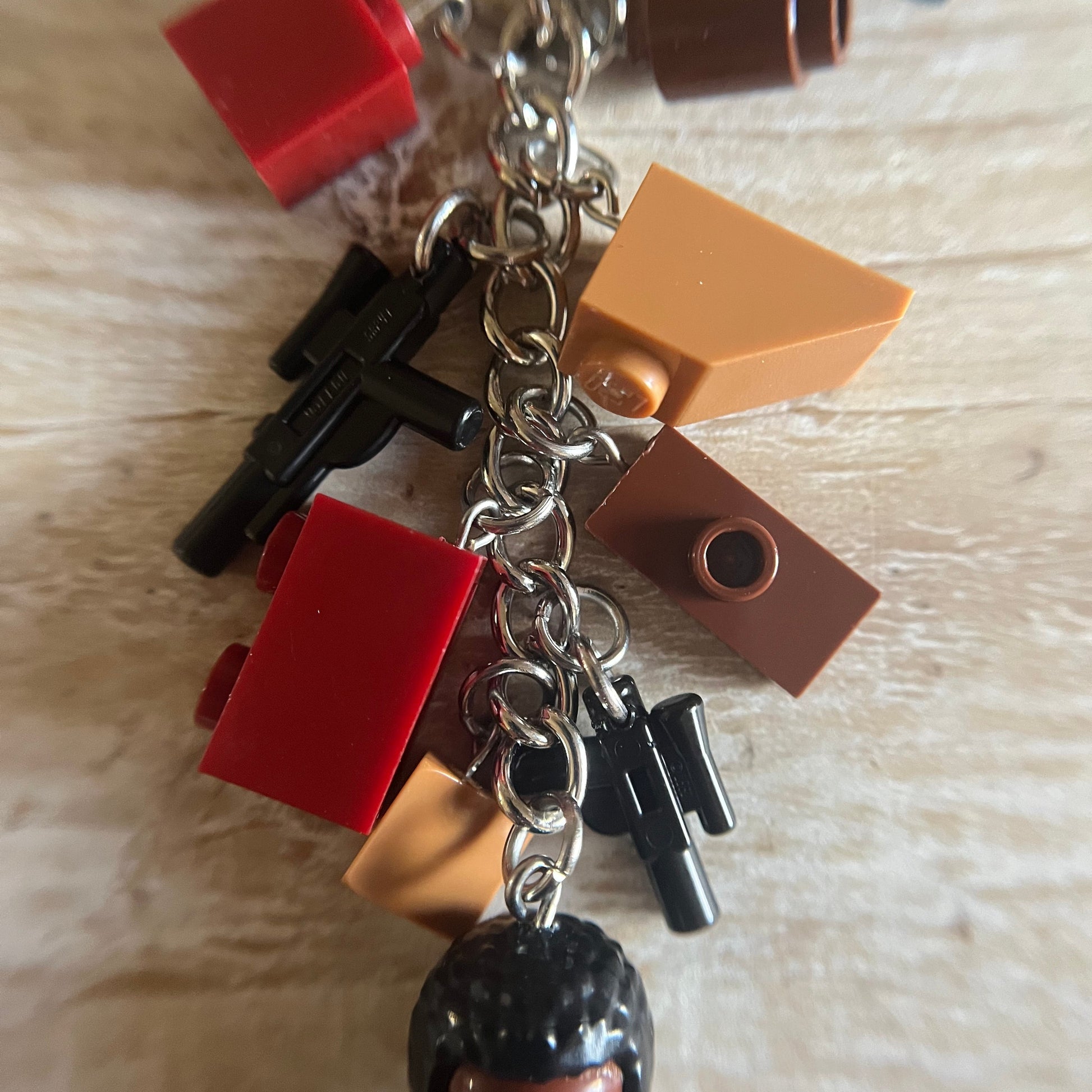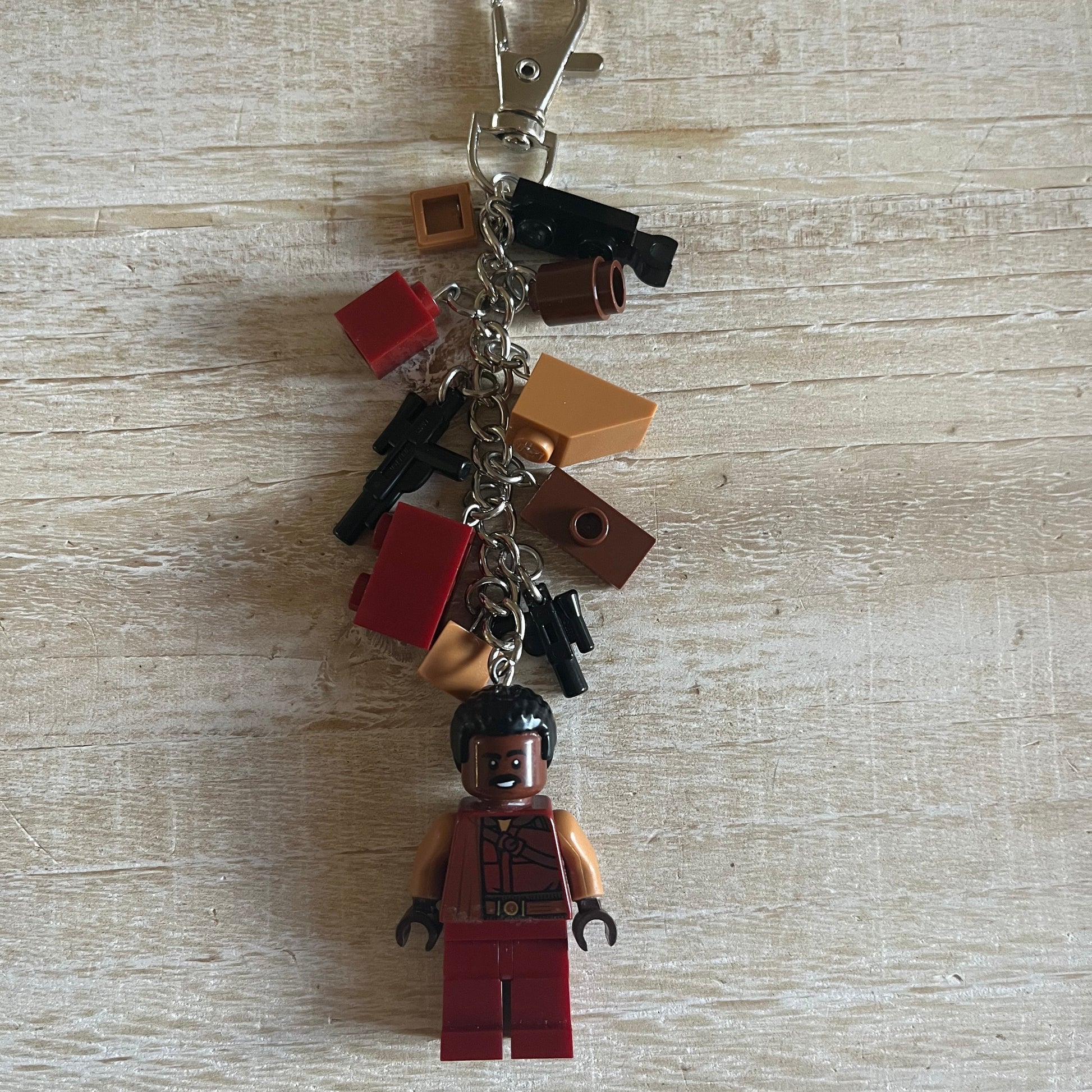 Lobster clasp keychain with a LEGO Star Wars Mandalorian Greef Karga minifigure. Also includes other LEGO components as charms. All parts of the minifigure are glued.