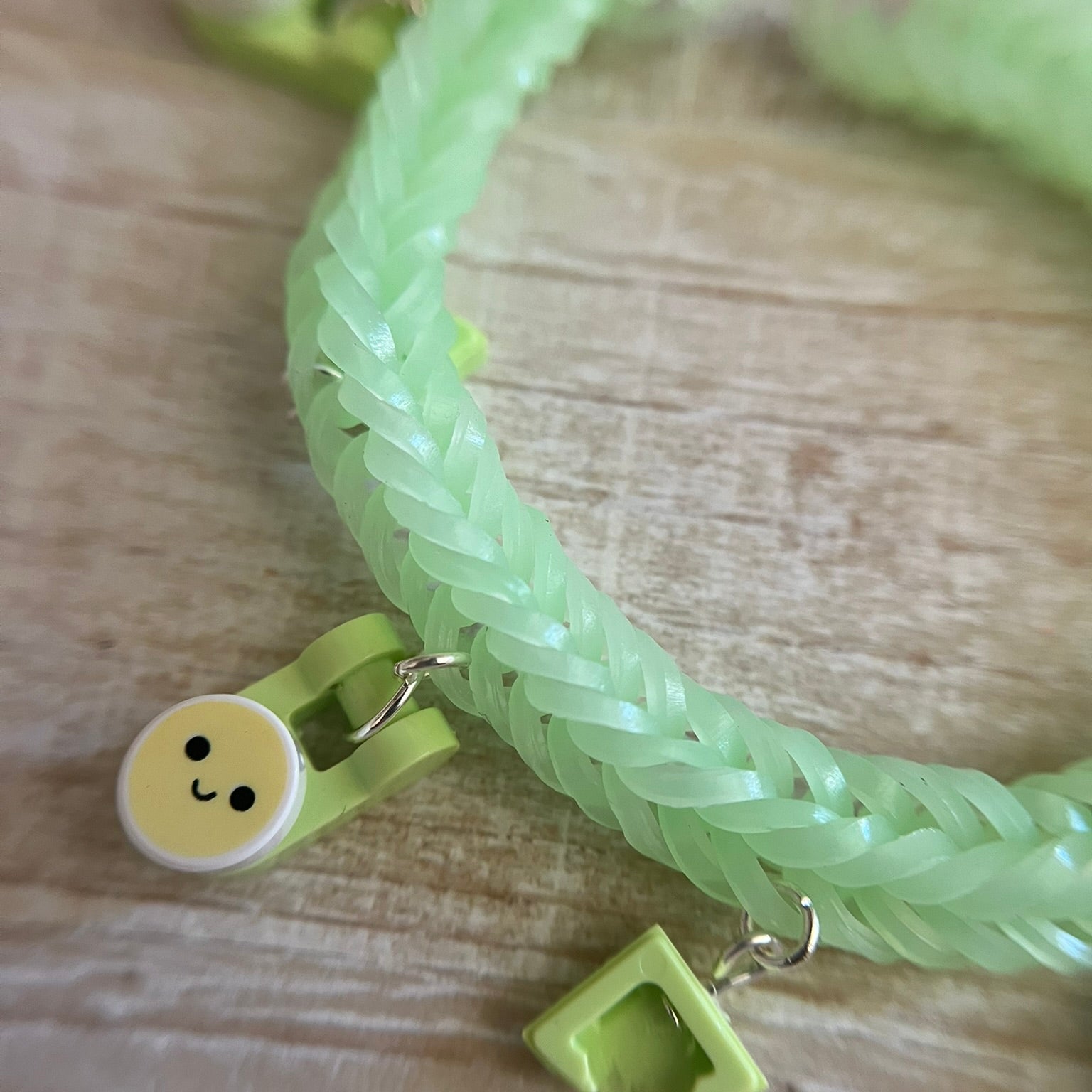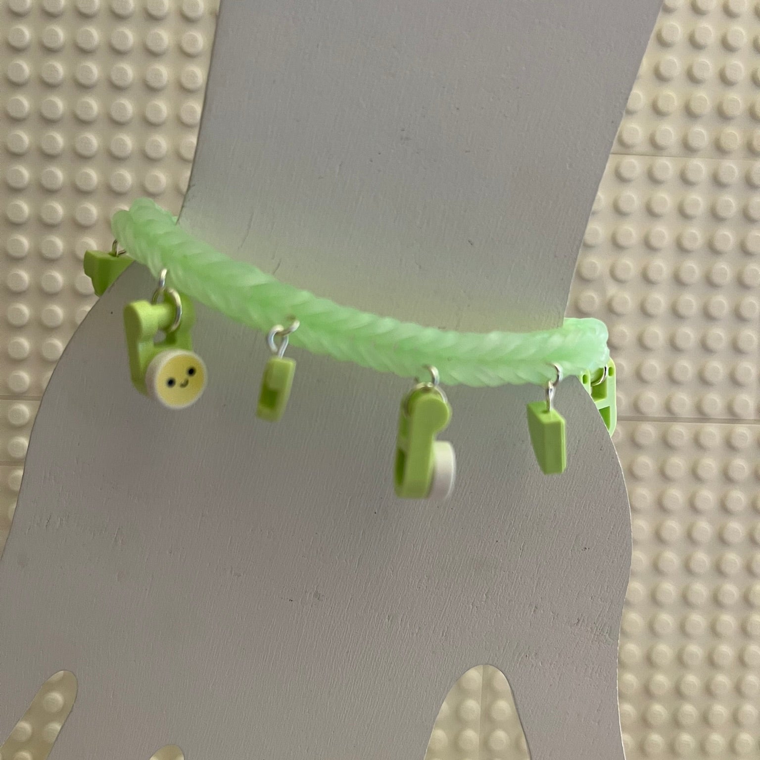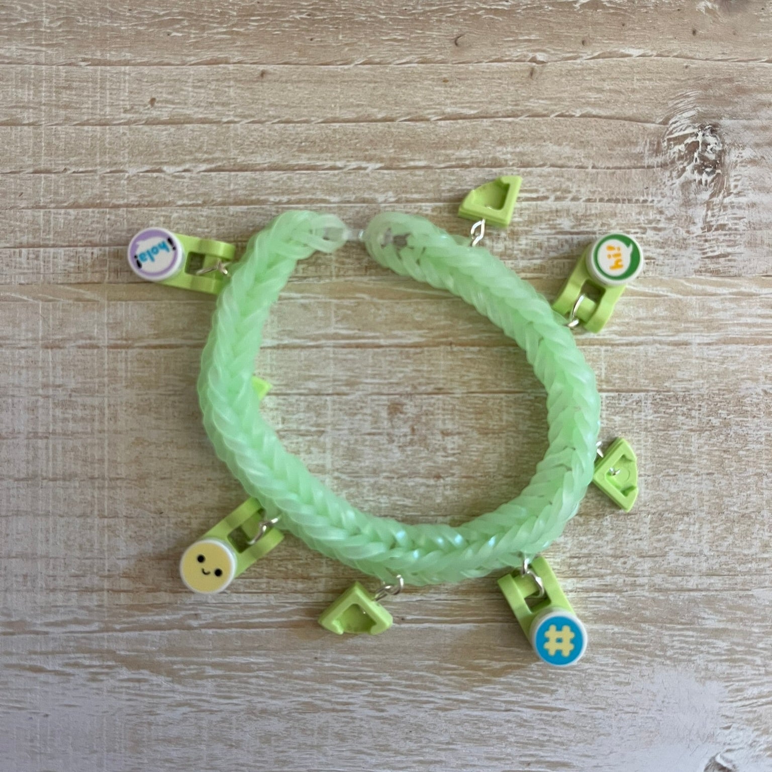 Rubber band bracelet with LEGO® bricks as charms. Fits most adults and children. The decorative LEGO® dots on the charms may differ, but colors and look will stay the same.