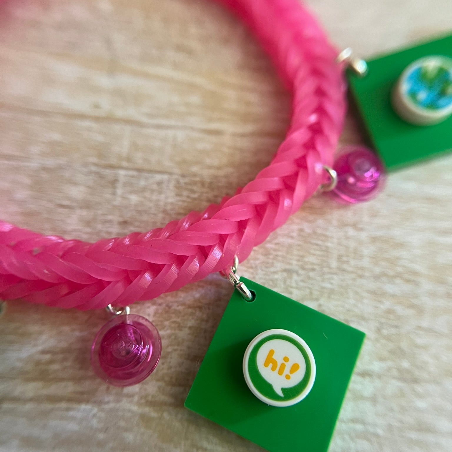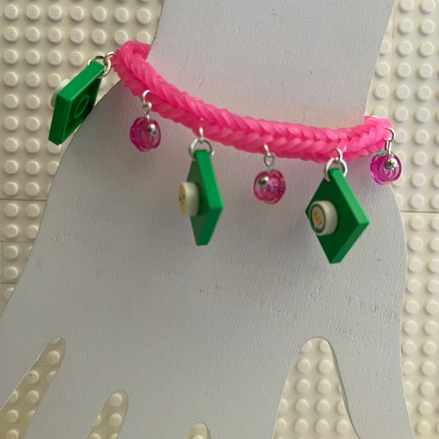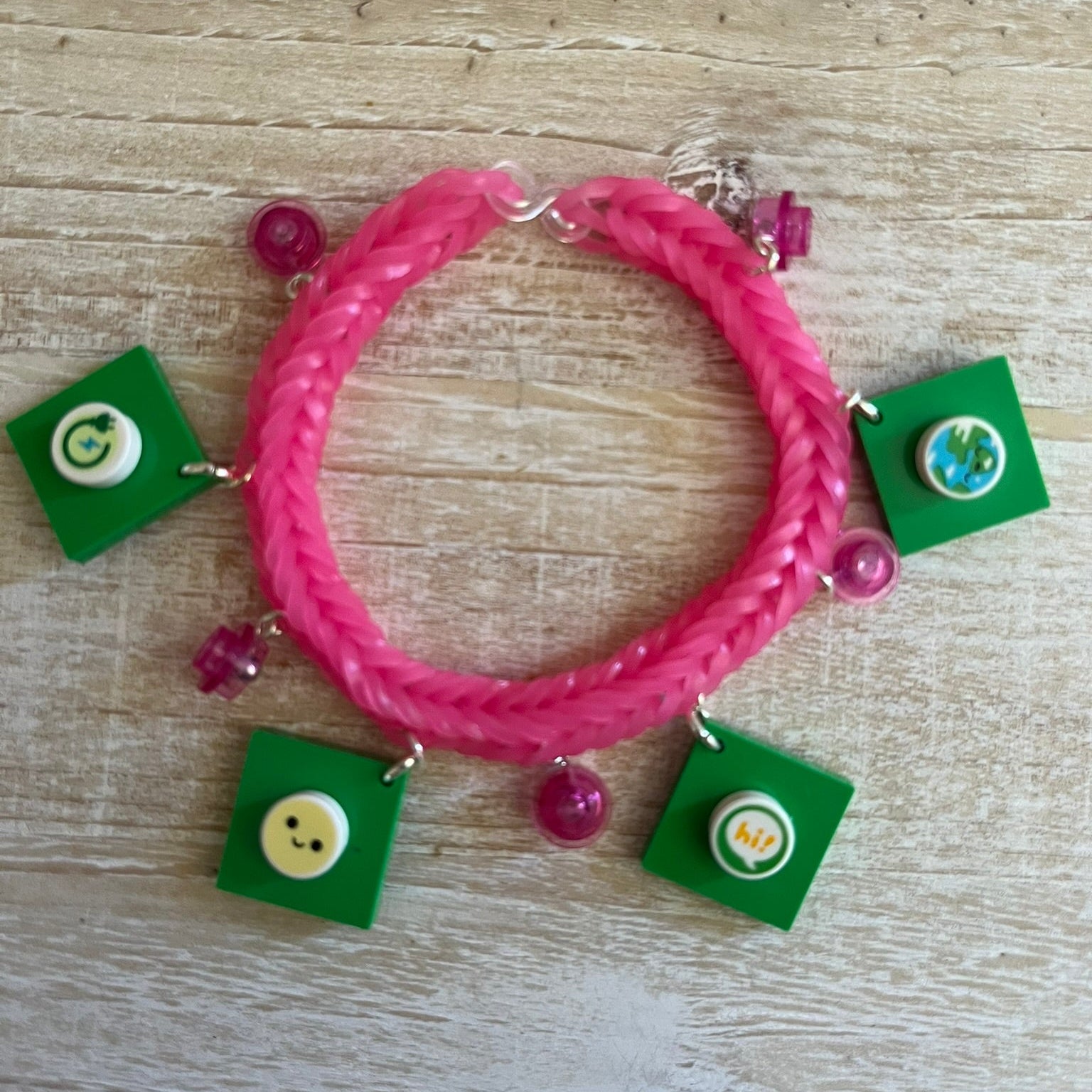 Rubber band bracelet with LEGO® bricks as charms. Fits most adults and children. The decorative LEGO® dots on the charms may differ, but colors and look will stay the same.
