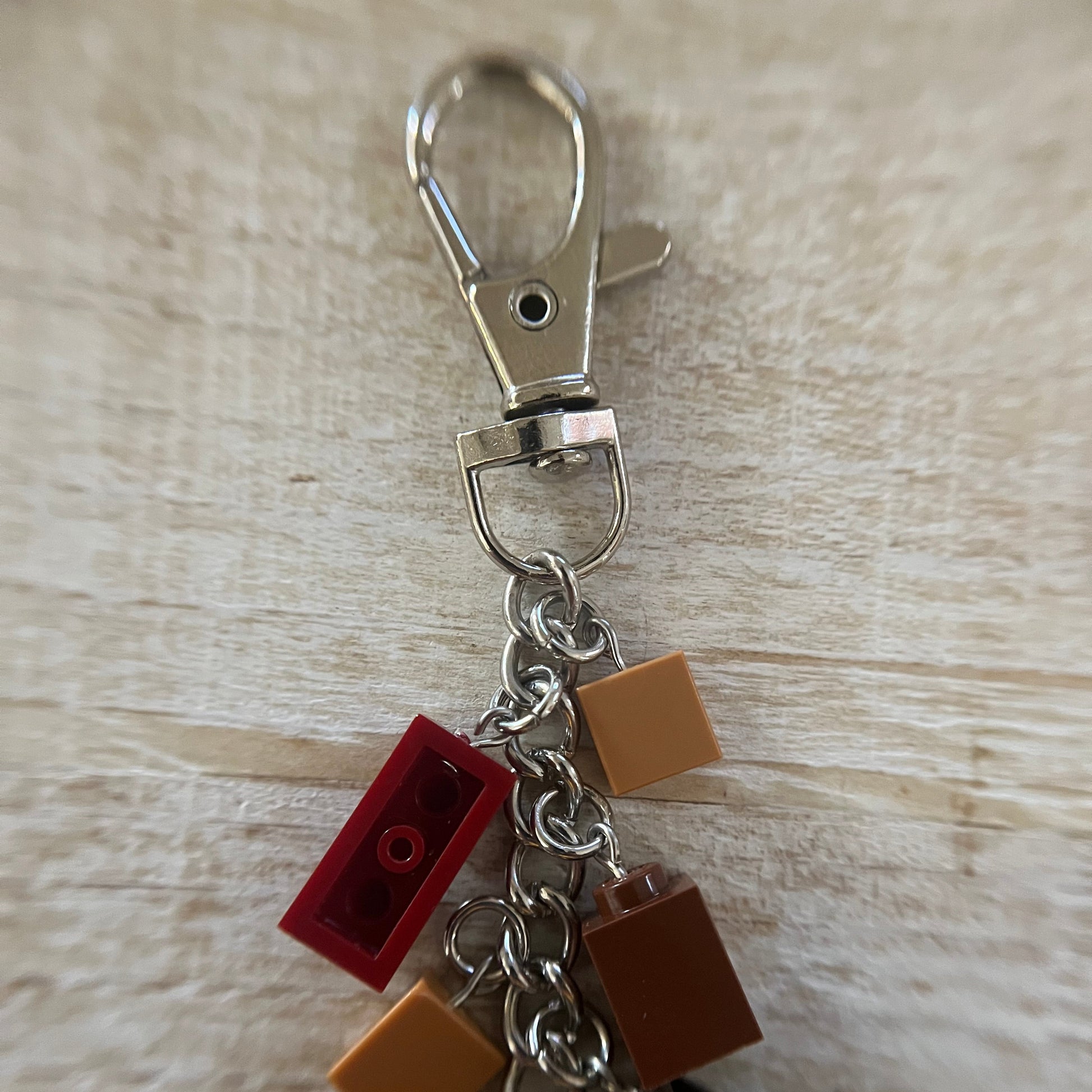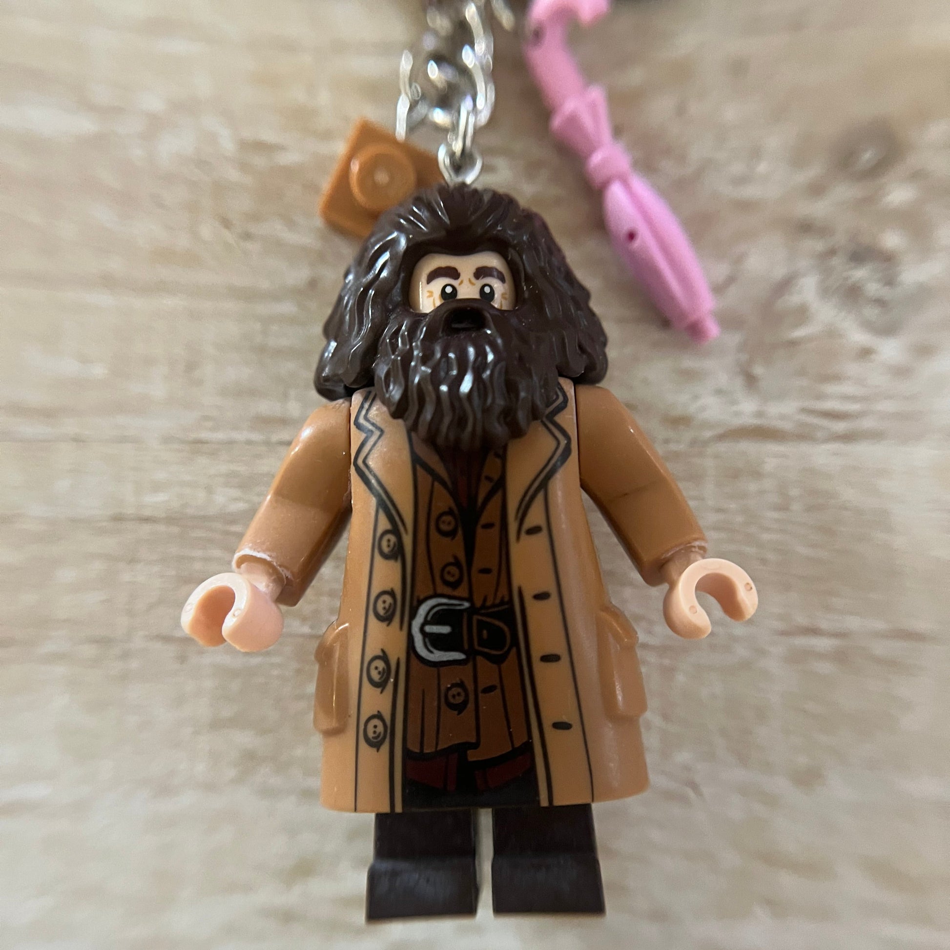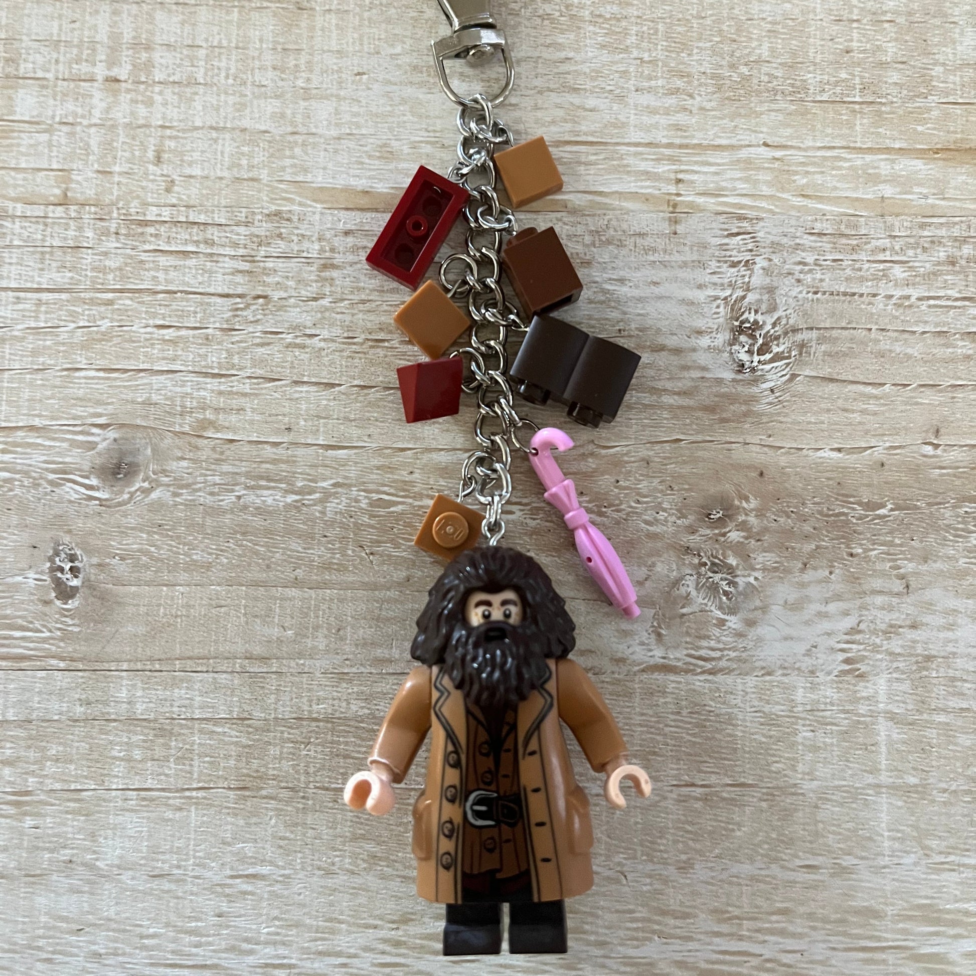 Lobster clasp keychain with LEGO Harry Potter’s Hagrid minifigure. Also includes other LEGO components as charms. All parts of the minifigure are glued.