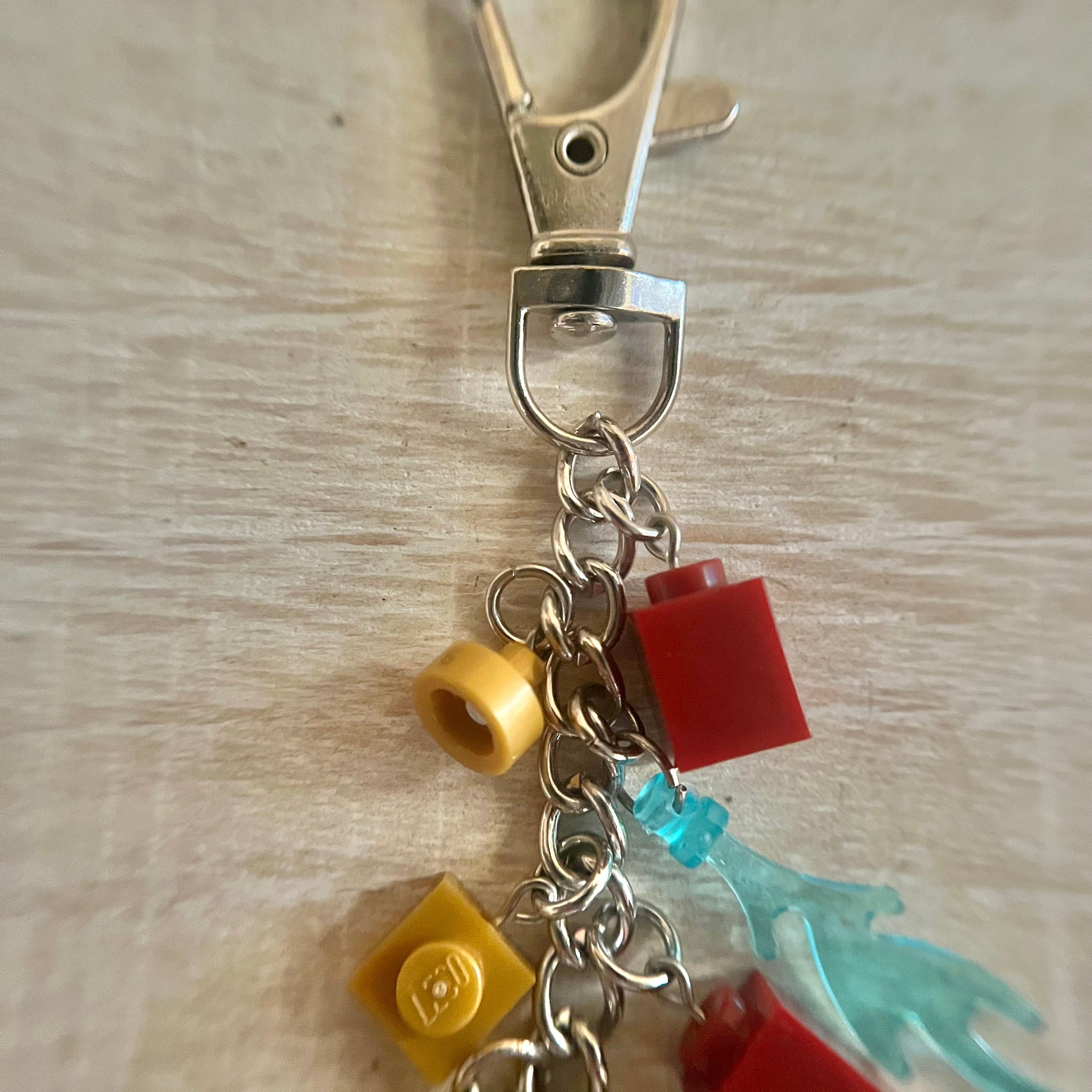 Lobster clasp keychain with Iron Man minifigure. Also includes other Lego components as charms.