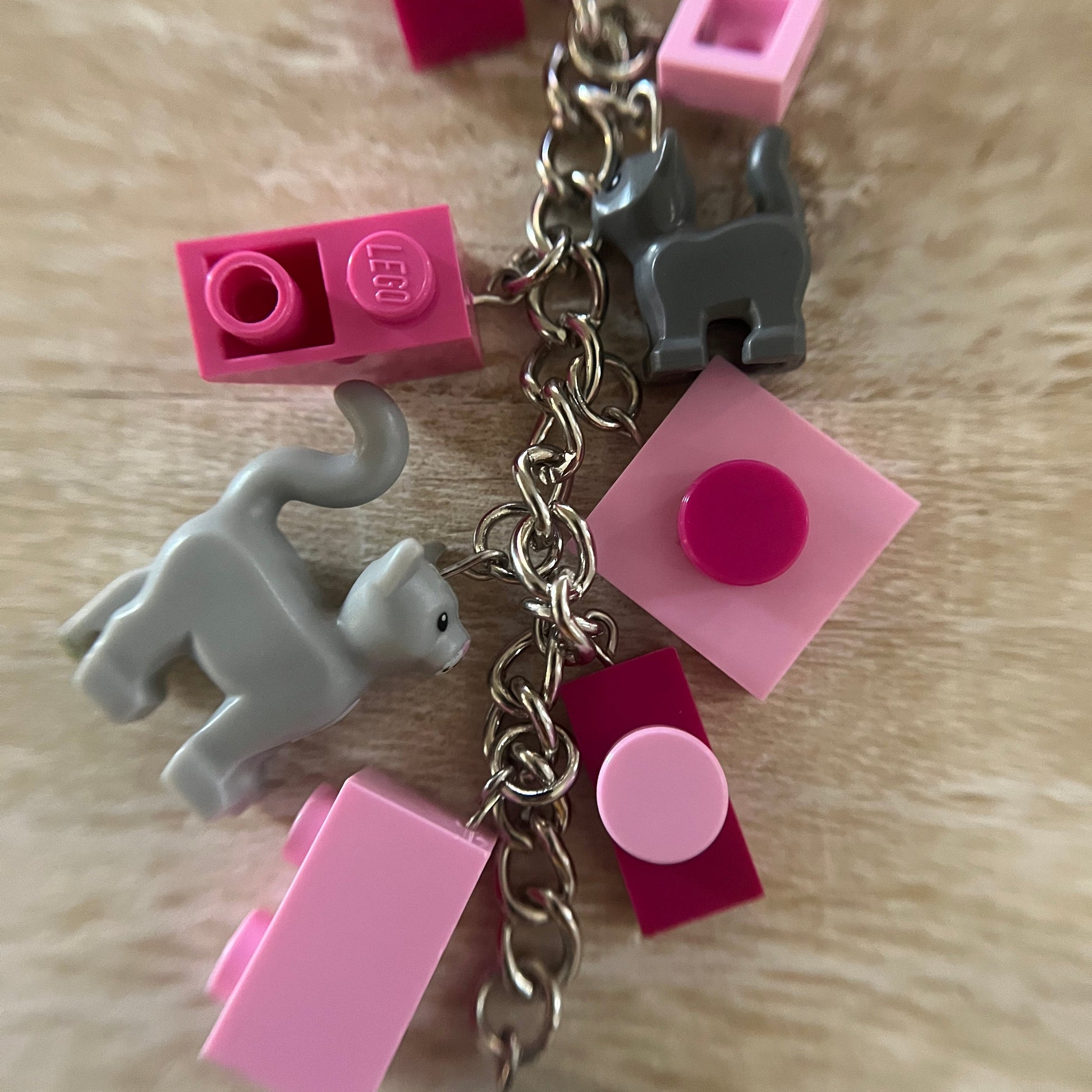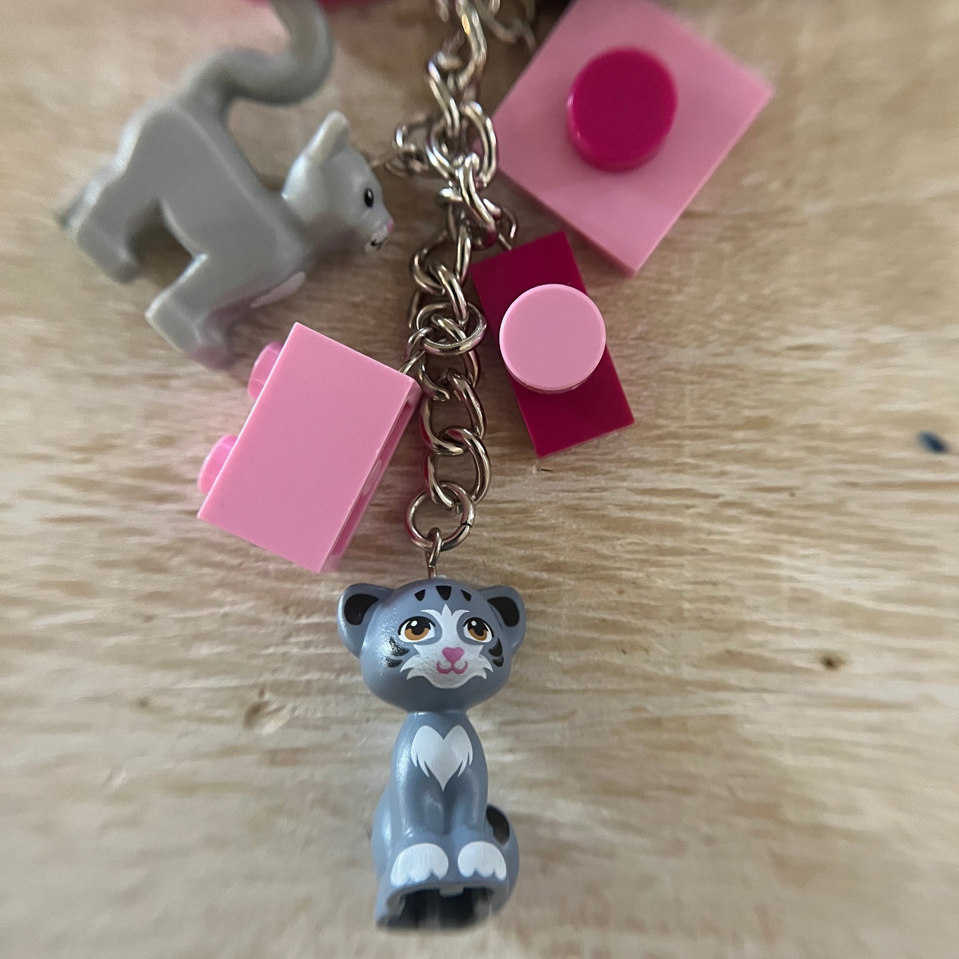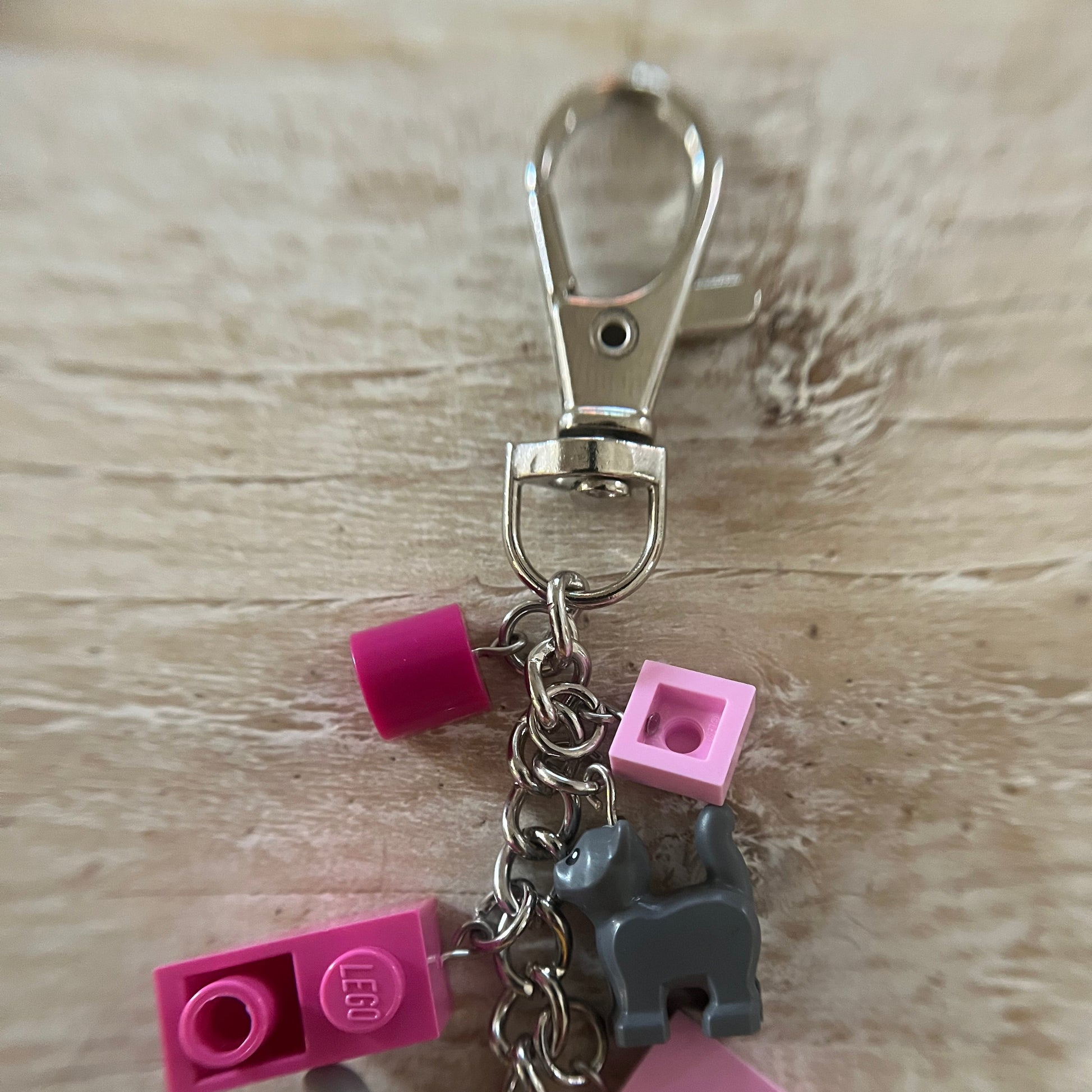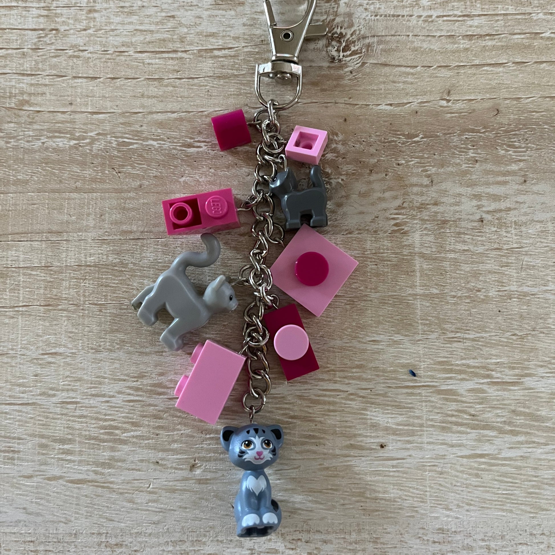 Lobster clasp keychain with LEGO cats attached. Also includes other Lego components as charms. All parts of the minifigure are glued.