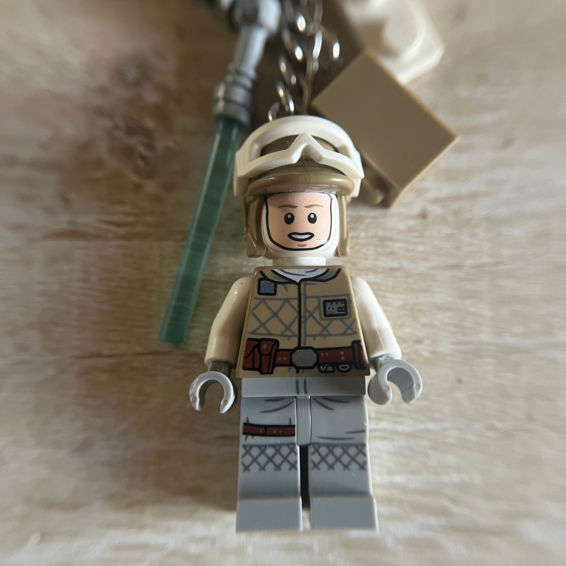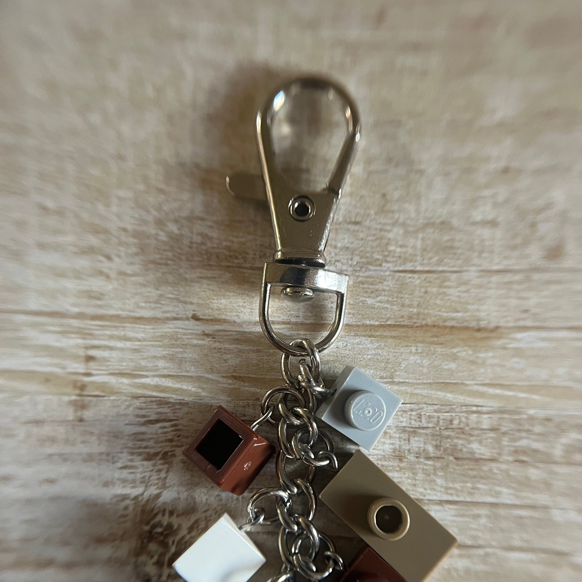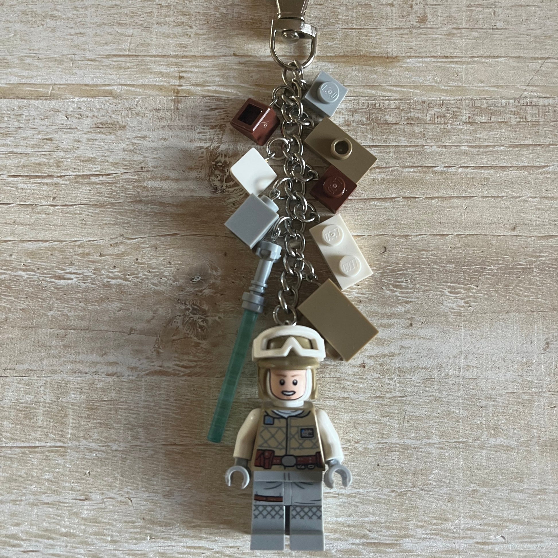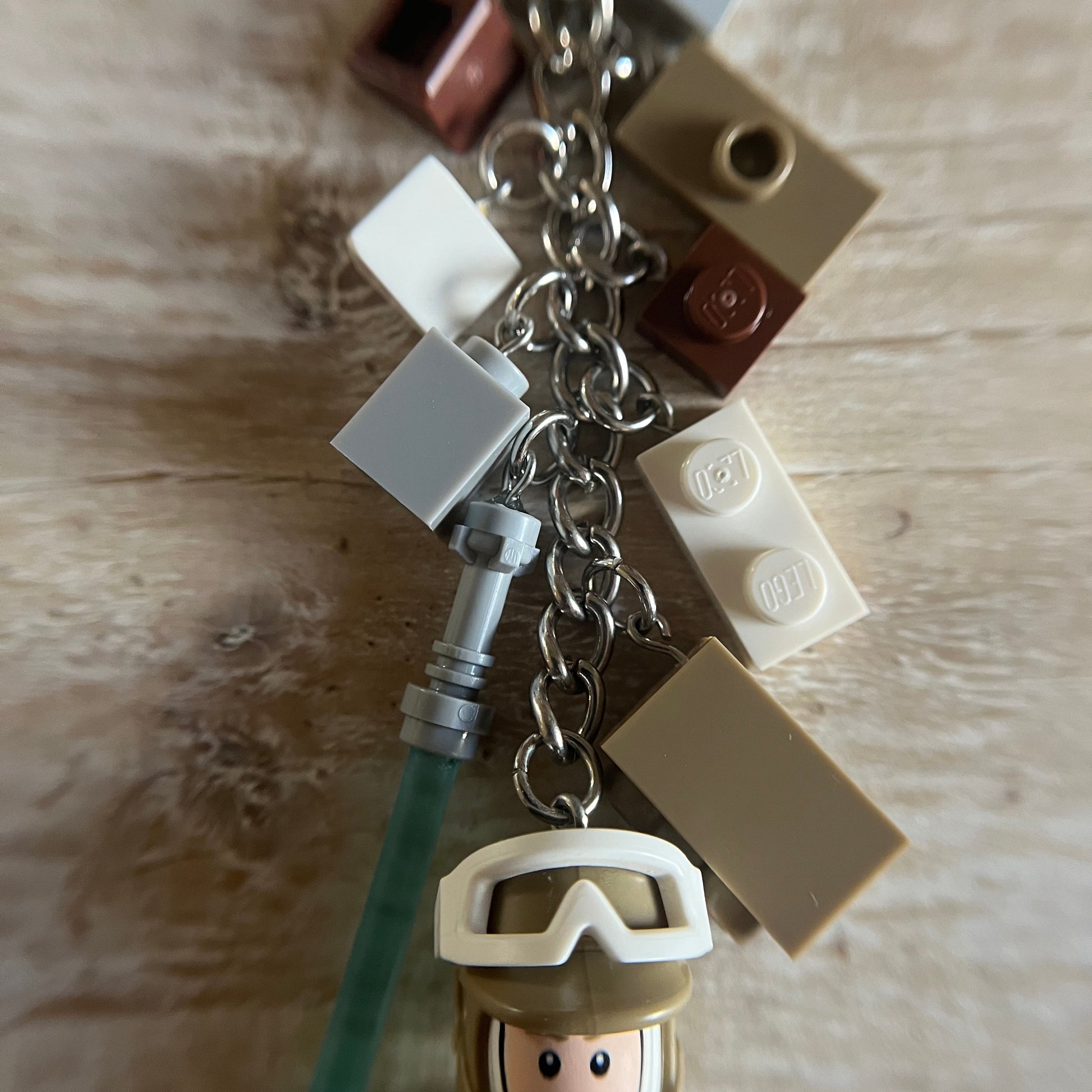 Lobster clasp keychain with a LEGO Star Wars Luke Skywalker minifigure. Also includes other LEGO components as charms. All parts of the minifigure are glued.