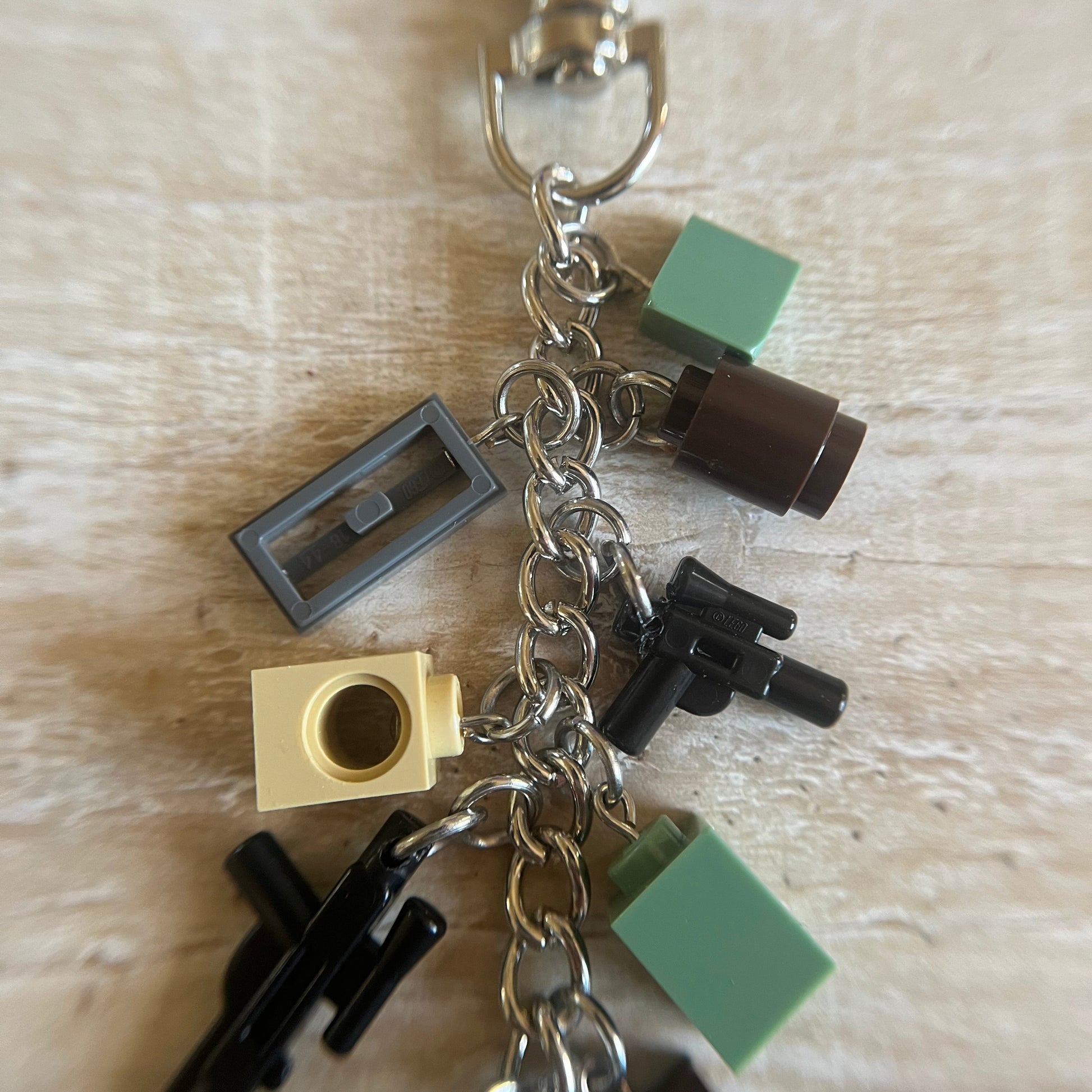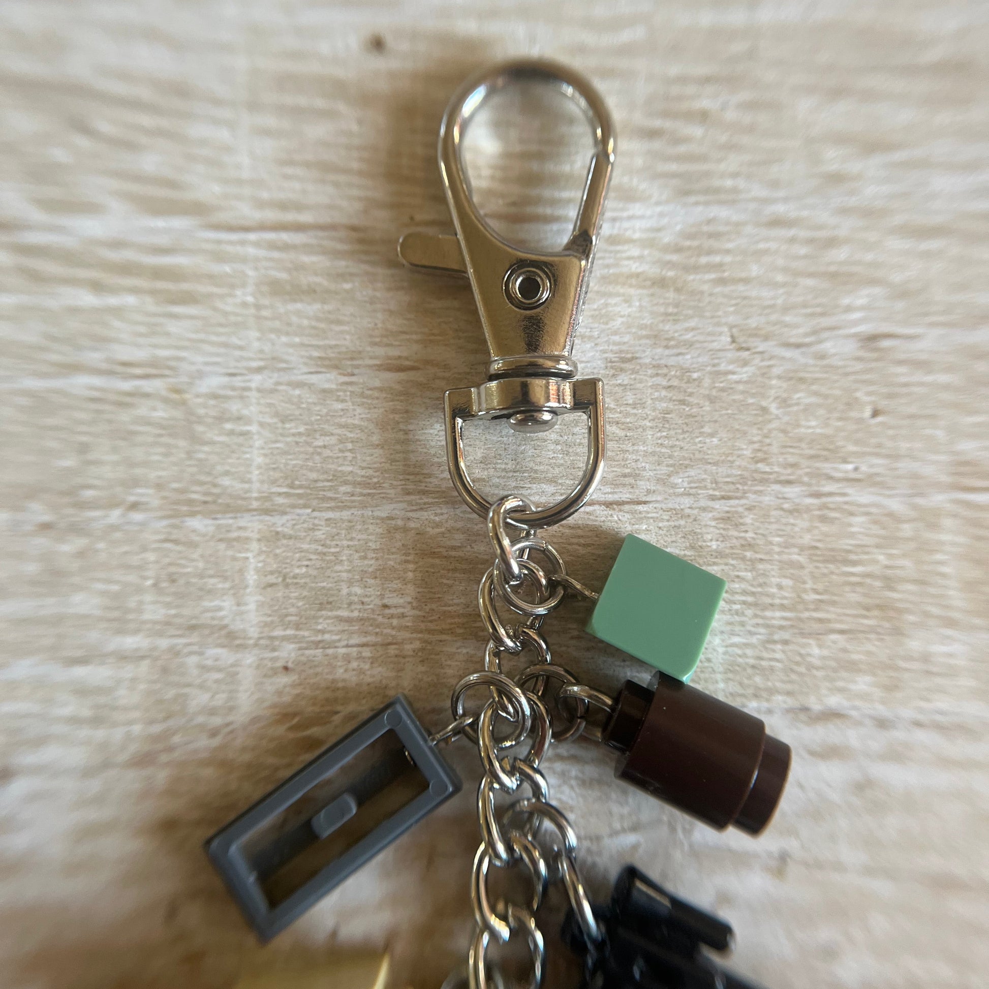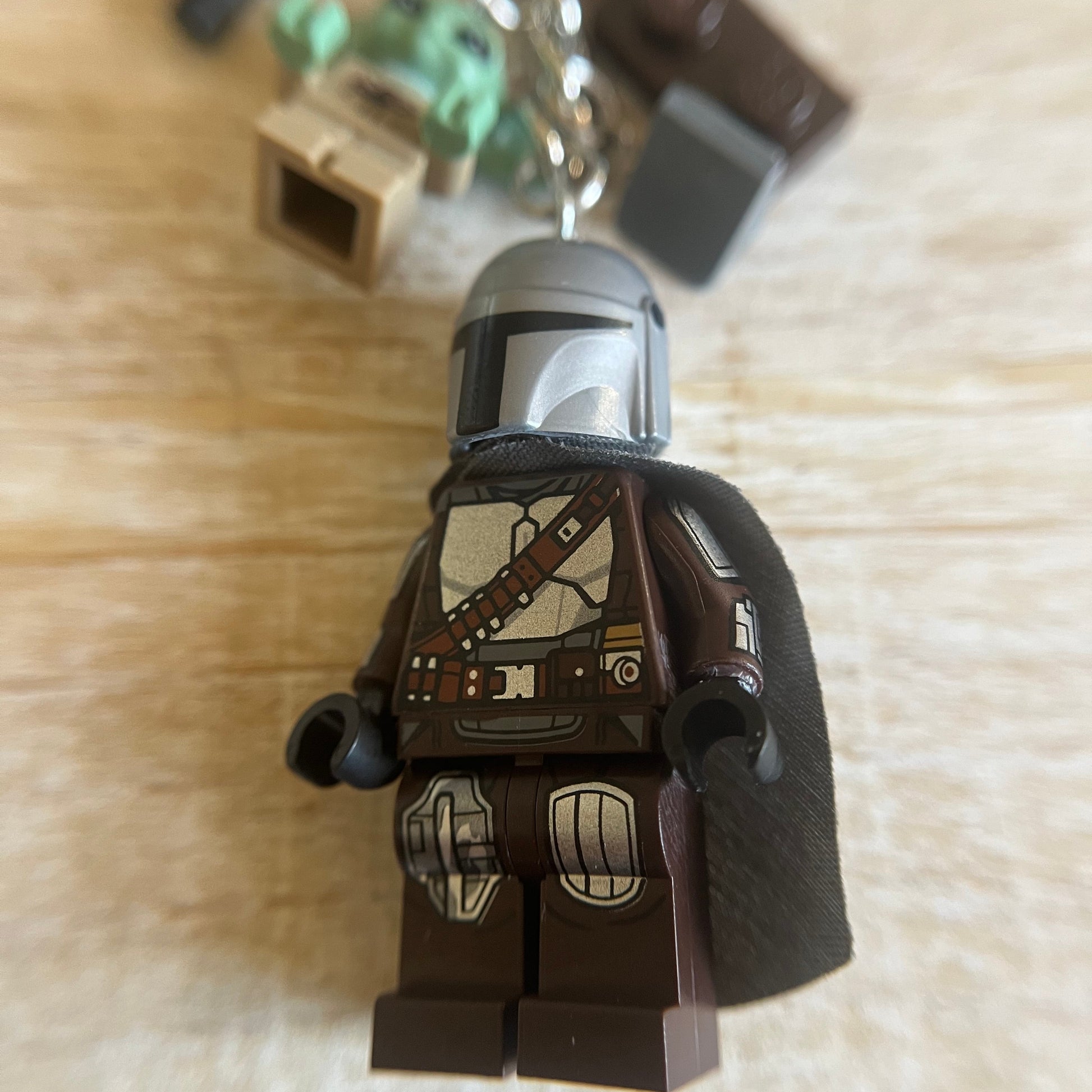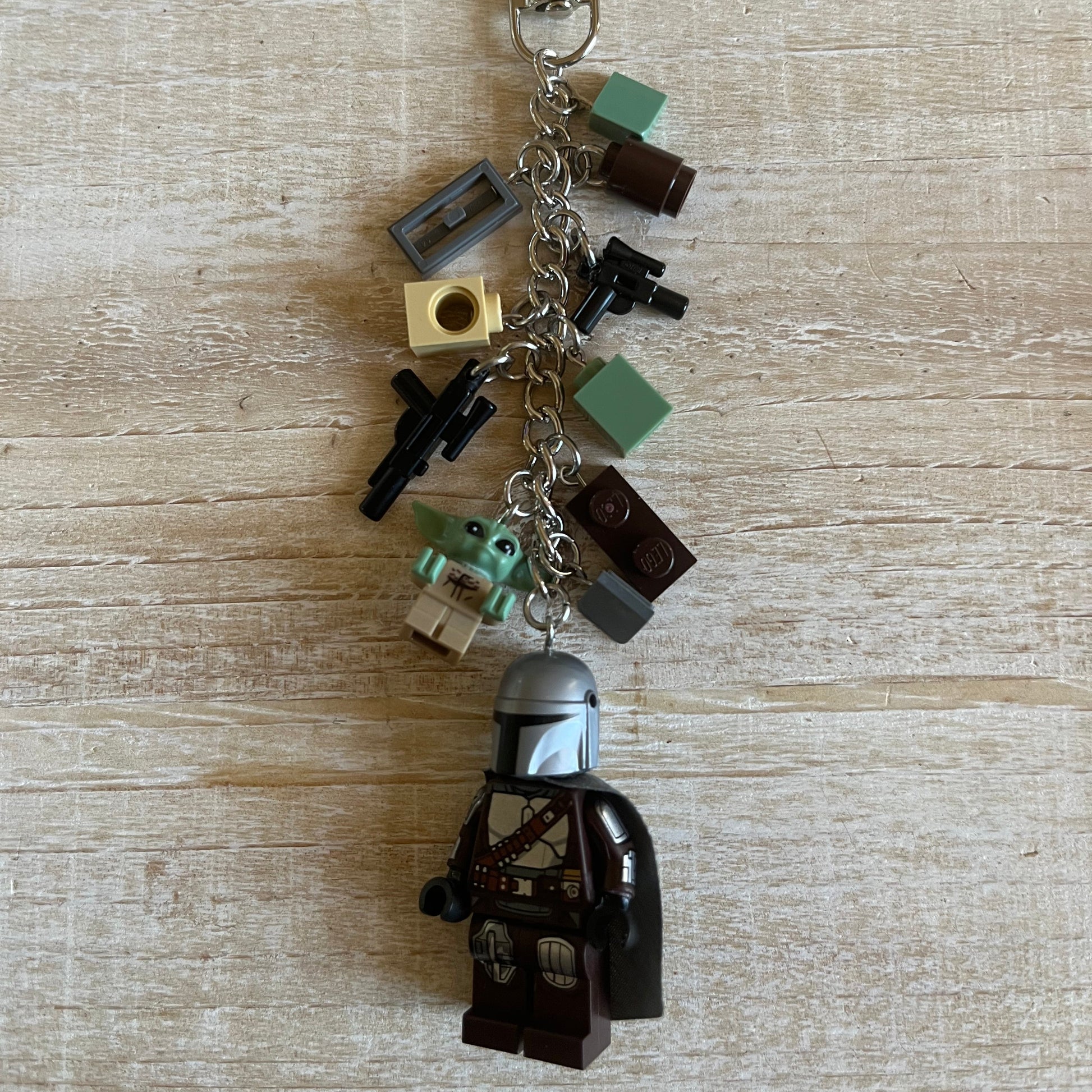 Lobster clasp keychain with a LEGO a Mandalorian Din Djarin and Grogu attached as the focal point. Additional LEGO components used as charms, including blasters and other bricks. All parts of the minifigure are glued.