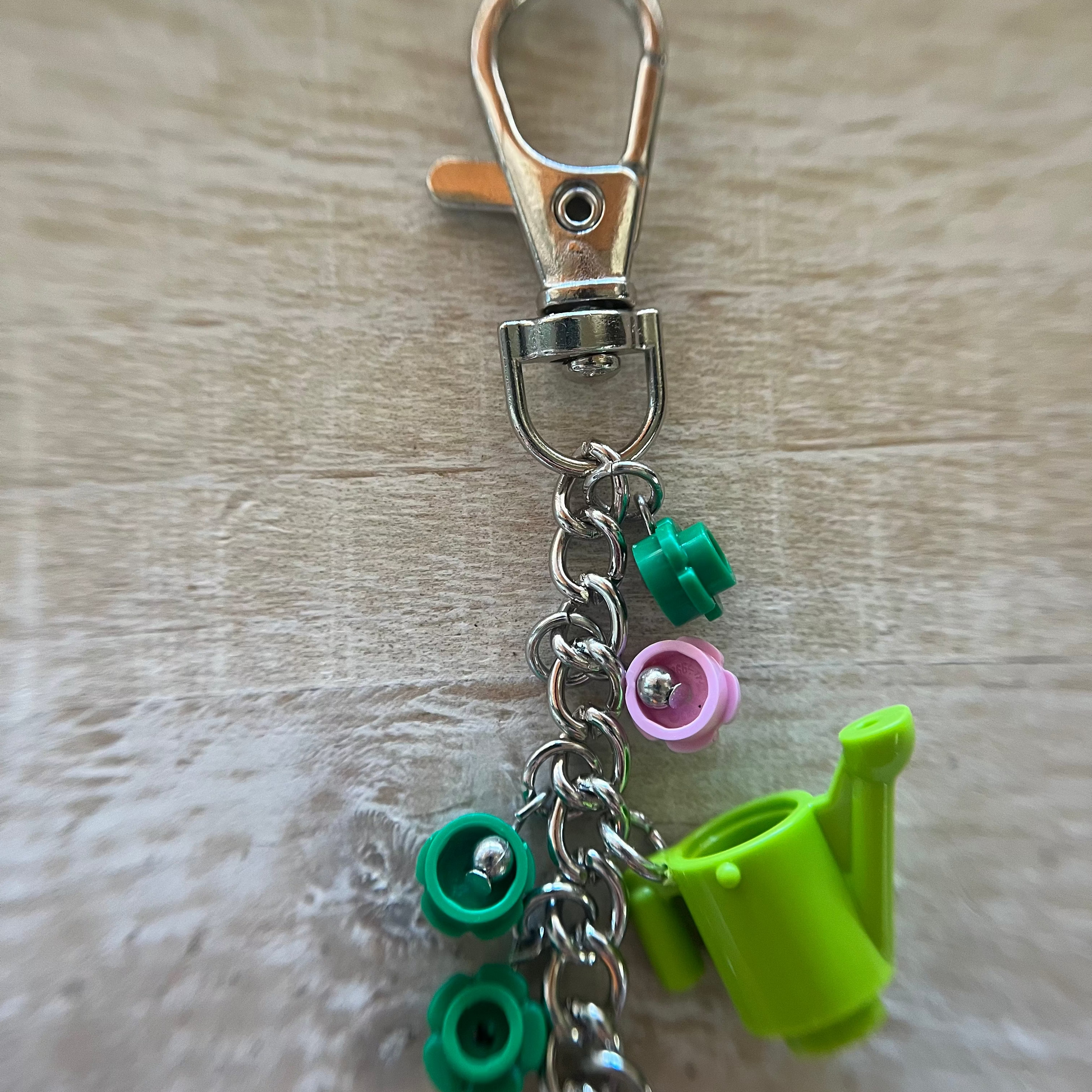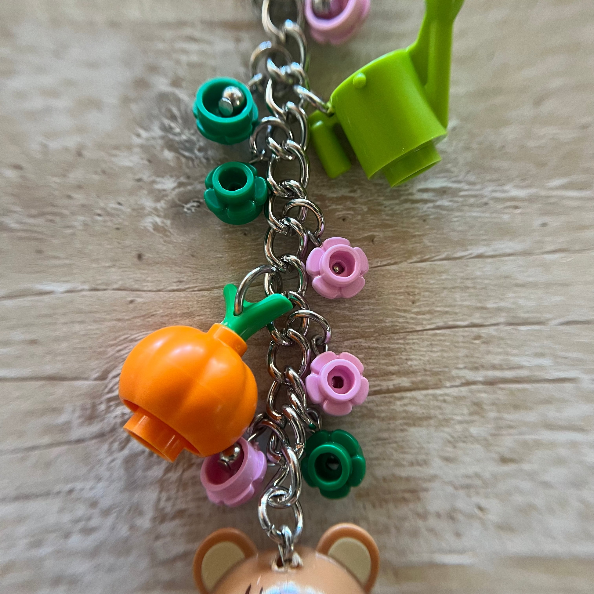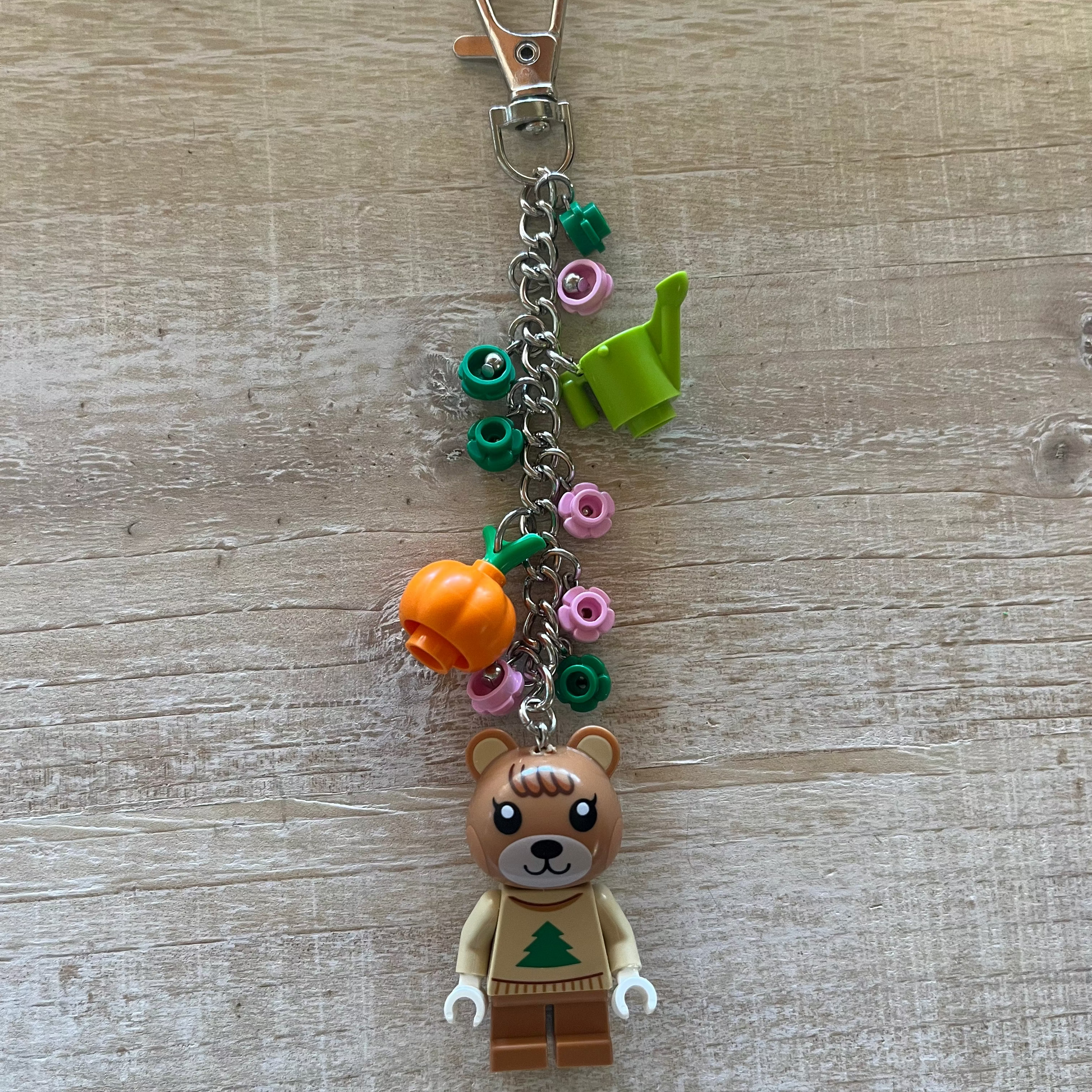 Hook keychain with a LEGO animal crossing minifigure attached. Also has other LEGO components used as charms.