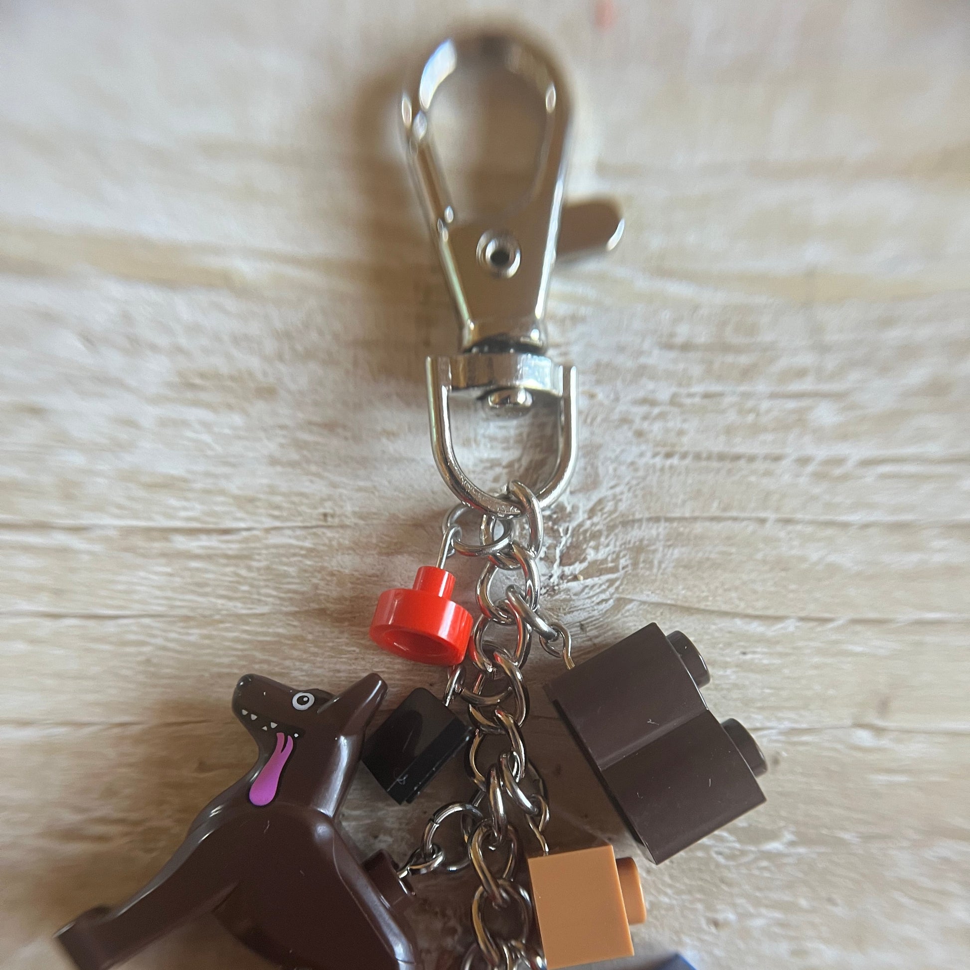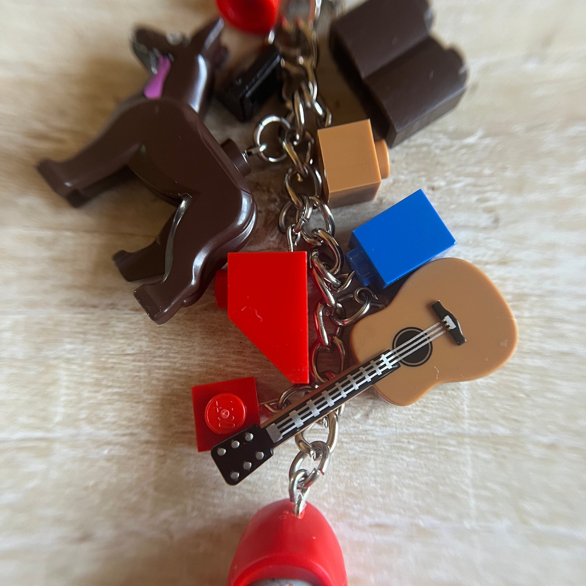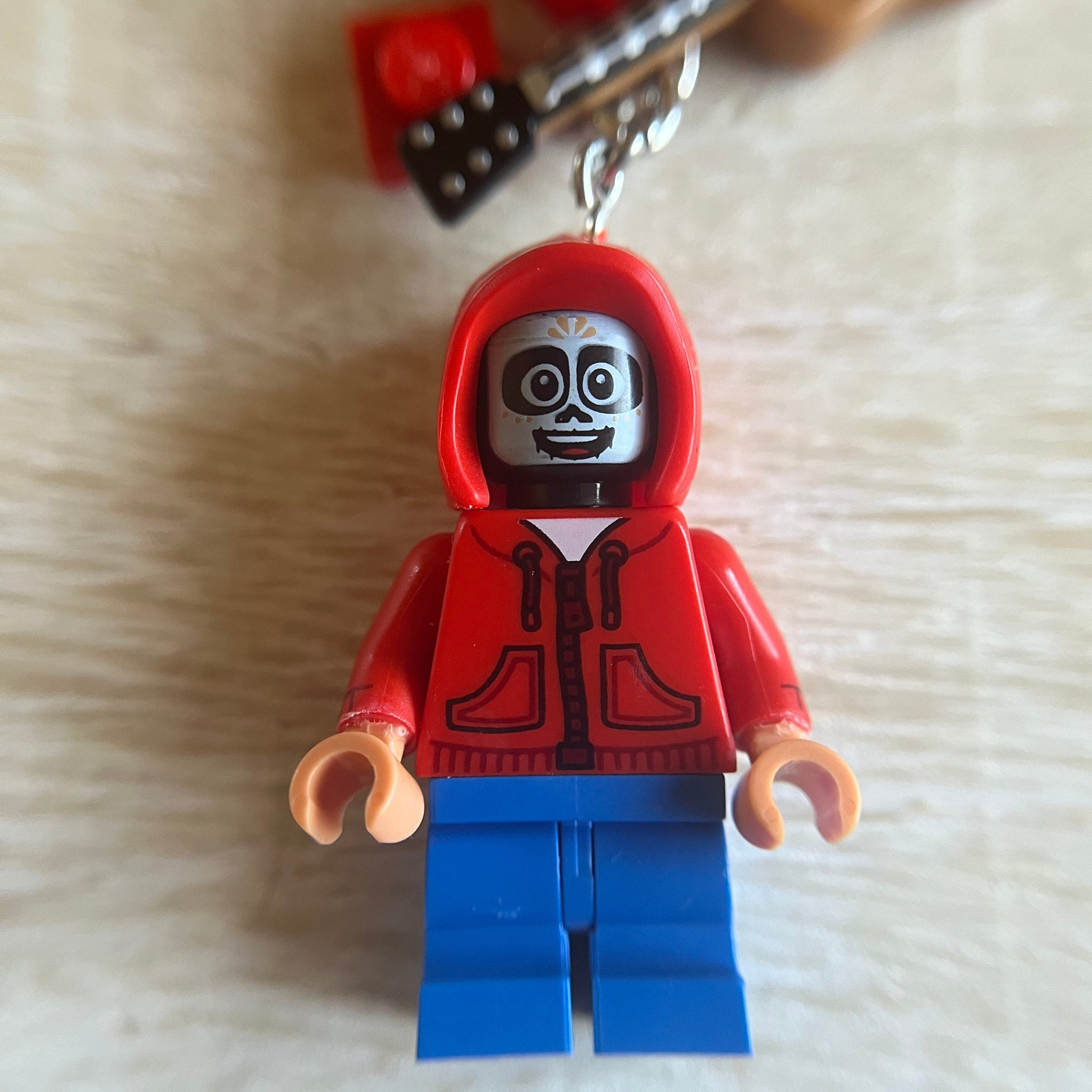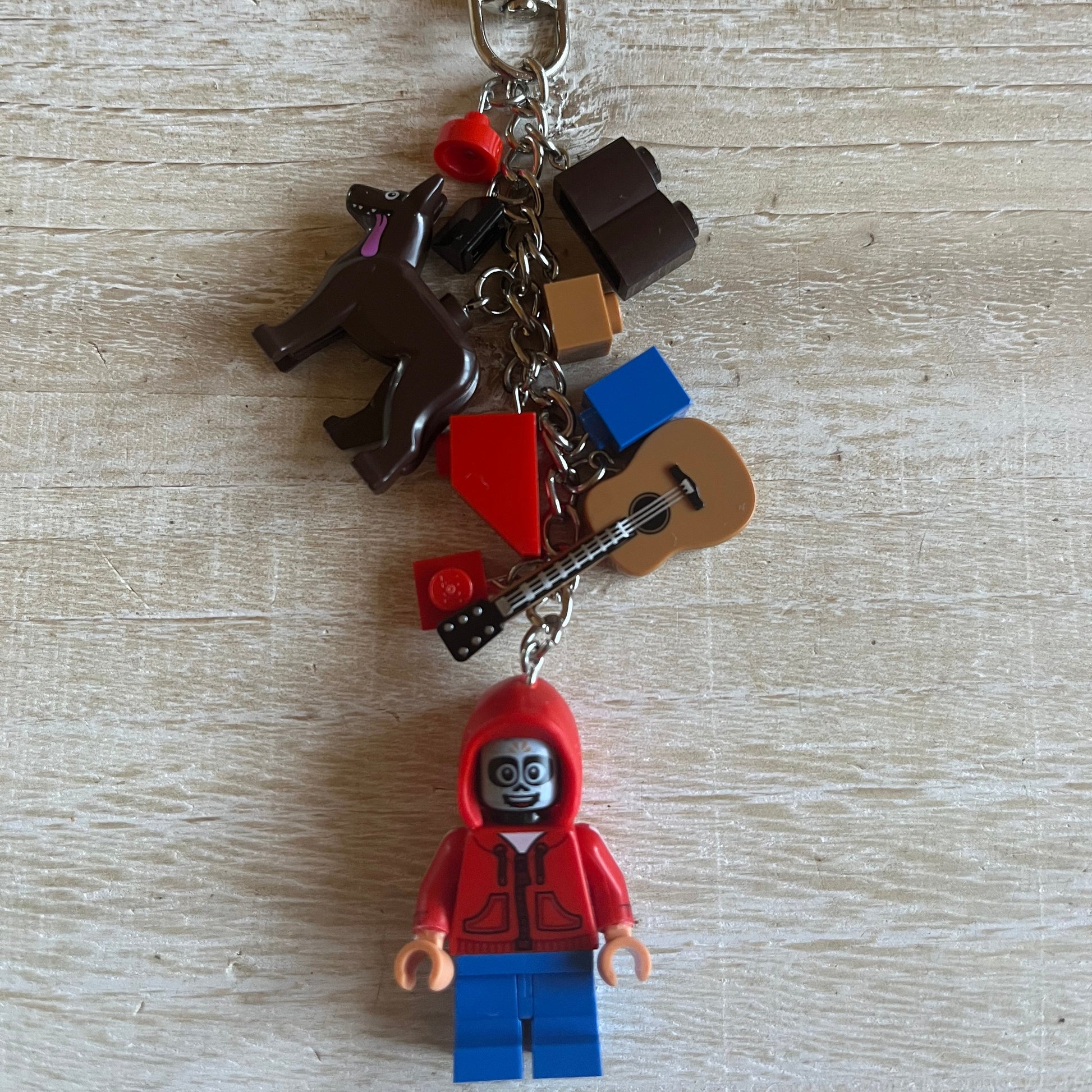 Lobster clasp keychain with a LEGO Disney’s Coco Miguel and Dante. Additional LEGO components used as charms. All parts of the minifigure are glued.