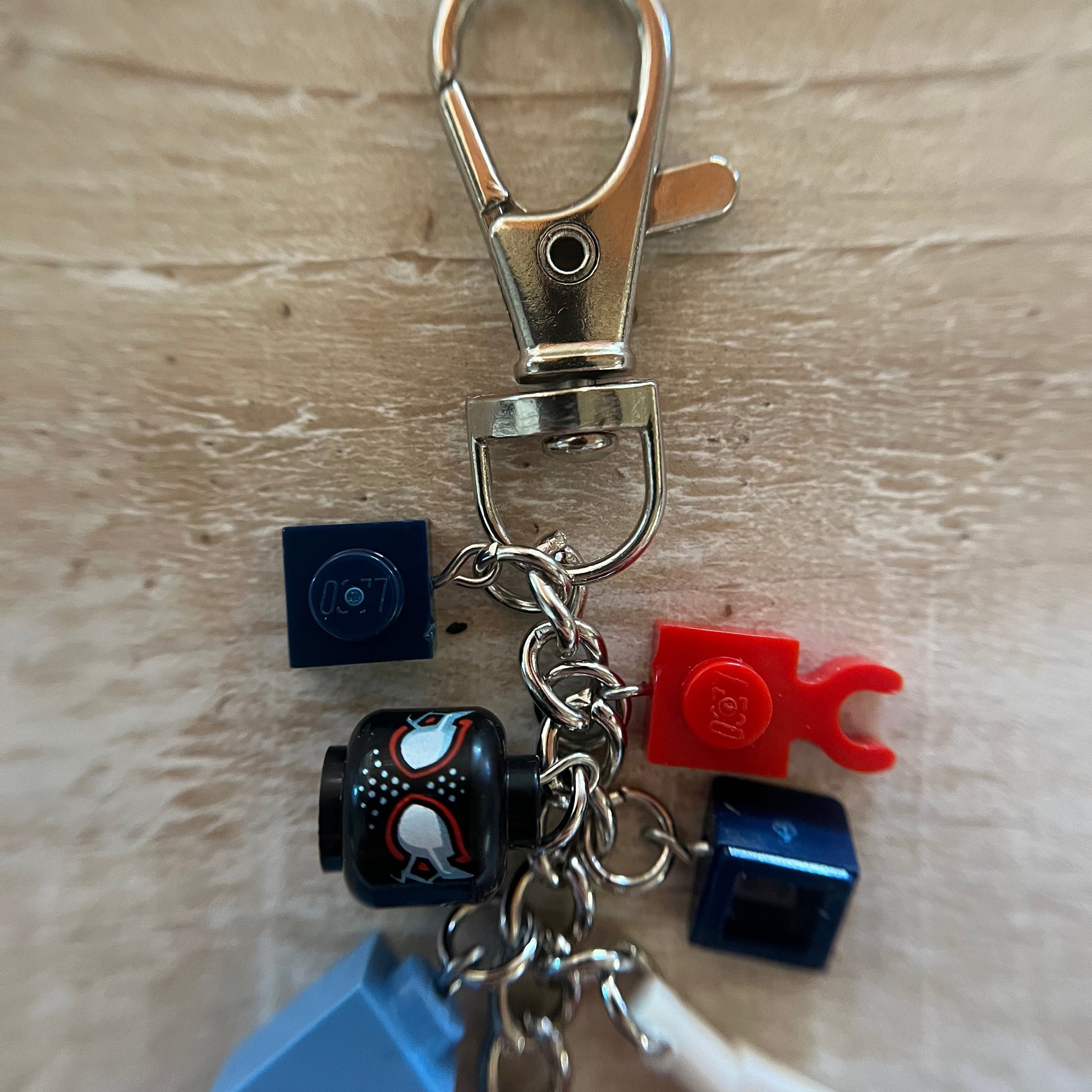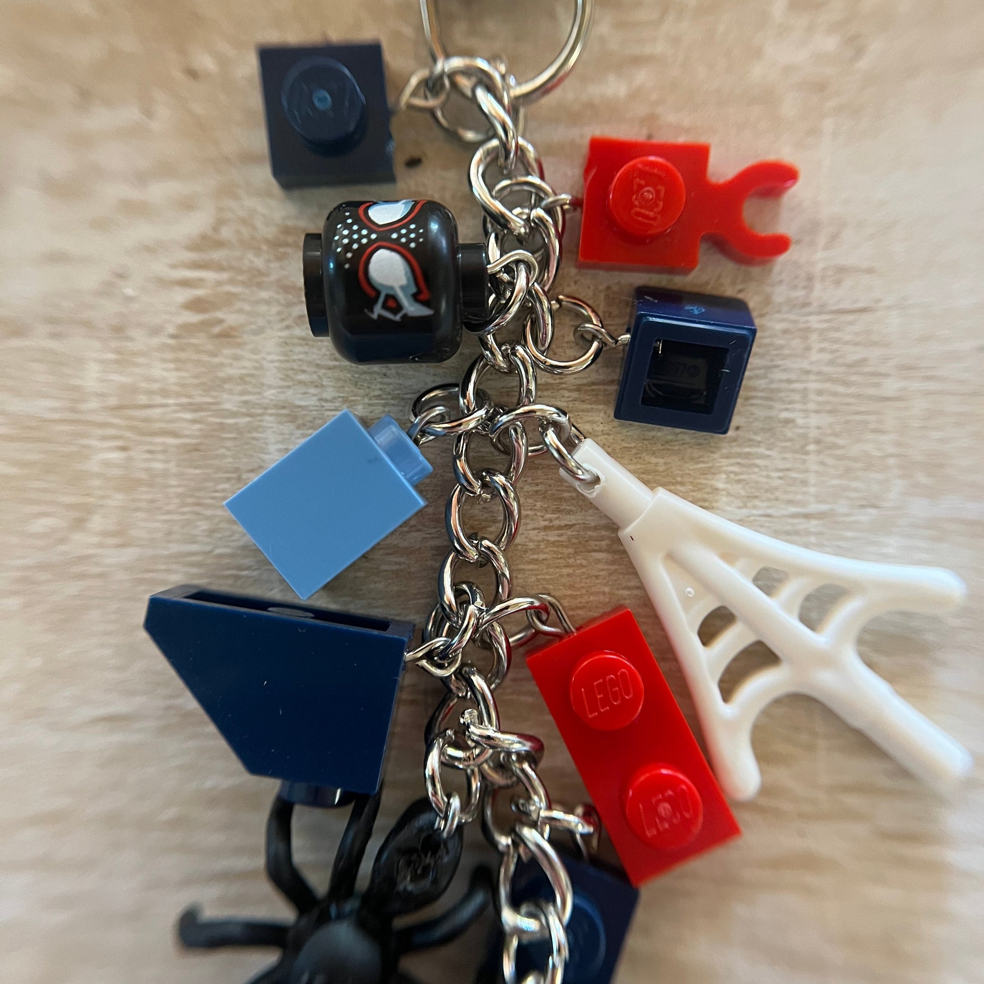 Lobster clasp keychain with Spider-Man Across the Universe, Spider-Man Miles Morales minifigure. Also includes other Lego components as charms.