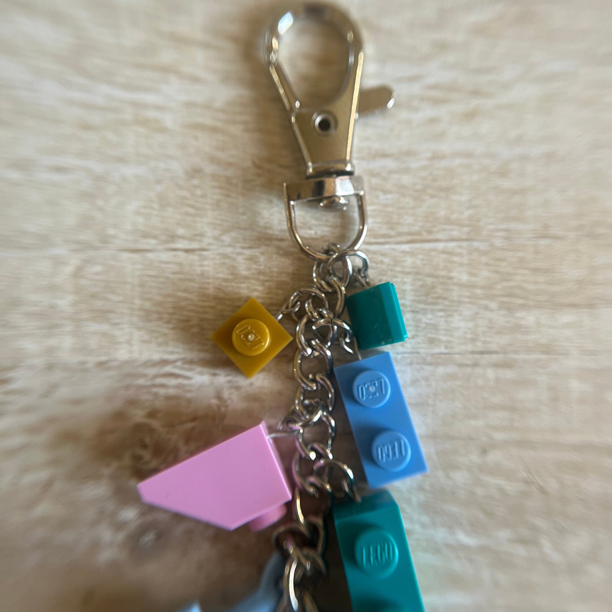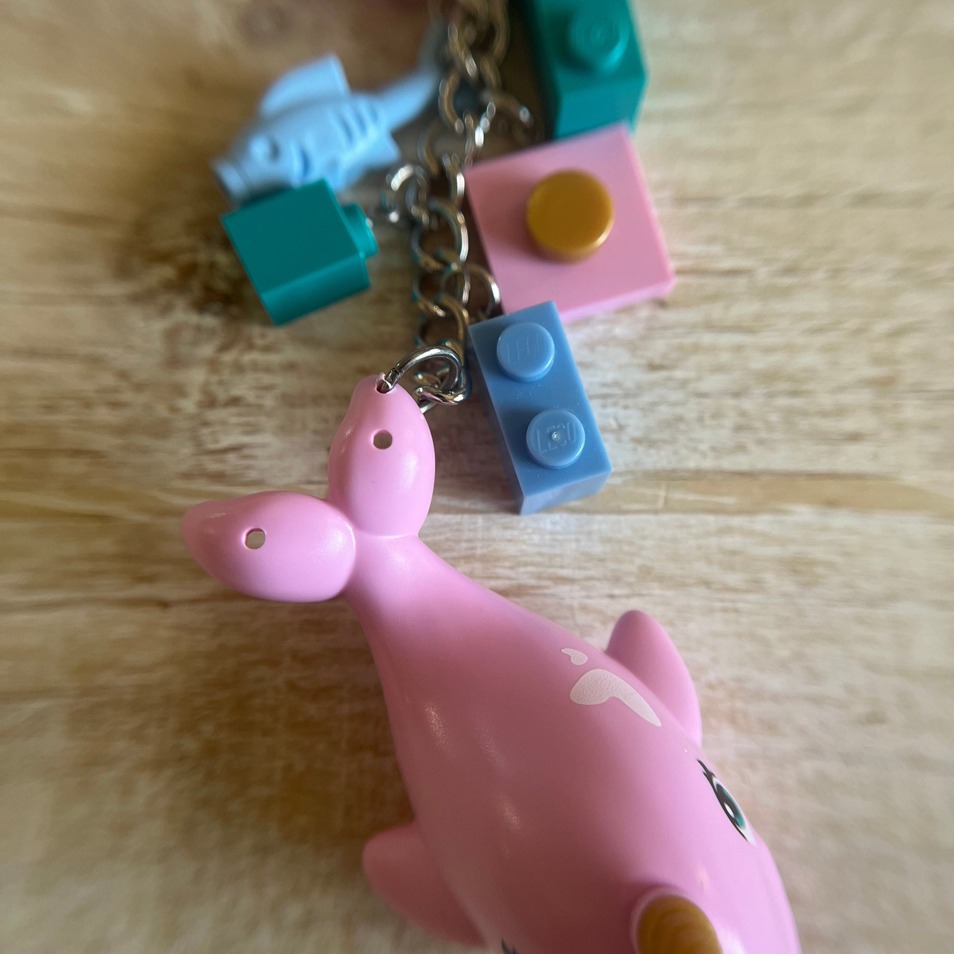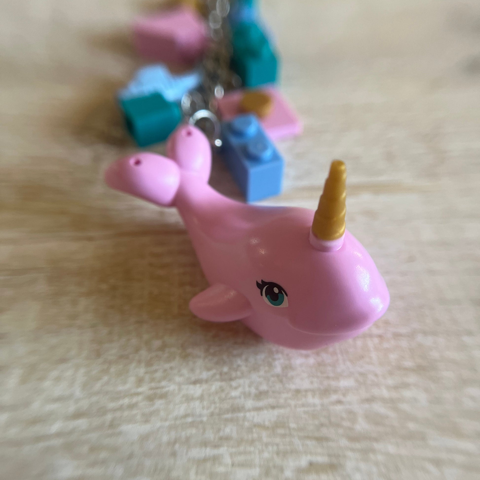 Lobster clasp keychain with a LEGO pink narwhal attached as the focal point. Additional LEGO components used as charms, including fish and other bricks. All parts of the minifigure are glued.
