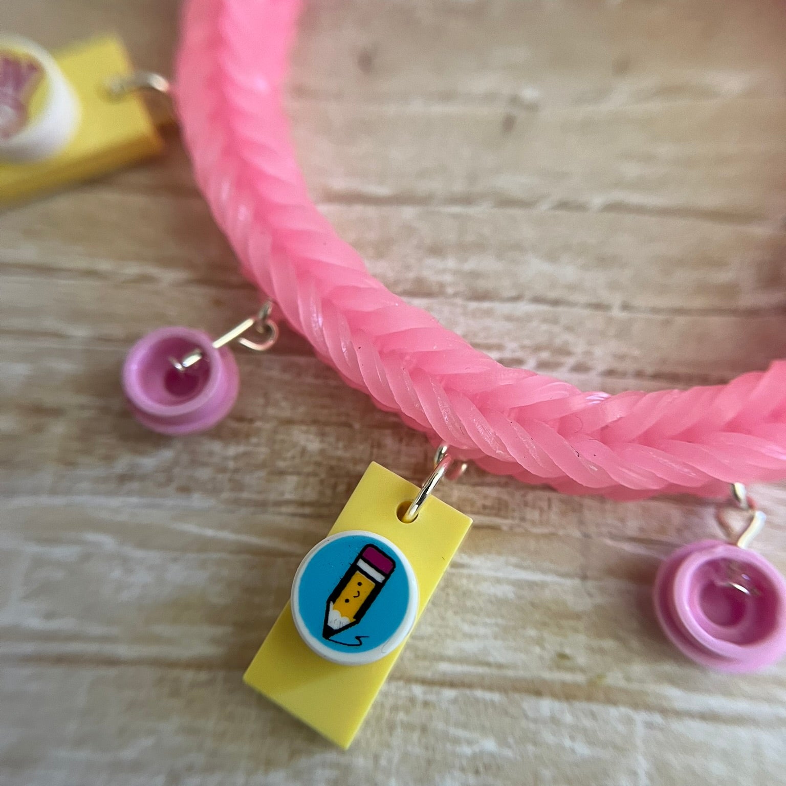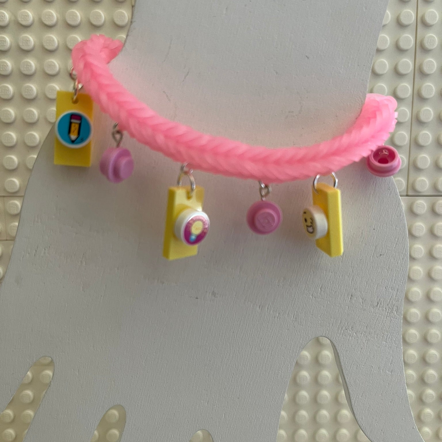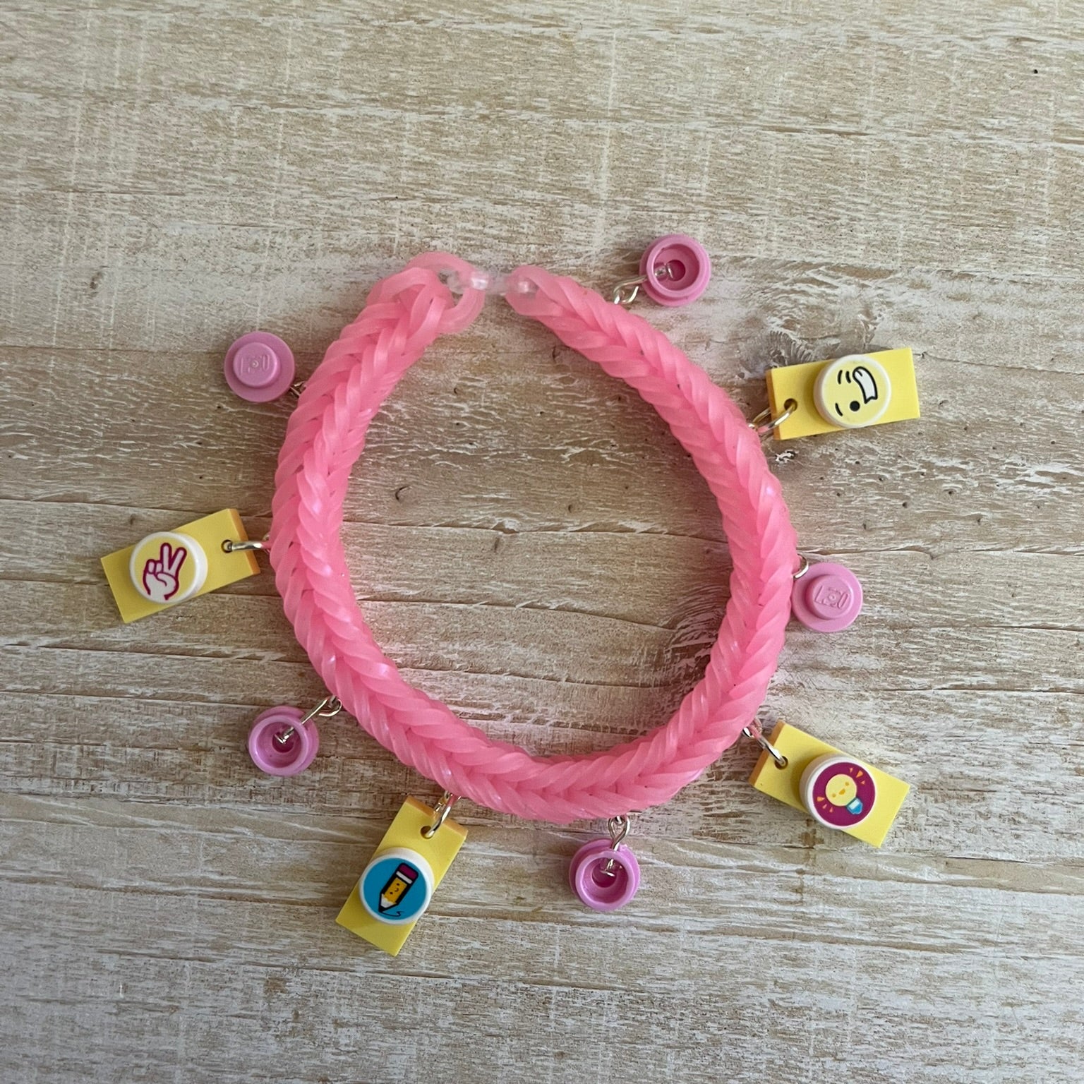 Rubber band bracelet with LEGO® bricks as charms. Fits most adults and children. The decorative LEGO® dots on the charms may differ, but colors and look will stay the same.