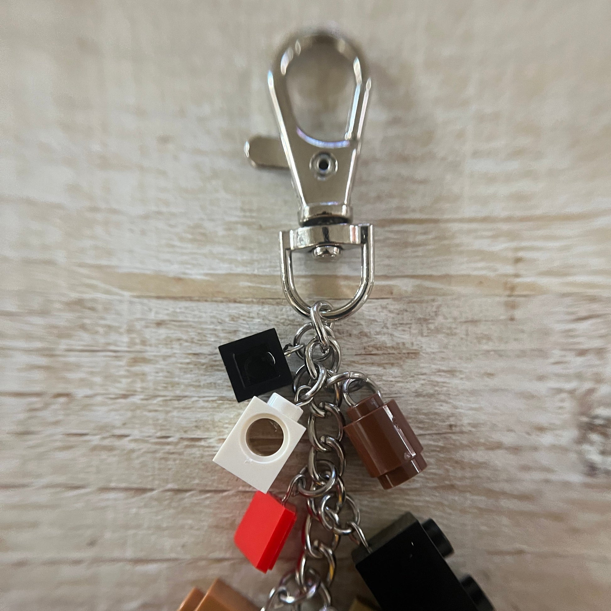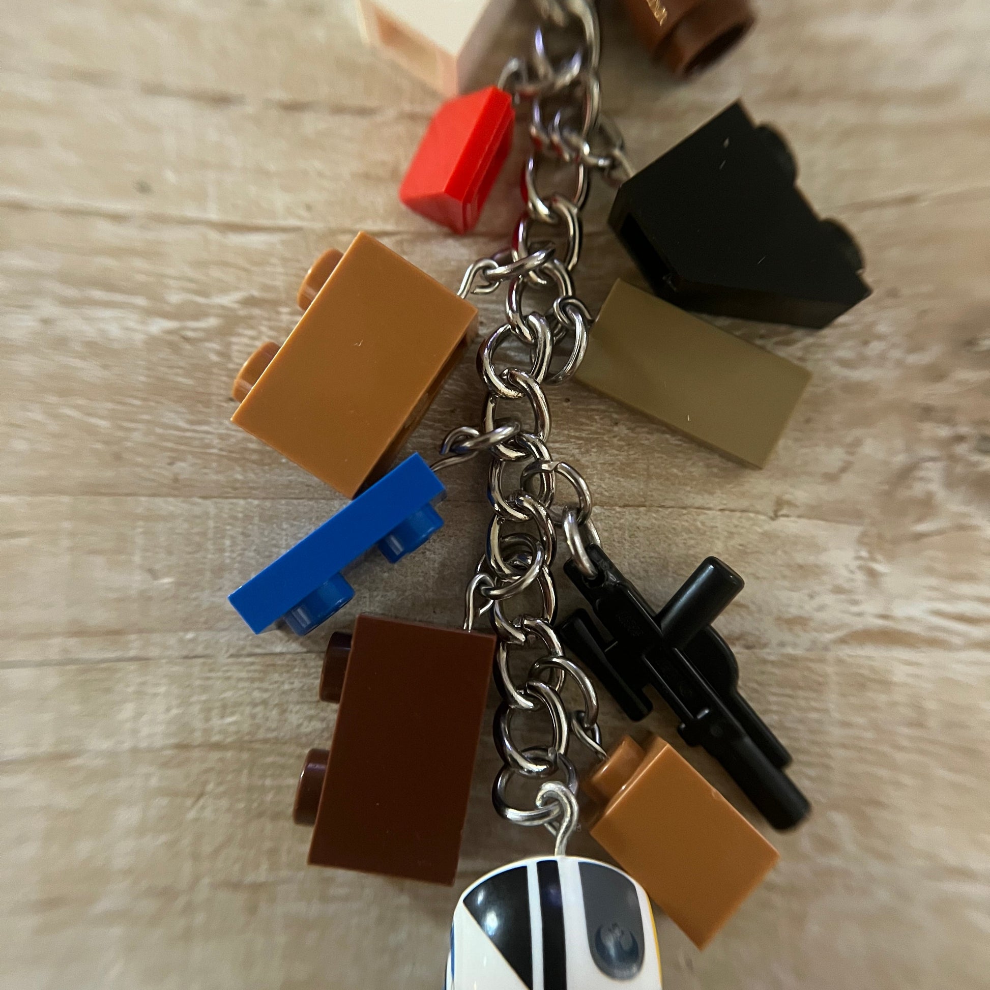 Lobster clasp keychain with a LEGO Star Wars Poe Dameron. Also includes other LEGO components as charms. All parts of the minifigure are glued.