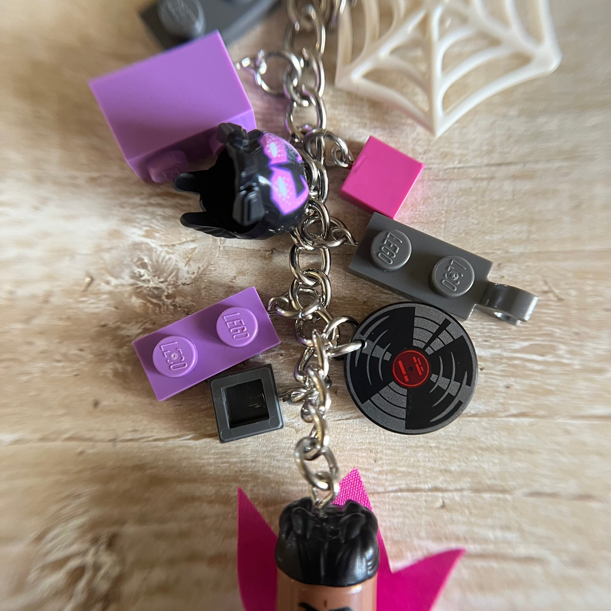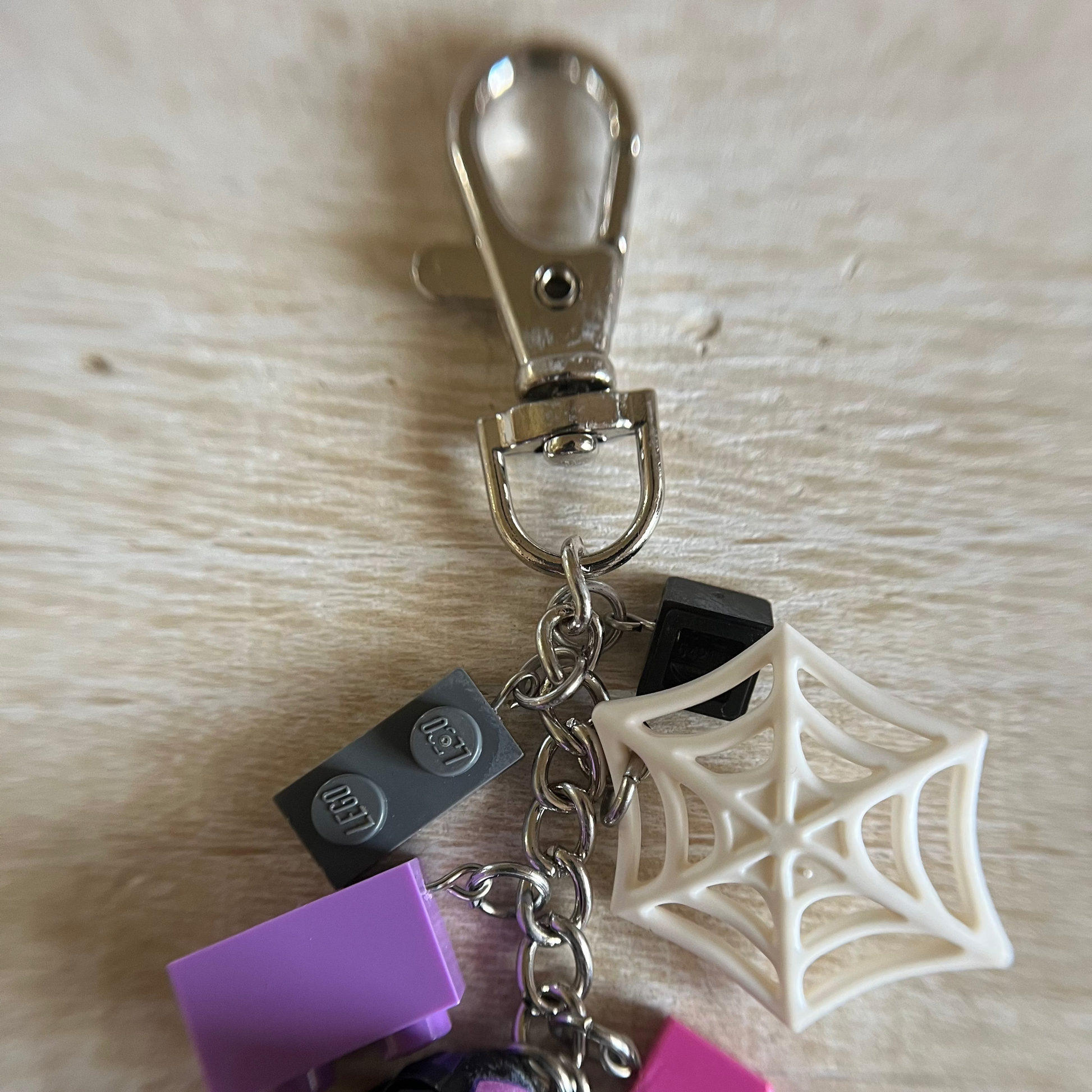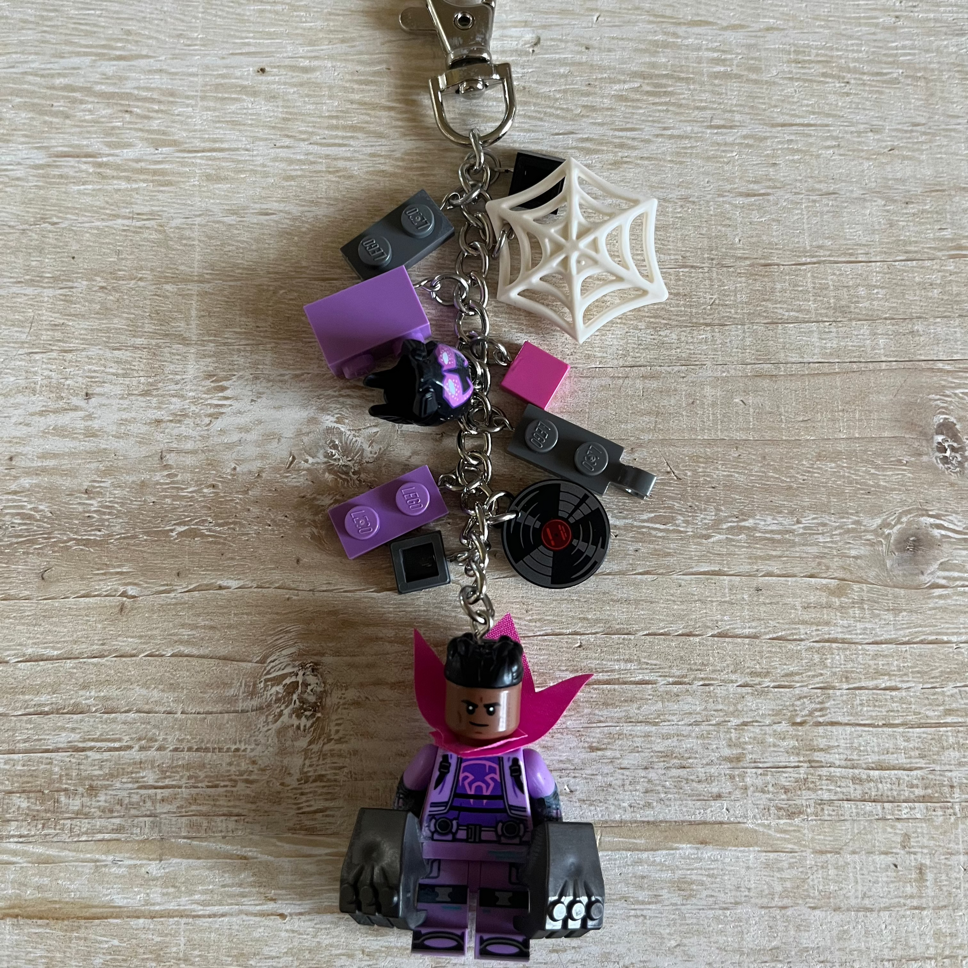 Lobster clasp keychain with Spider-Man Across the Universe, Prowler minifigure. Also includes other Lego components as charms. All parts of the minifigure are glued.