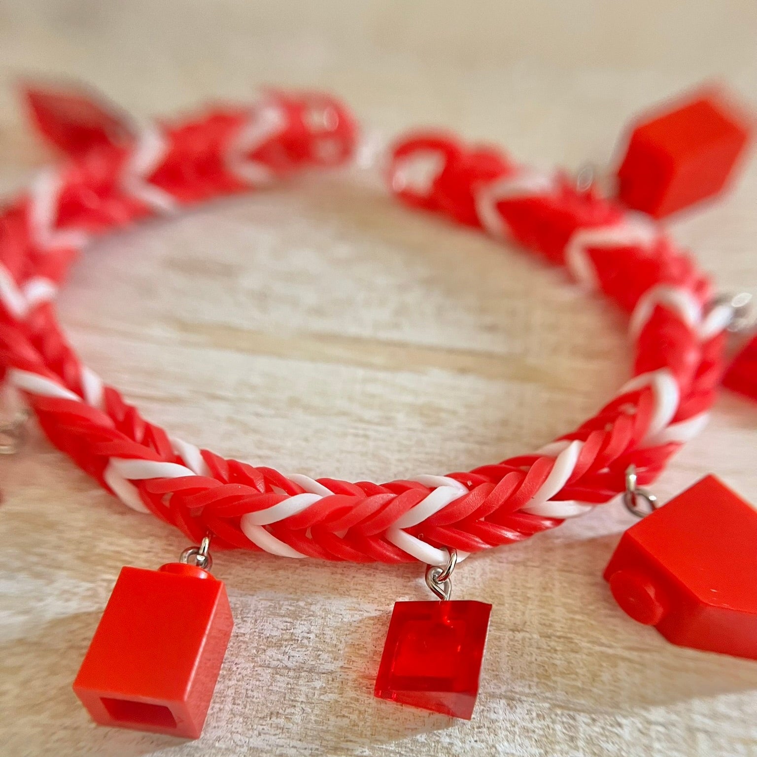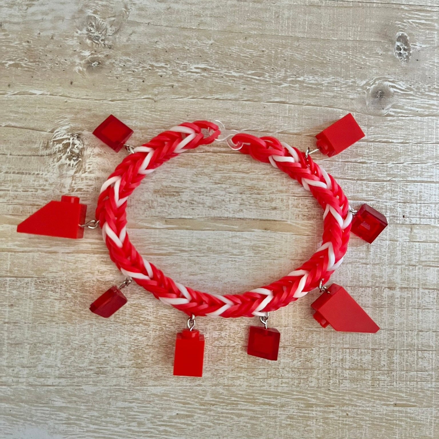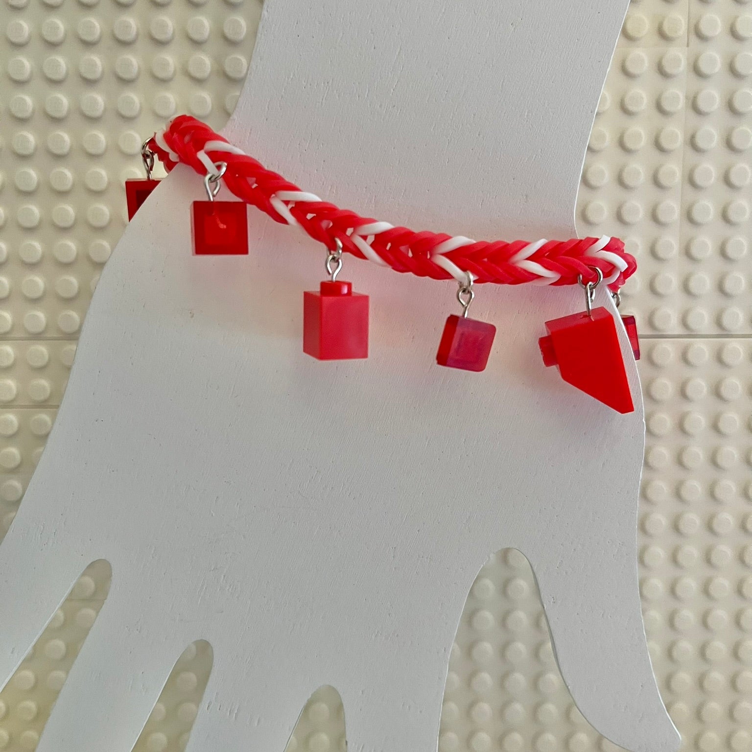 Rubber band bracelet with Lego bricks as charms. Fits most adults and children. Charms may differ slightly in shape, but colors and look will stay the same.