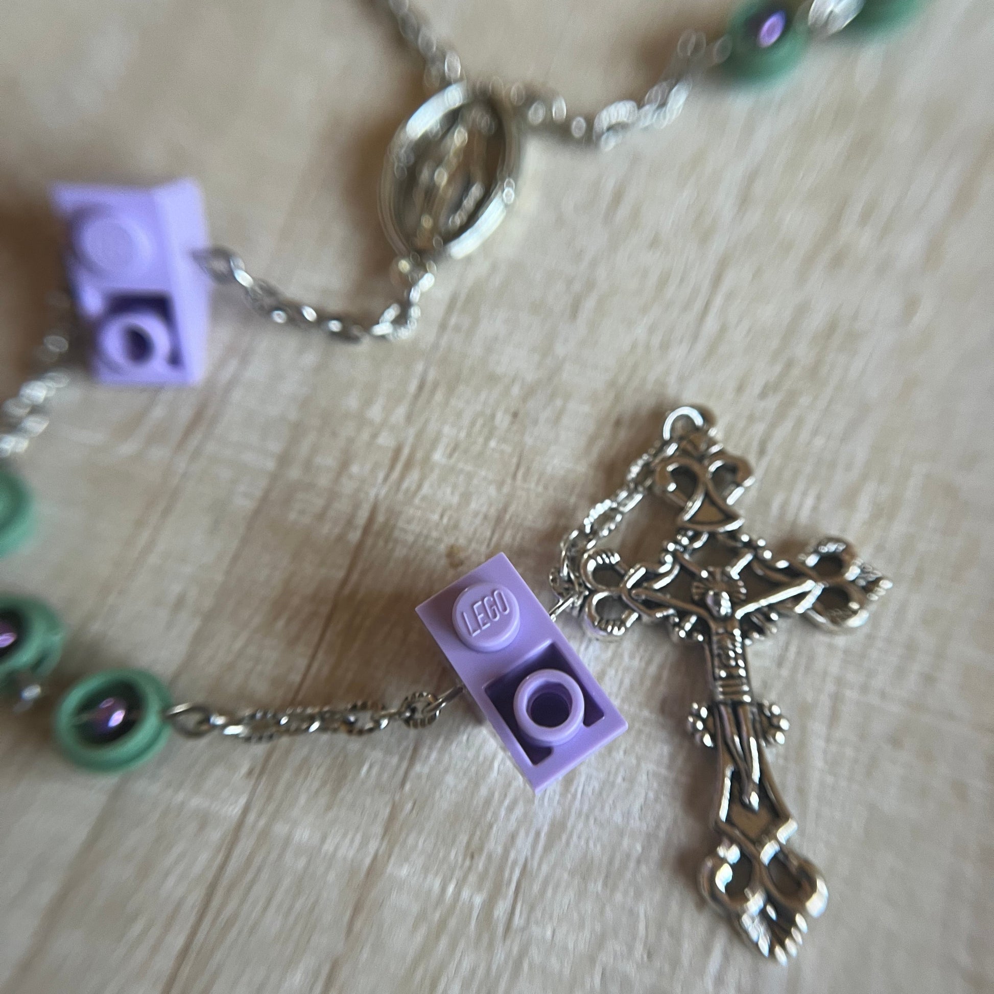 A full five-decade rosary with LEGO studs and bricks used as the beads. There is a decorative bead in the middle of each stud.