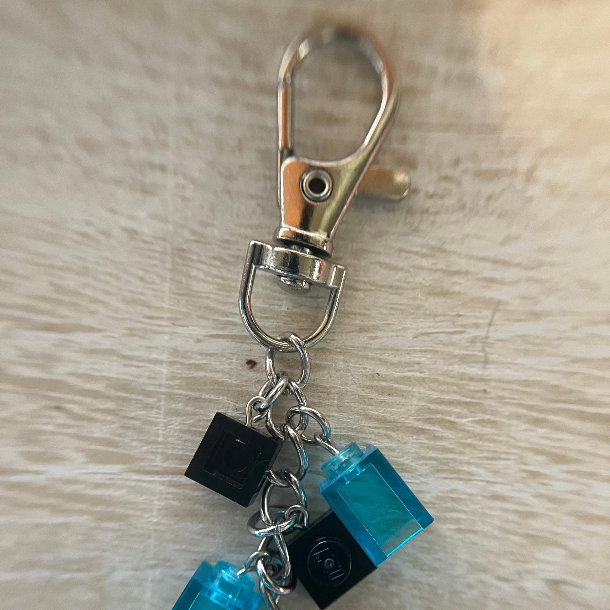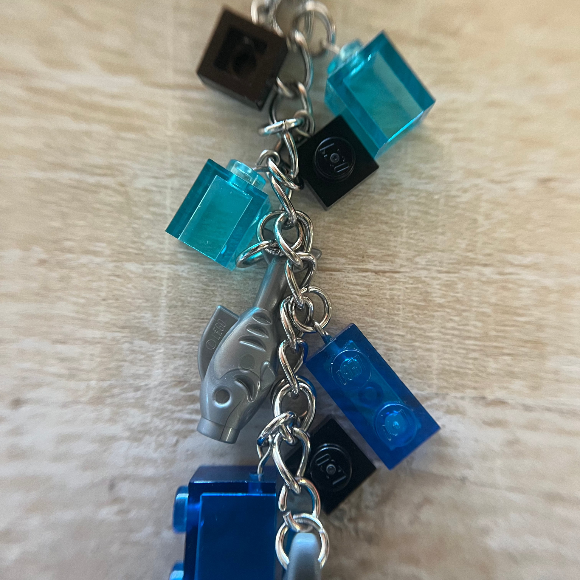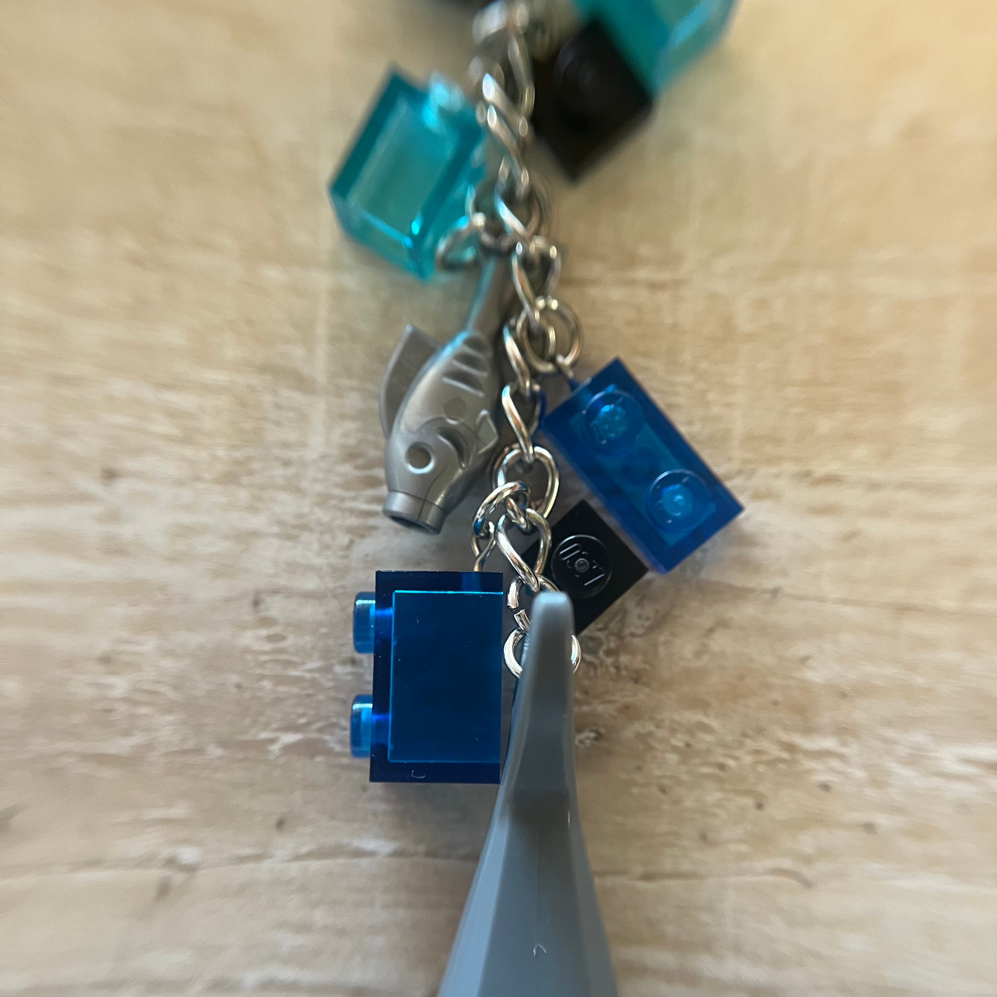 Hook keychain with LEGO components as charms. Includes a shark and fish, amongst other bricks.