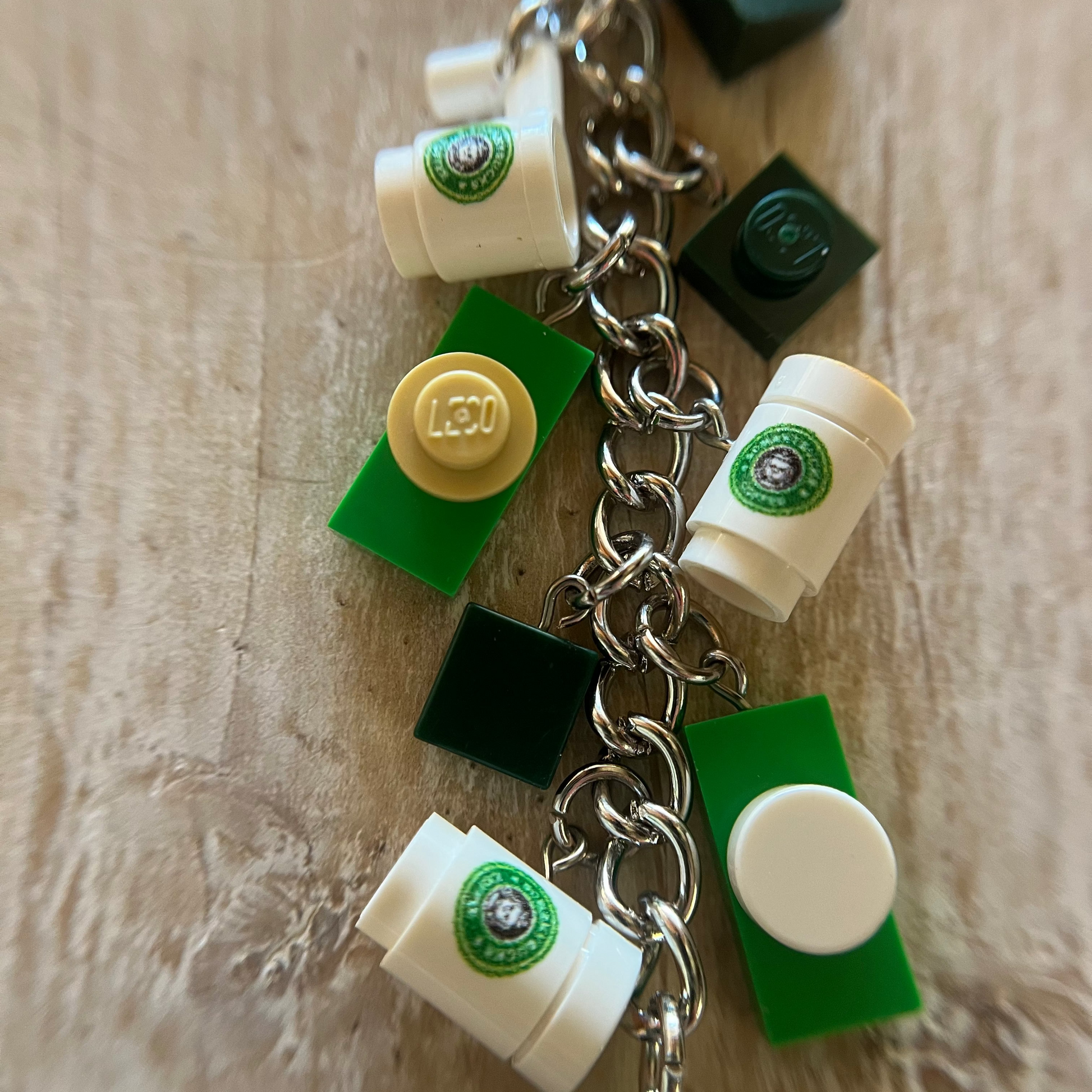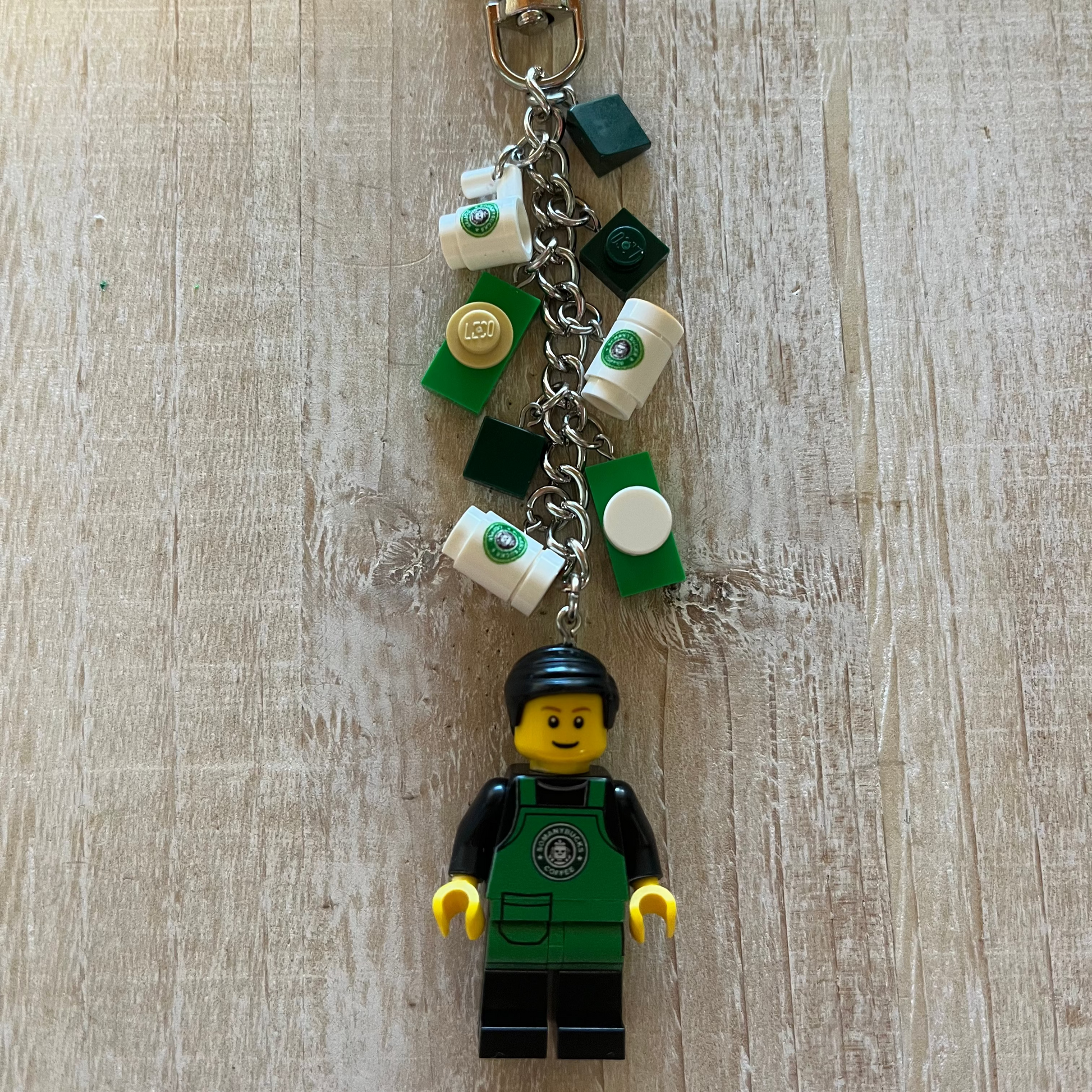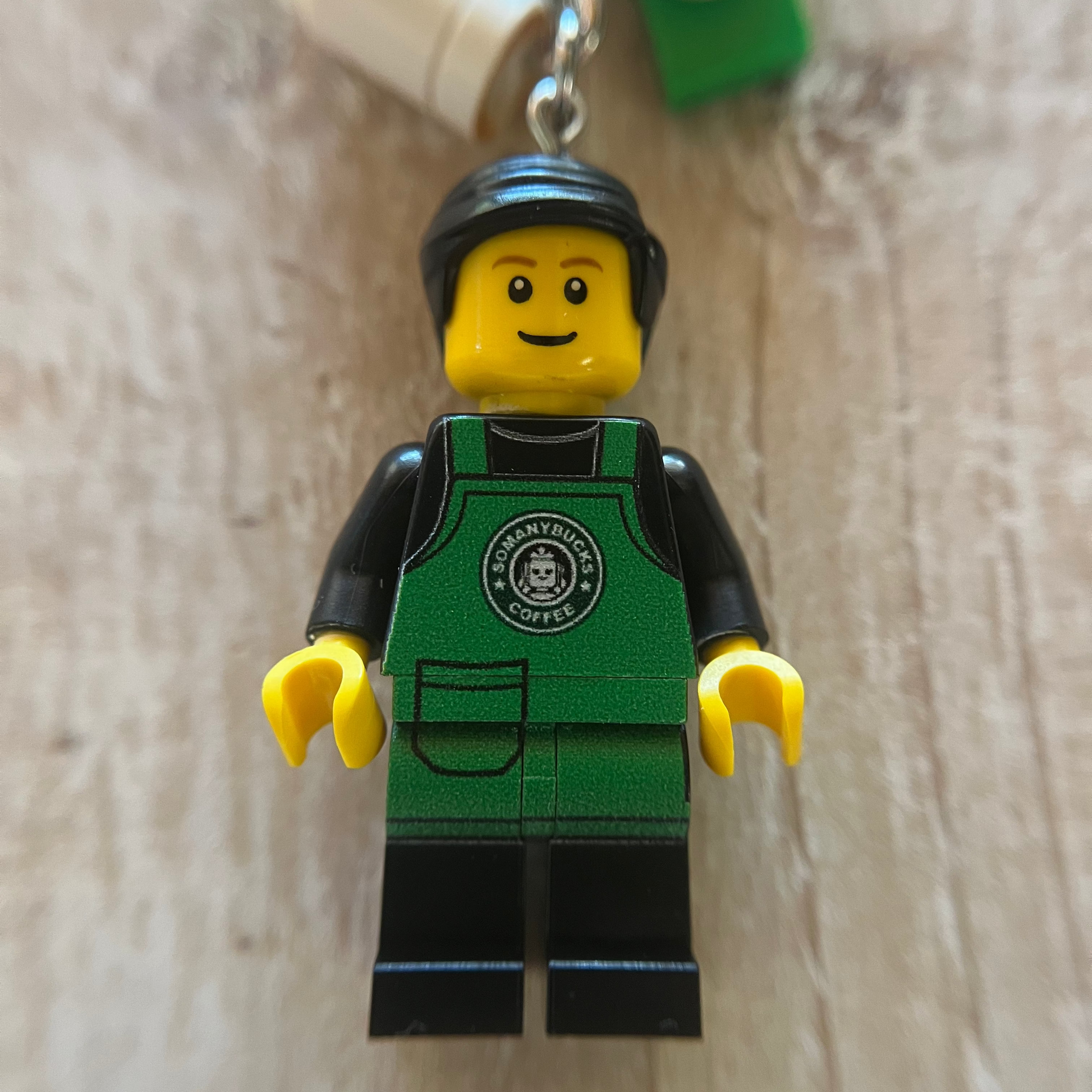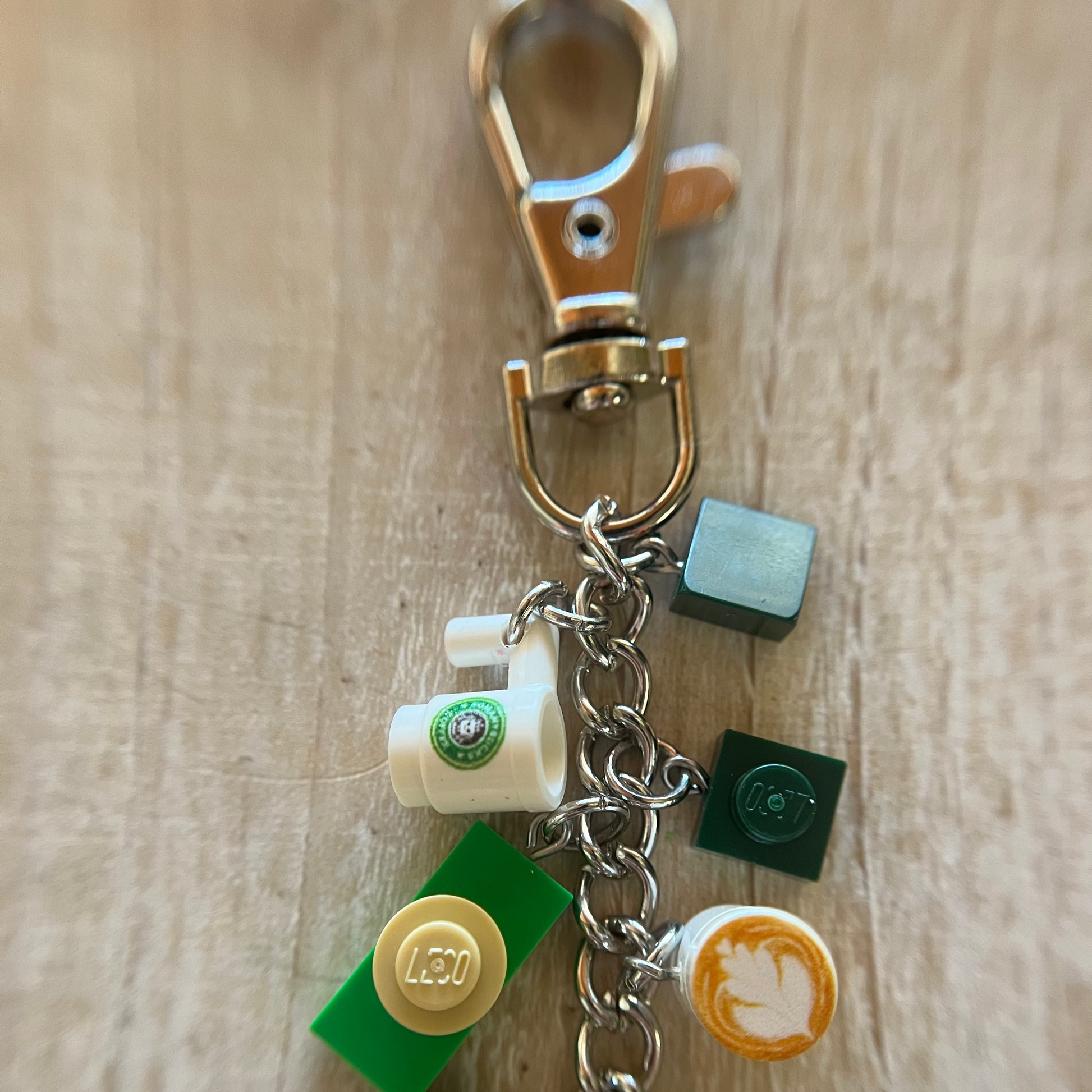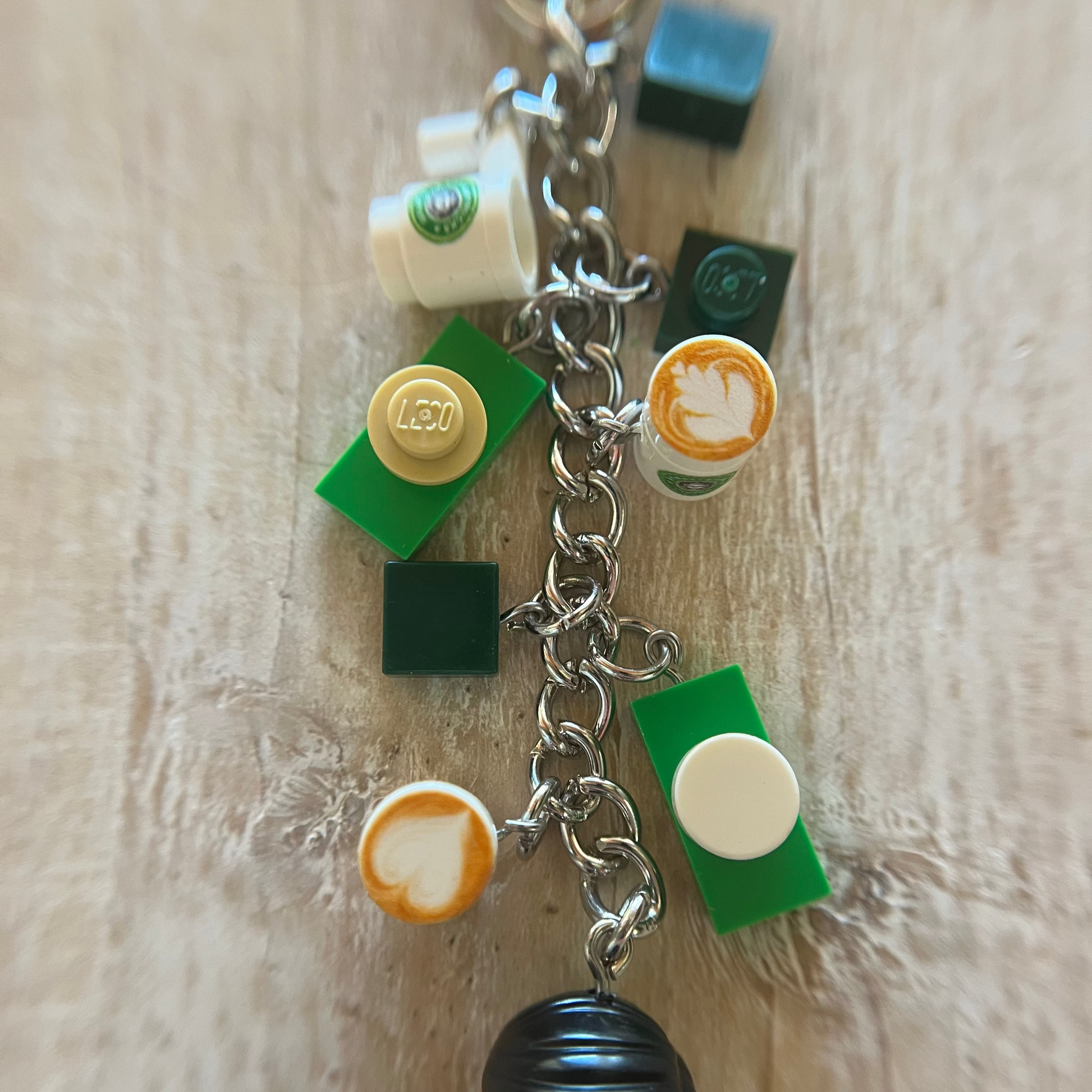 Hook charmed keychain with a custom minifigure and custom coffee mugs, with LEGO components as charms.