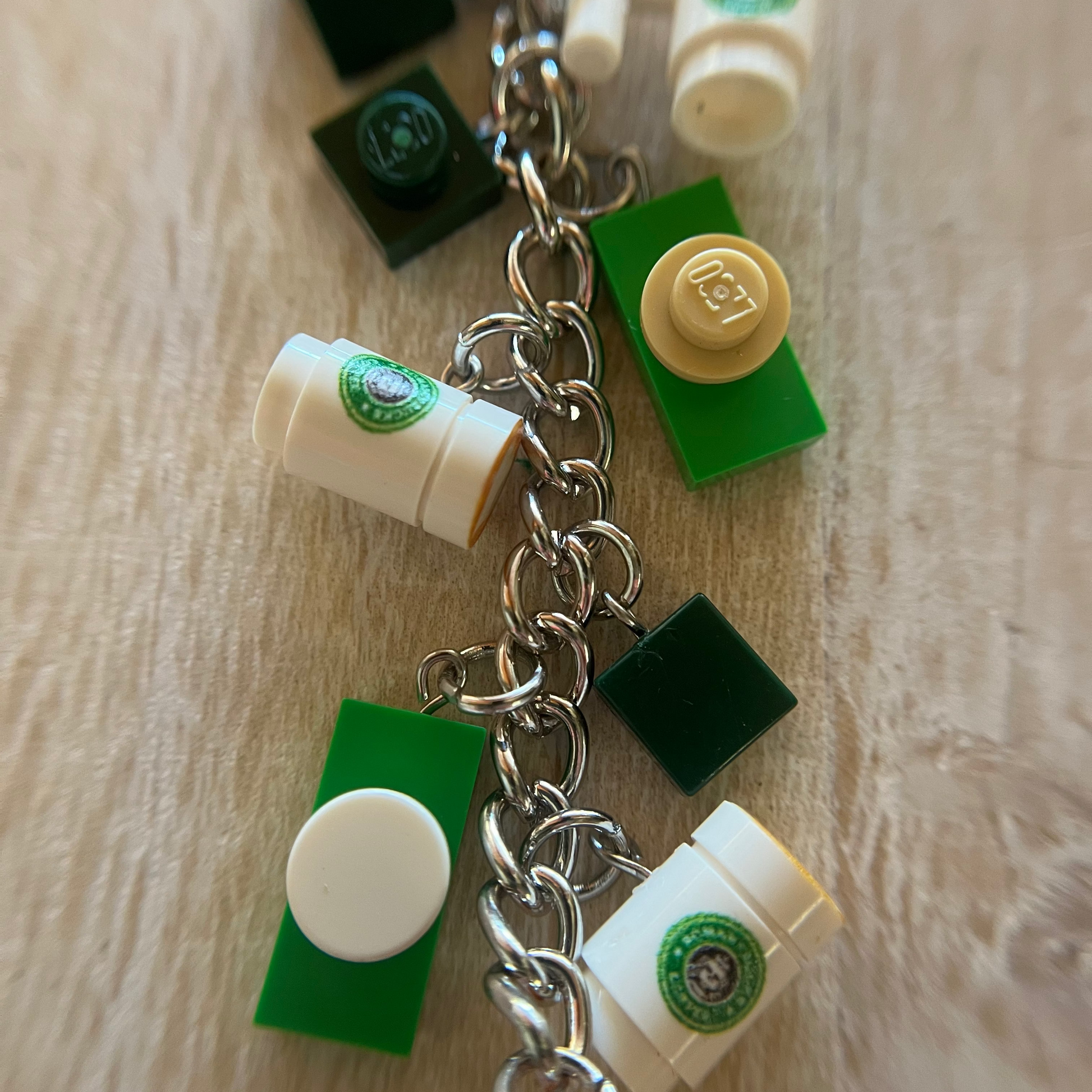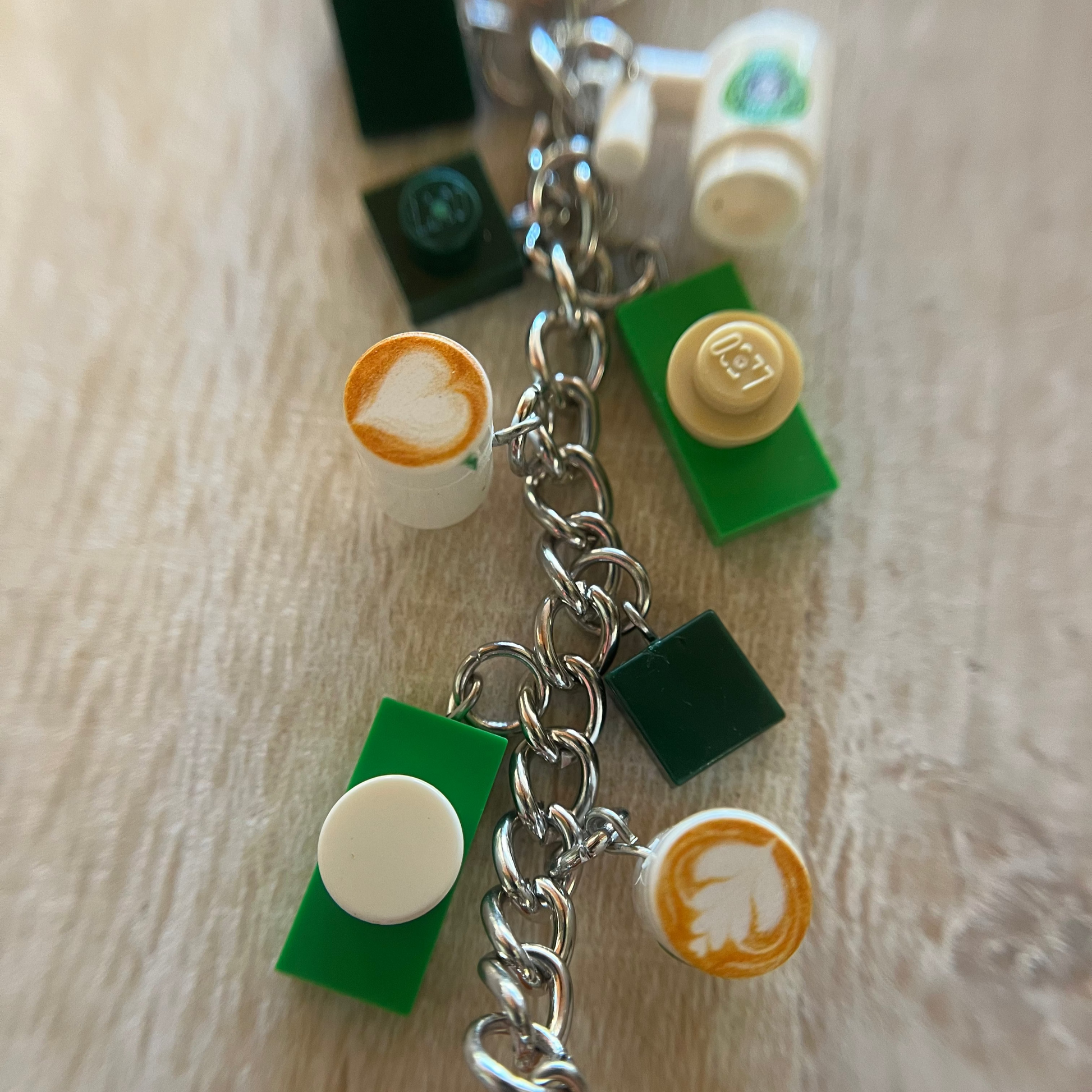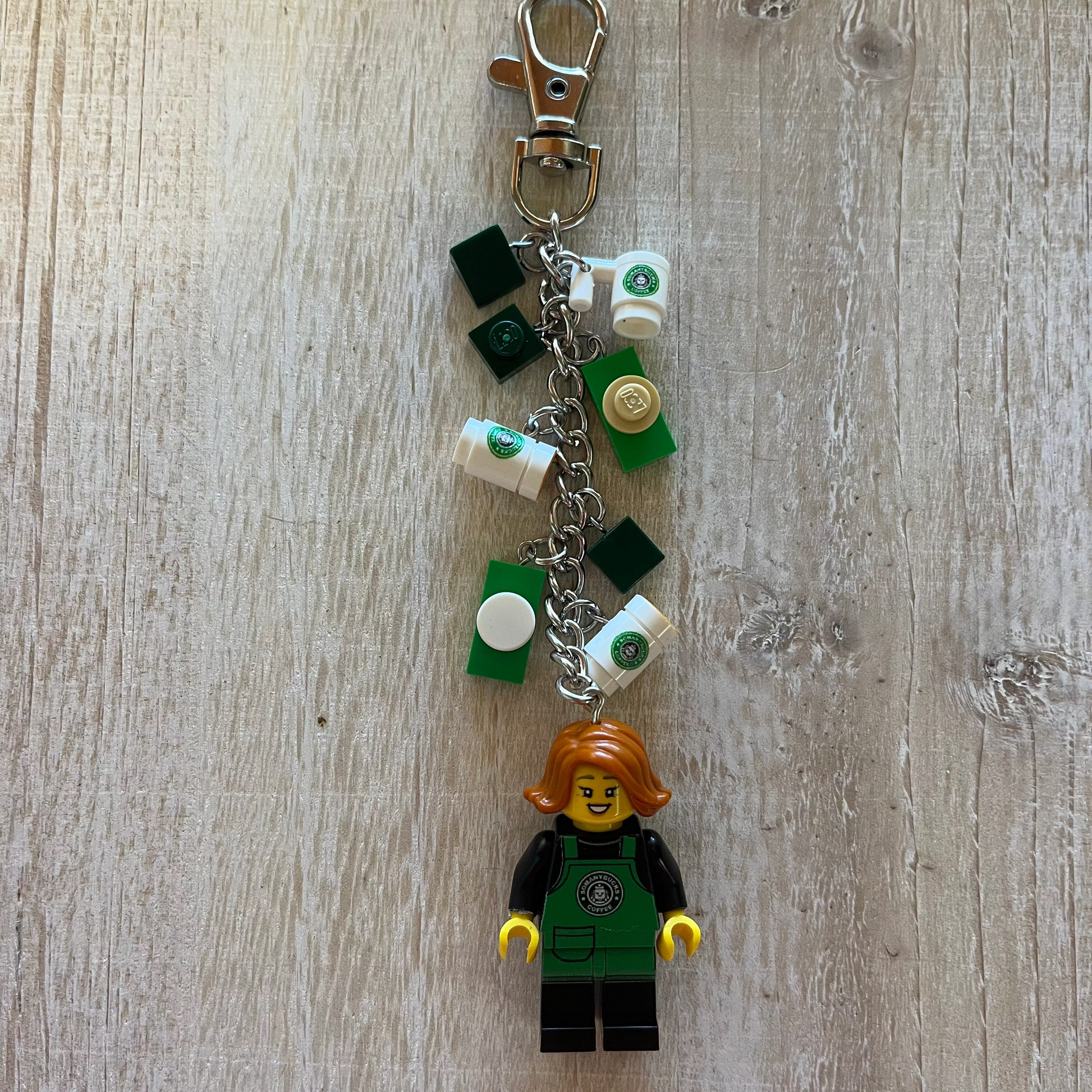Hook charmed keychain with a custom minifigure and custom coffee mugs, with LEGO components as charms.