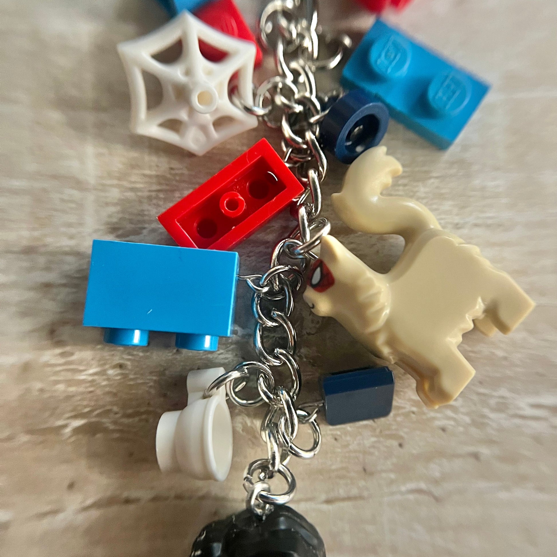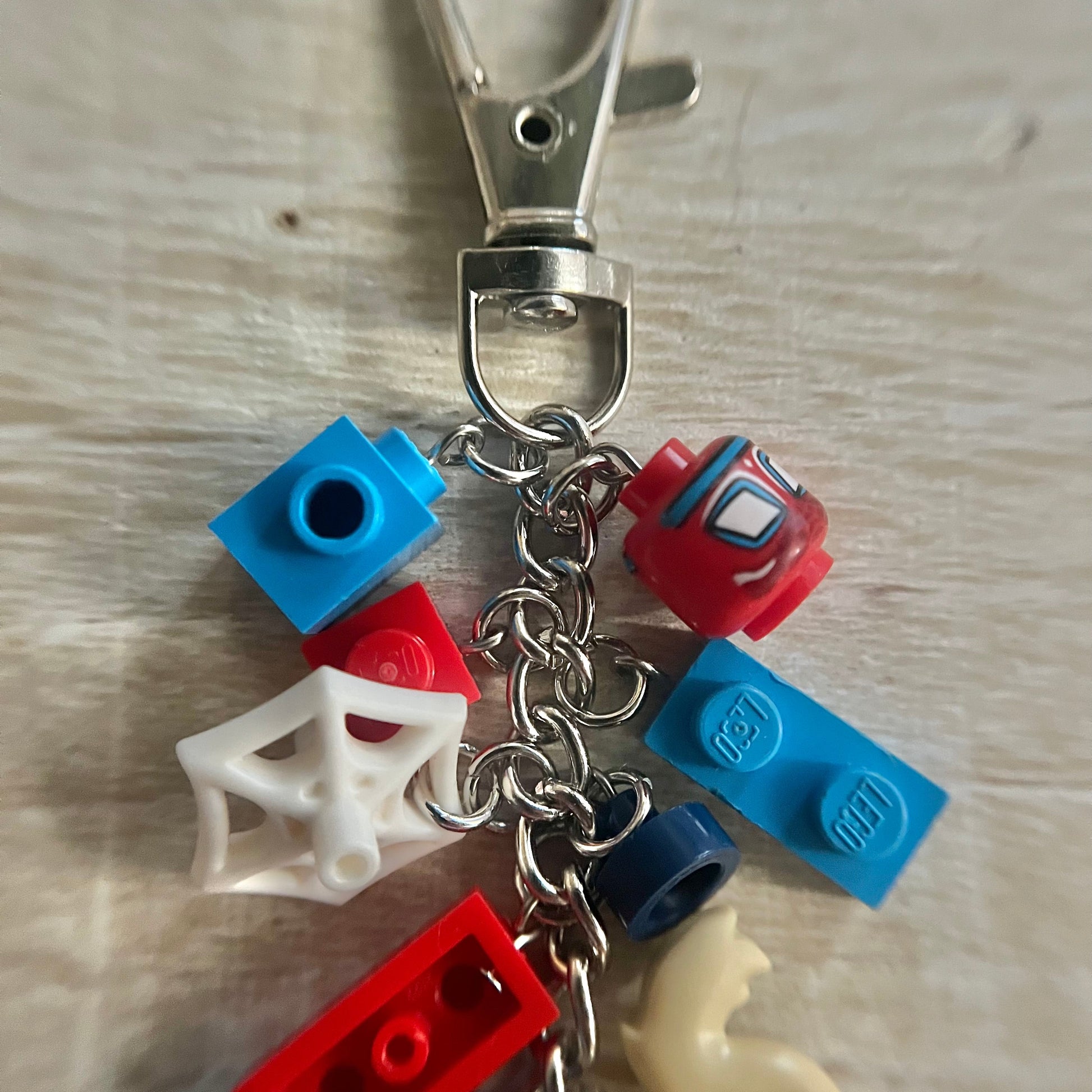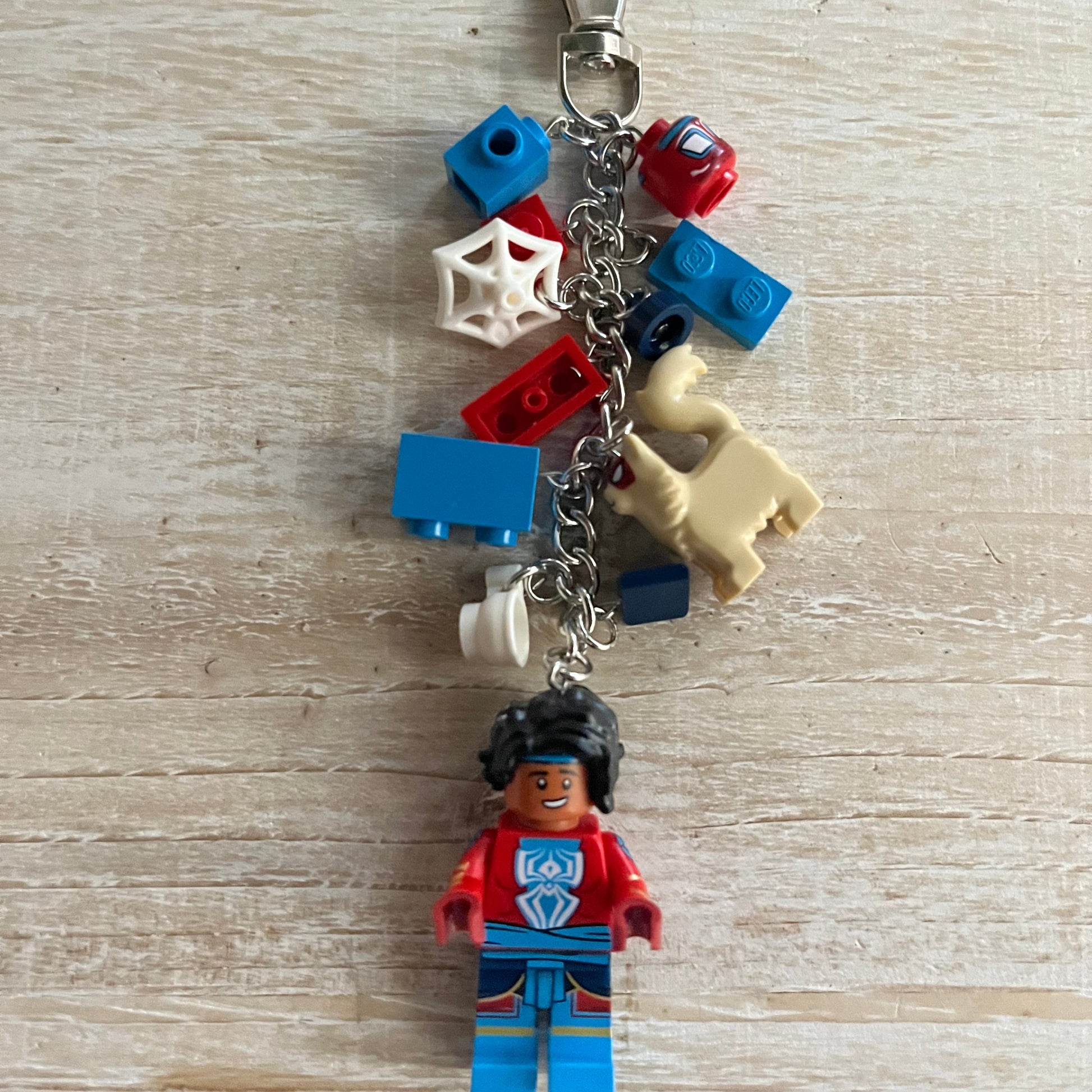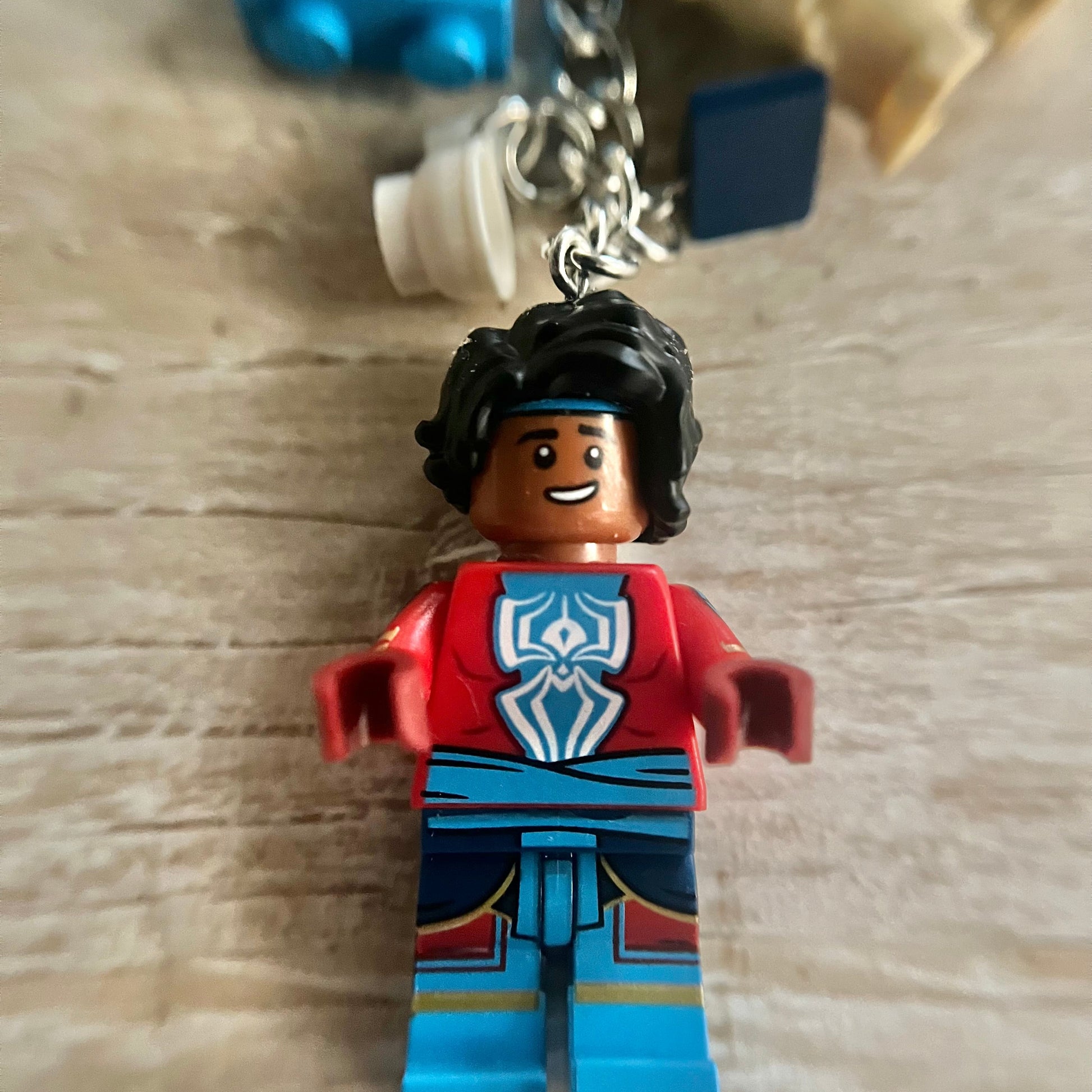 Lobster clasp keychain with Spider-Man Across the Universe, Spider-Man India minifigure. Also includes other Lego components as charms.