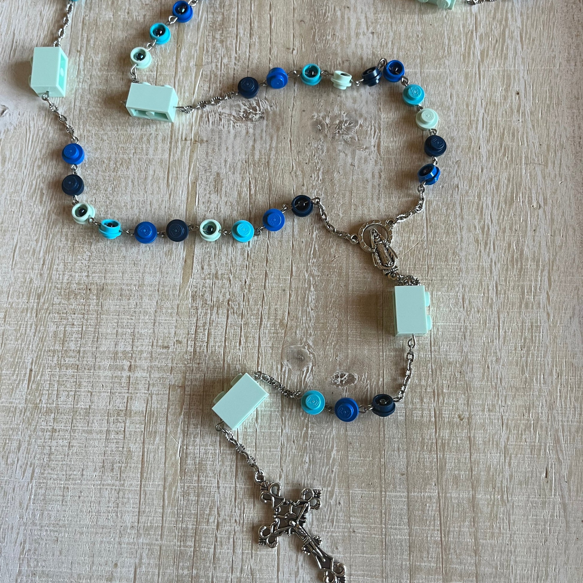A full five-decade rosary with LEGO studs and bricks used as the beads. There is a decorative bead in the middle of each stud.