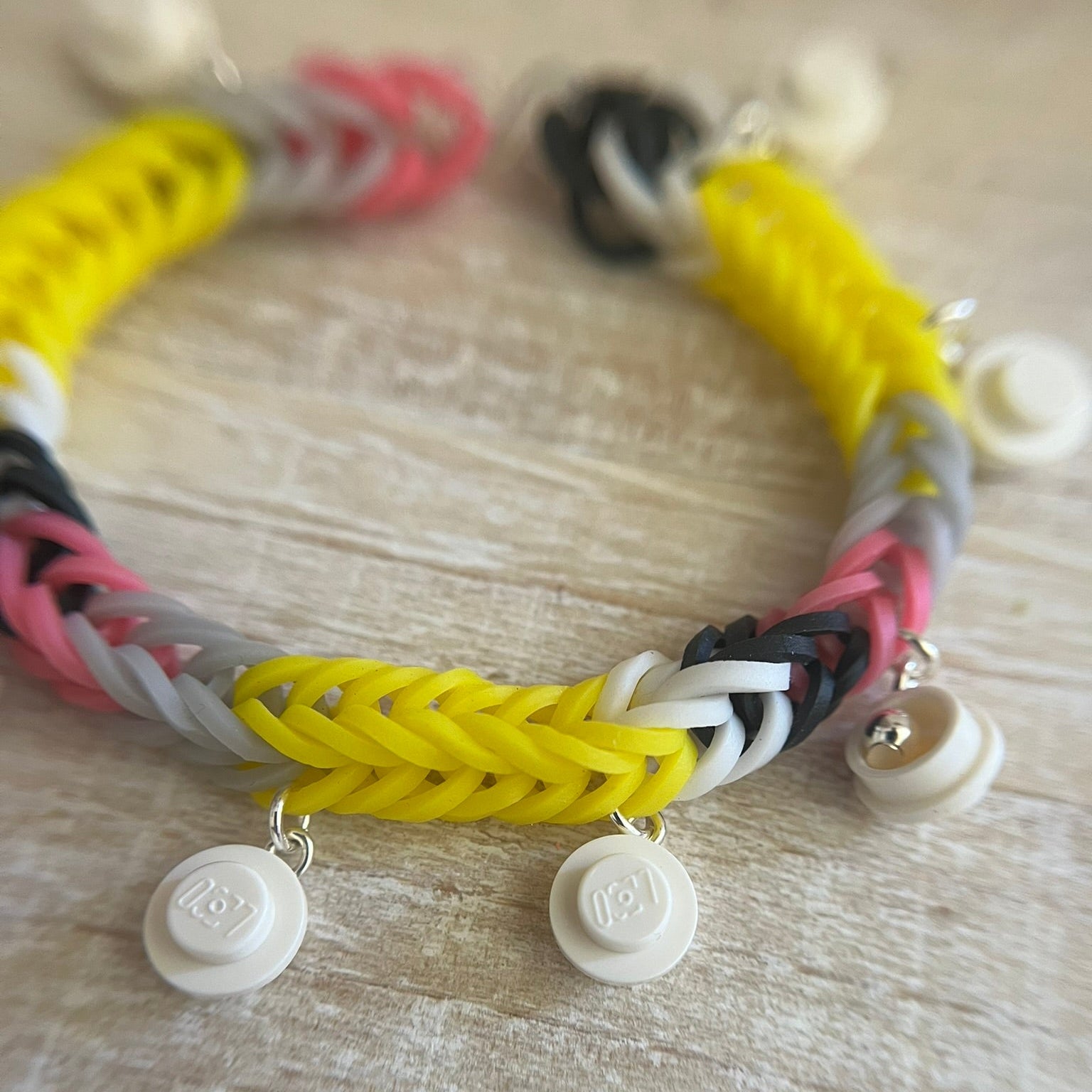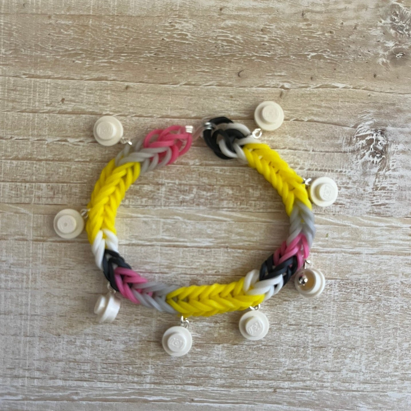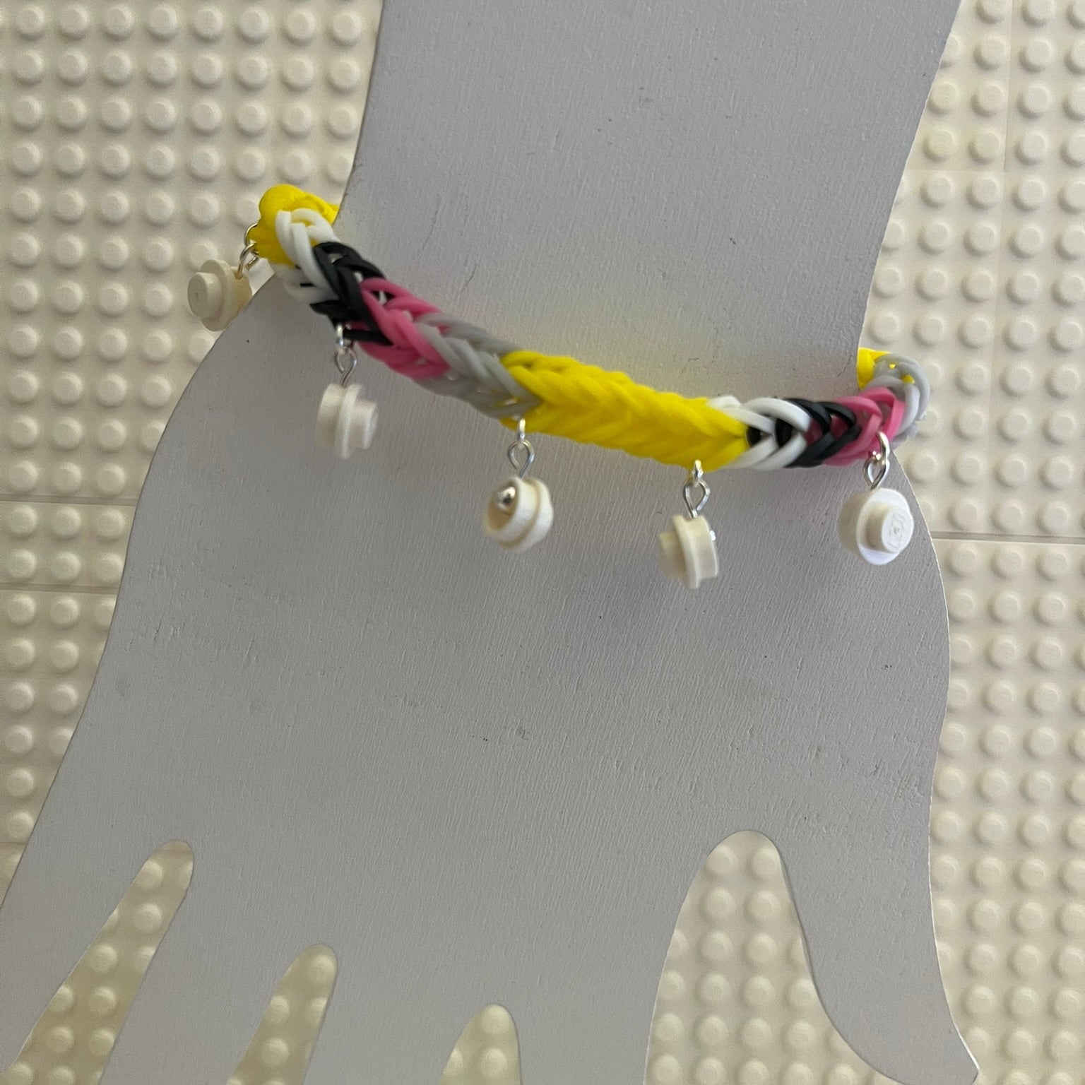 Rubber band bracelet with LEGO® bricks as charms. Fits most adults and children. The decorative Lego dots on the charms may differ, but colors and look will stay the same.
